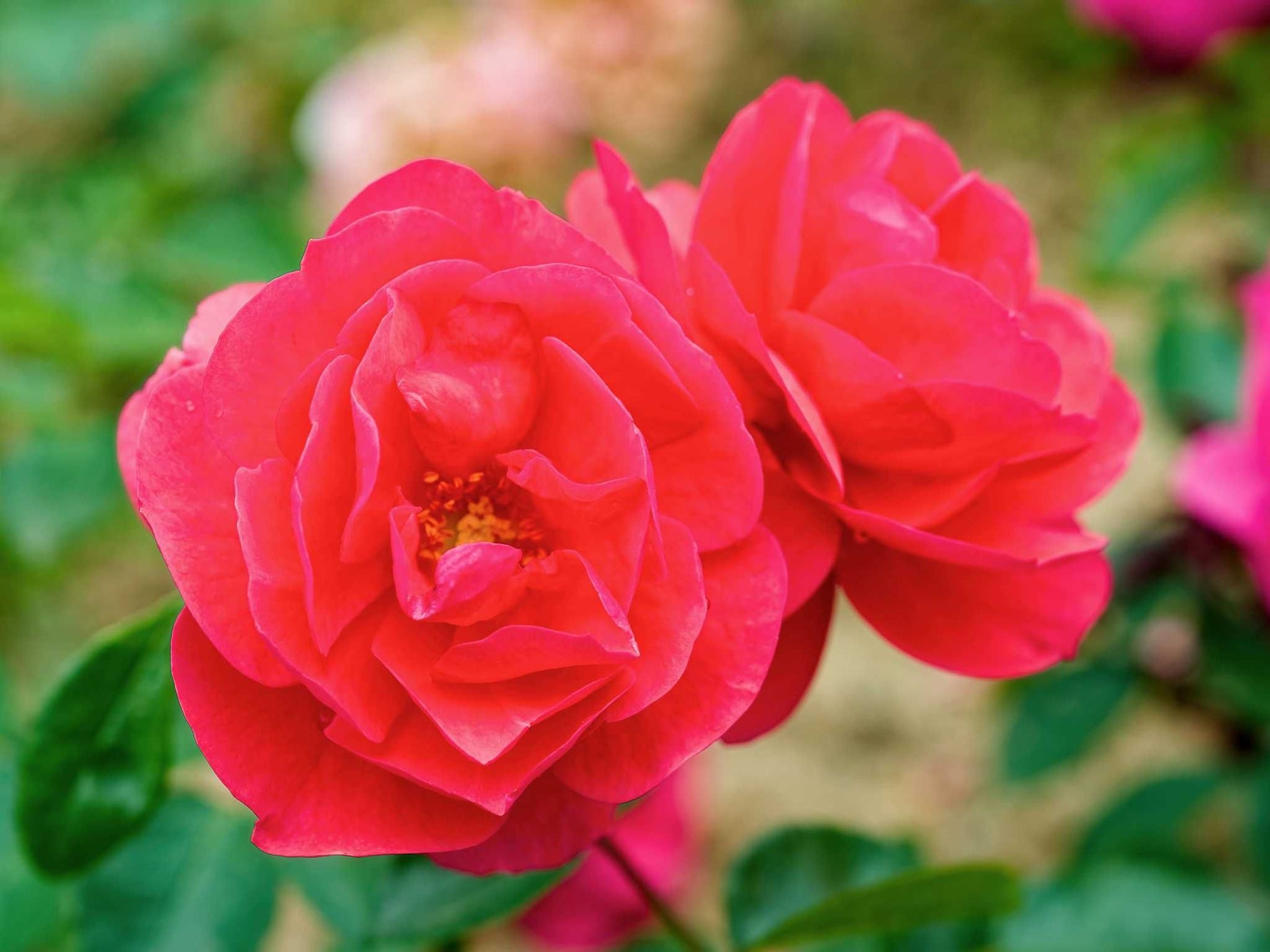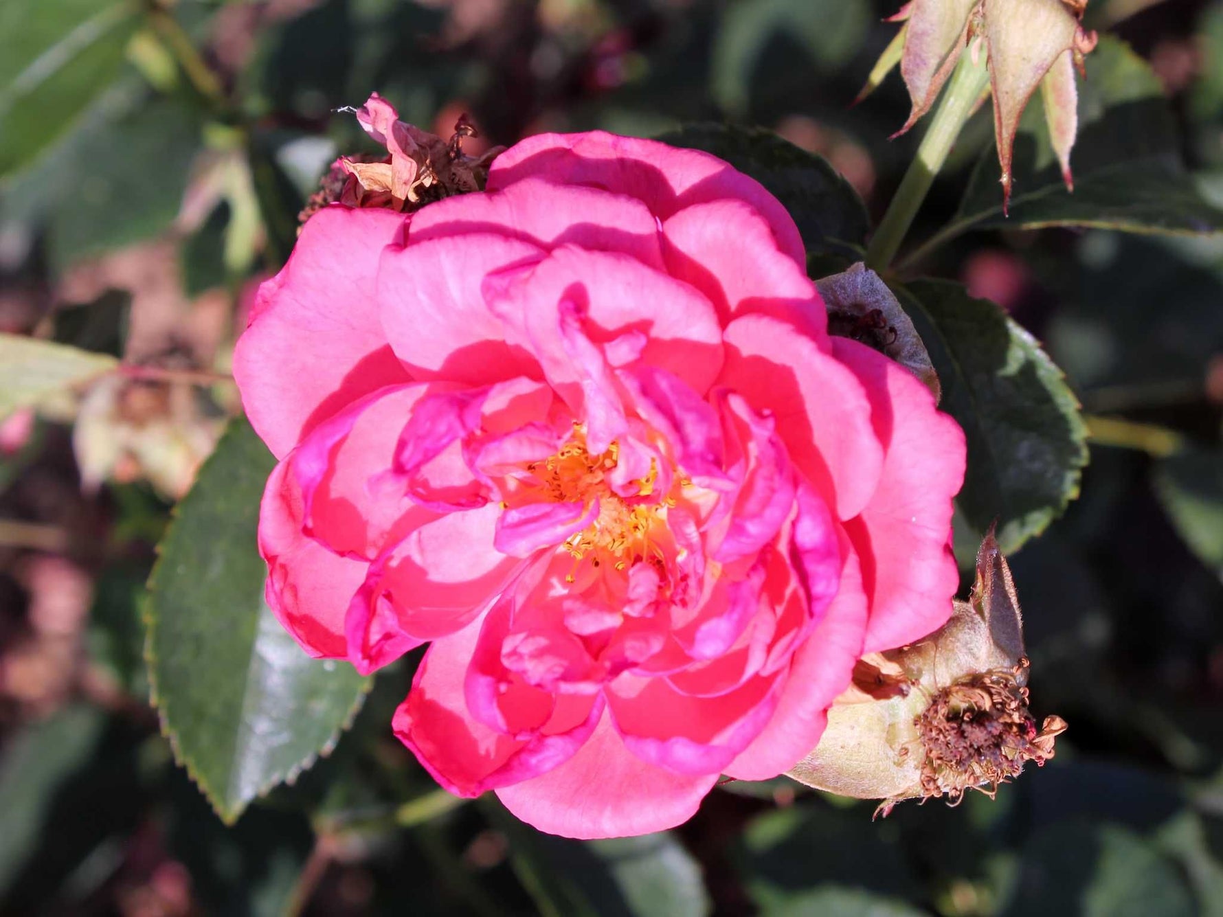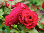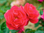 Die halb gefüllten Blüten in himbeerrot blühen in Dolden und duften leicht. Buschiger Wuchs bis 80 cm Höhe. Robuste Beetrose. Kübelgeeignet.