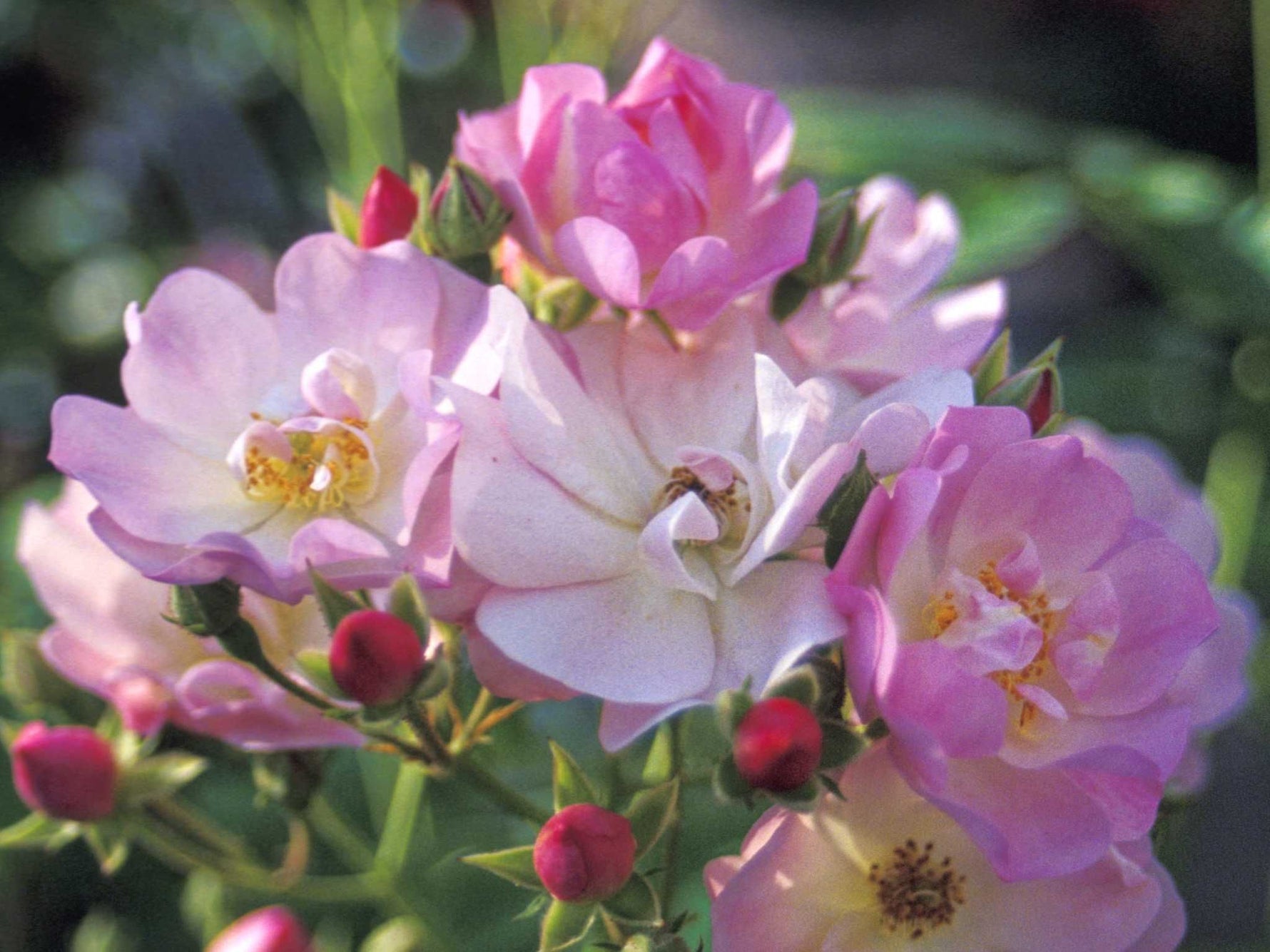 Wirklich fast wie Apfelblüten schmiegen sich die kleinen rosa-weißen Blütendolden an die langen Peitschentriebe an. Im Herbst werden daraus Dolden mit Massen an kleinen Hagebutten. Eine typische Ramblerrose mit starkem Wuchs und vielen Langtrieben. Das Laub ist üppig und hellgrün und macht eine schöne Herbstfärbung. Die Triebe sind gut bestachelt, der Wuchs ist mittelstark, die Sorte ist einmalblühend. Meinungen der Experten sind unterschiedlich, aber unsere Rose ist identisch mit Blush Rambler.