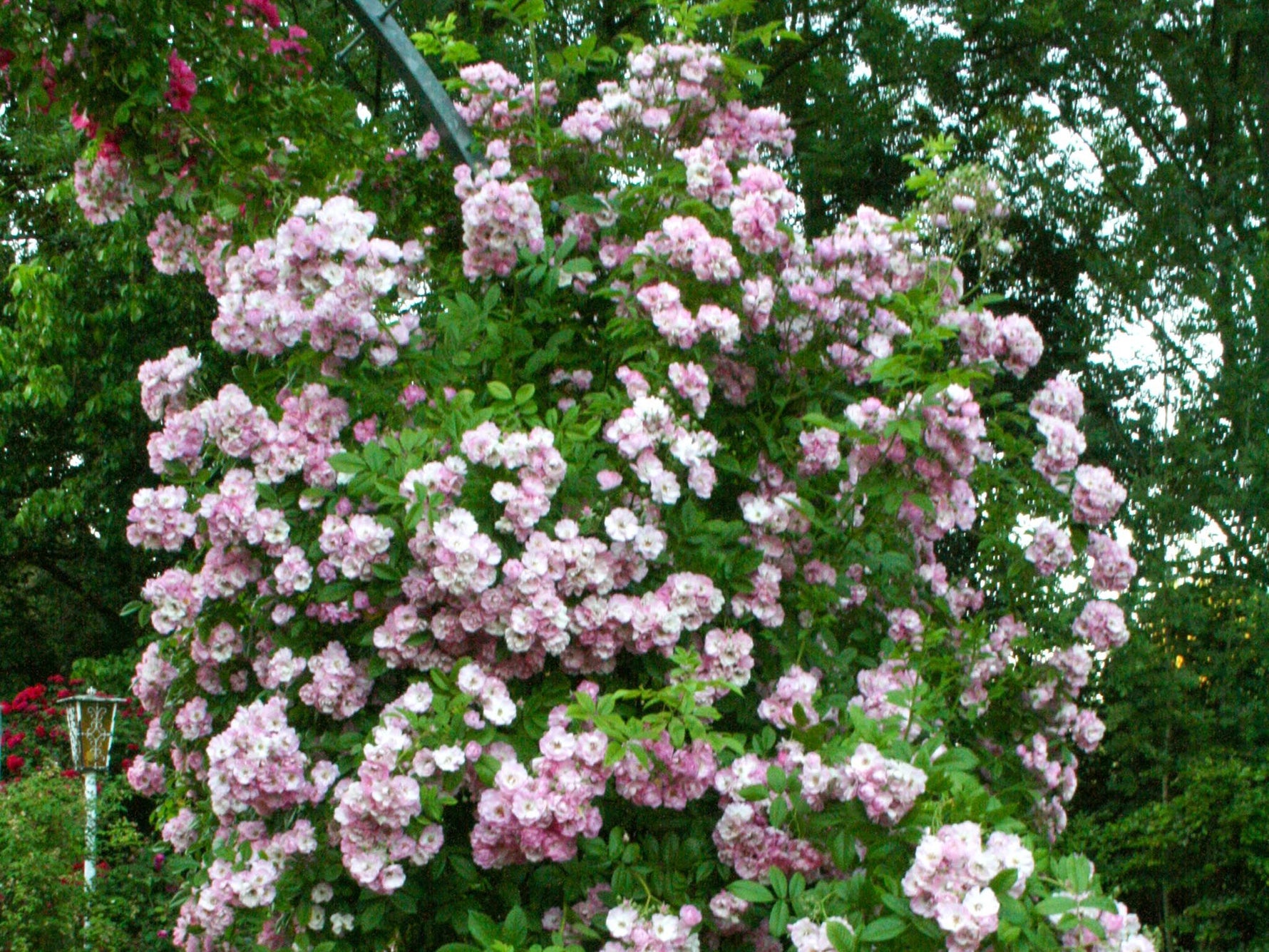 Die kleinen halb gefüllten, Blüten in hellrosa duften zart und bilden große Dolden. Einmalblühend. Kräftiger, buschiger Wuchs bis 400 cm. Robuste Ramblerrose. Bildet kleine Hagebutten, zum Beranken von Bäumen, Insektenmagnet