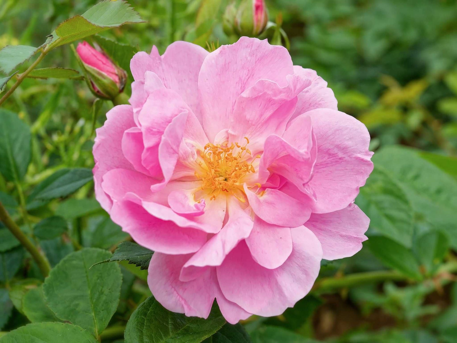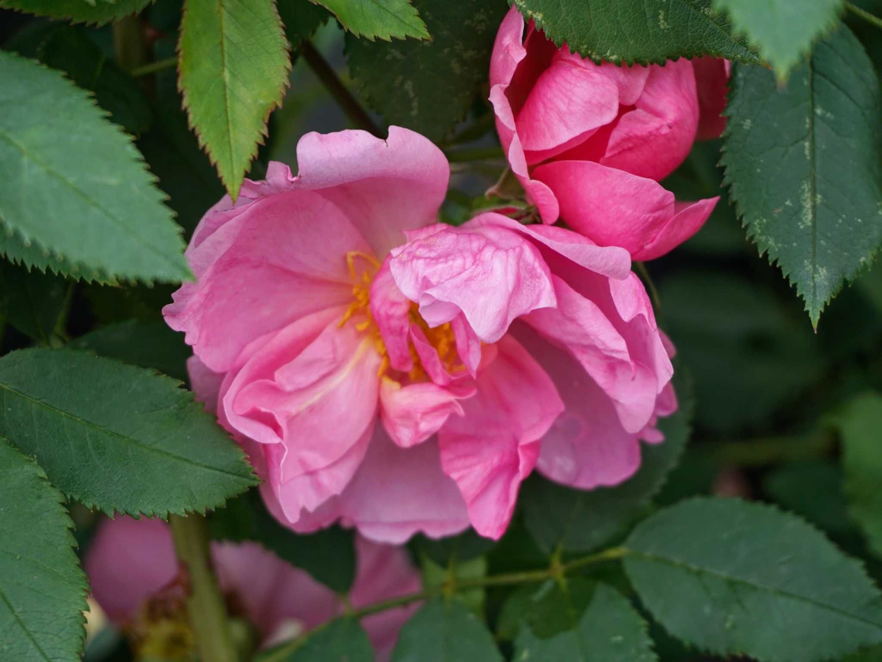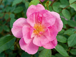 Die halbgefüllten Blüten in rosa duften stark. Nachblühend. Buschig aufrechter Wuchs bis 200 cm Höhe. Robuste Wildrose. Bildet Hagebutten, insektenfreundlich