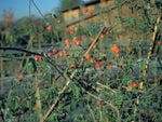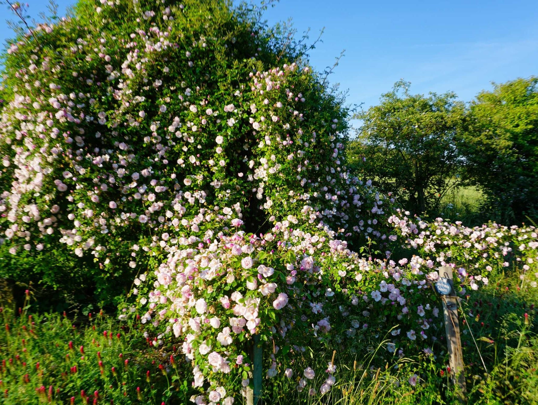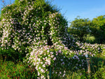 Ganz klar erkennbare Kriechrosenart: die nur stricknadelfeinen Triebe, die man anfangs als zart und zerbrechlich empfindet, entfalten ein unbändiges Längenwachstum. Bis zu 5 Meter in einem Sommer sind durchaus normal, ehe man sich versieht ist ein ganzes Gartenbeet überwuchert wie bei Dornröschen. Wer diese Triebe geplant führt, kann nahezu alles beranken lassen, was man sich denkt, auch meterweit entfernte Balkone werden erobert. Das mattgrüne zarte Laub lässt den Blick auf die Triebe meist frei, die sich dadurch an der Sonnenseite meist rötlich färben. Die porzellanhaften und intensiv nach Anis duftenden Blüten erscheinen einmal im Frühsommer und verwandeln sich dann im Herbst zu erstaunlich großen Hagebutten. Extrem frosthart.