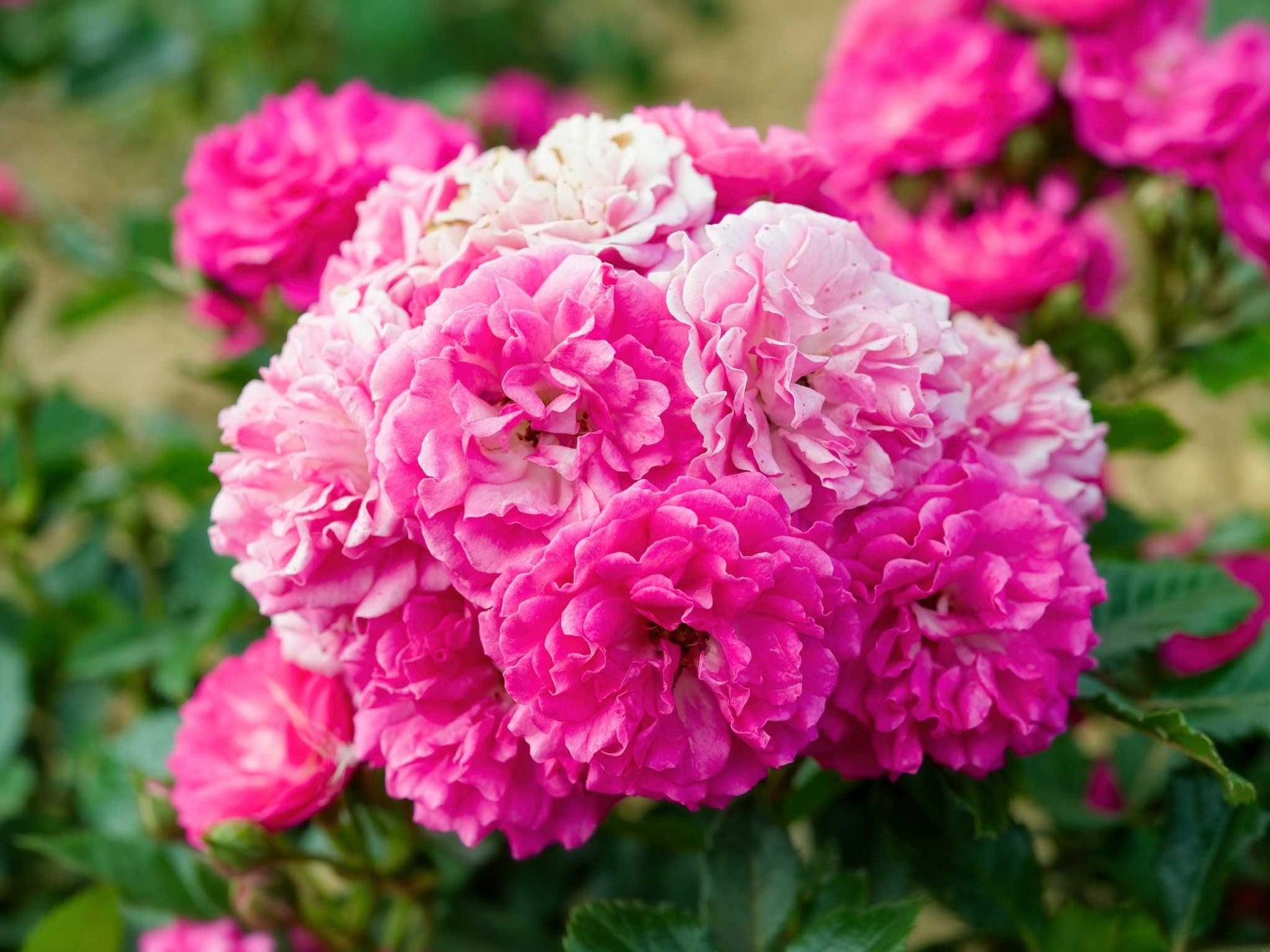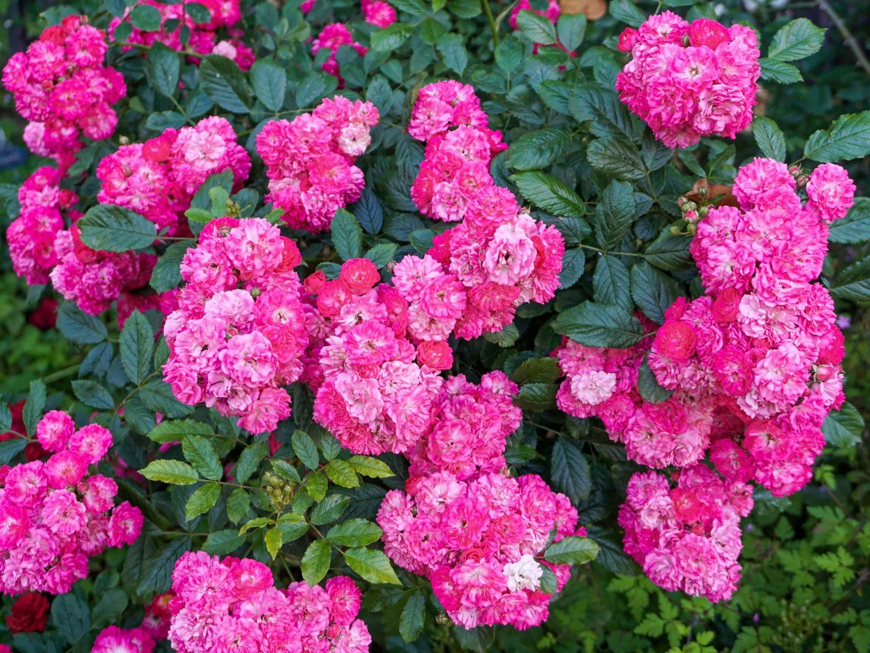 Kleine rosa gefüllte Blüten in Dolden. Buschiger Wuchs bis 40 cm hoch. Robuste Sorte. Lang anhaltende Blüte, glänzendes Laub, gut kübelgeeignet