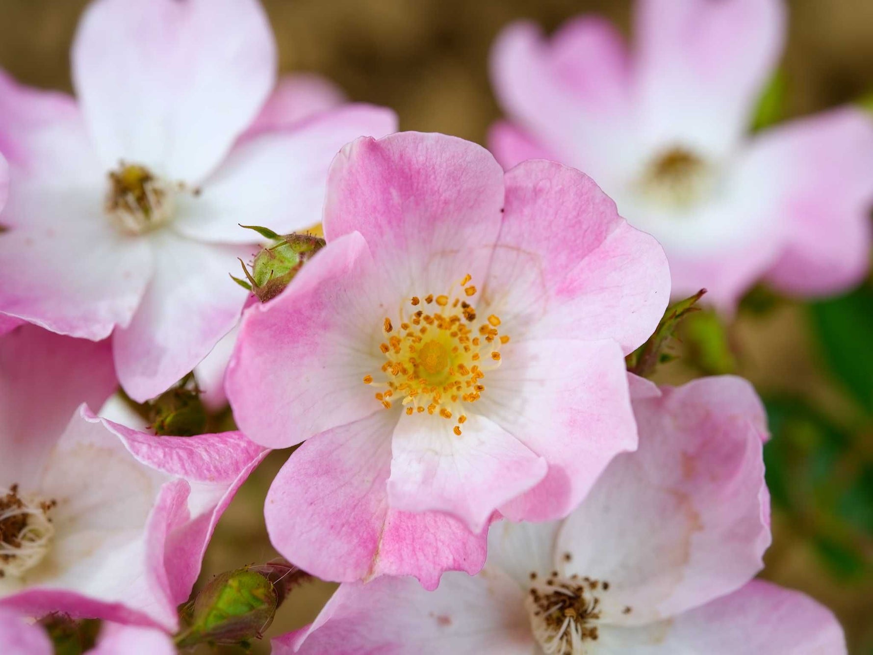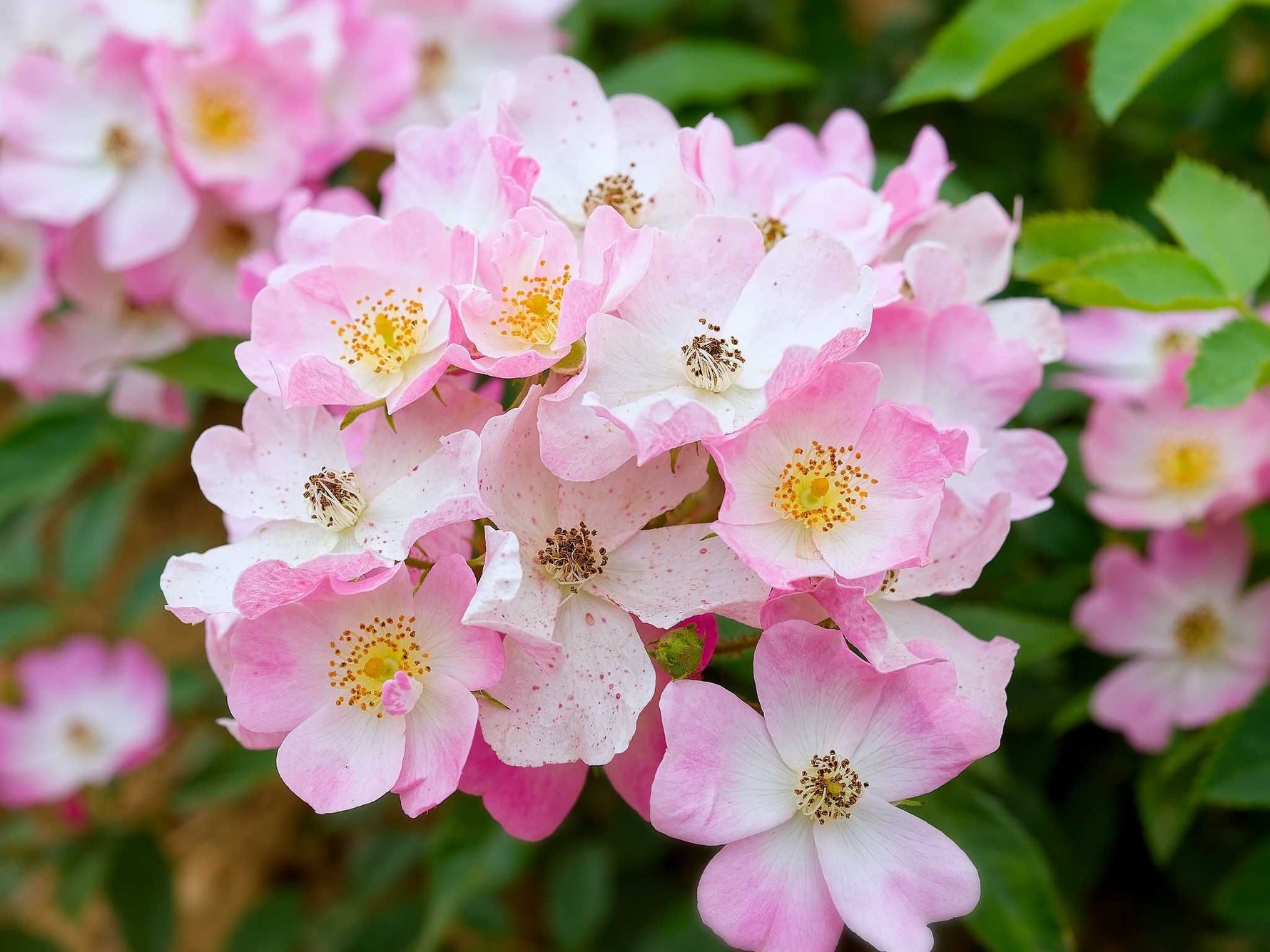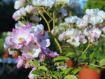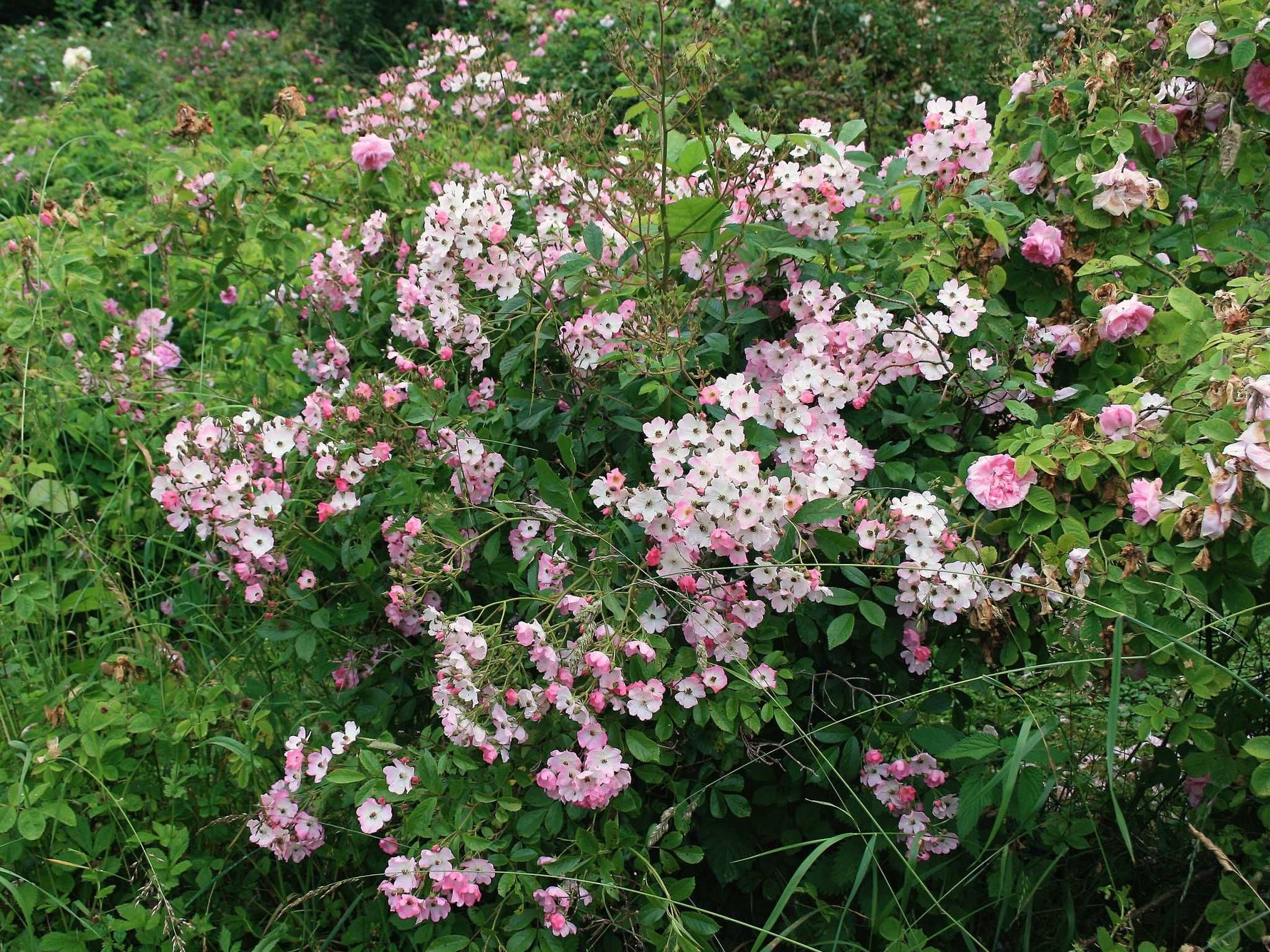 Die kleinen, einfachen Blüten in rosa mit hellem Auge blühen in Dolden. Buschig überhängender Wuchs bis 120 cm Höhe. Robuste historische Strauchrose. Bildet Hagebutten, insektenfreundlich und für Kübel geeignet