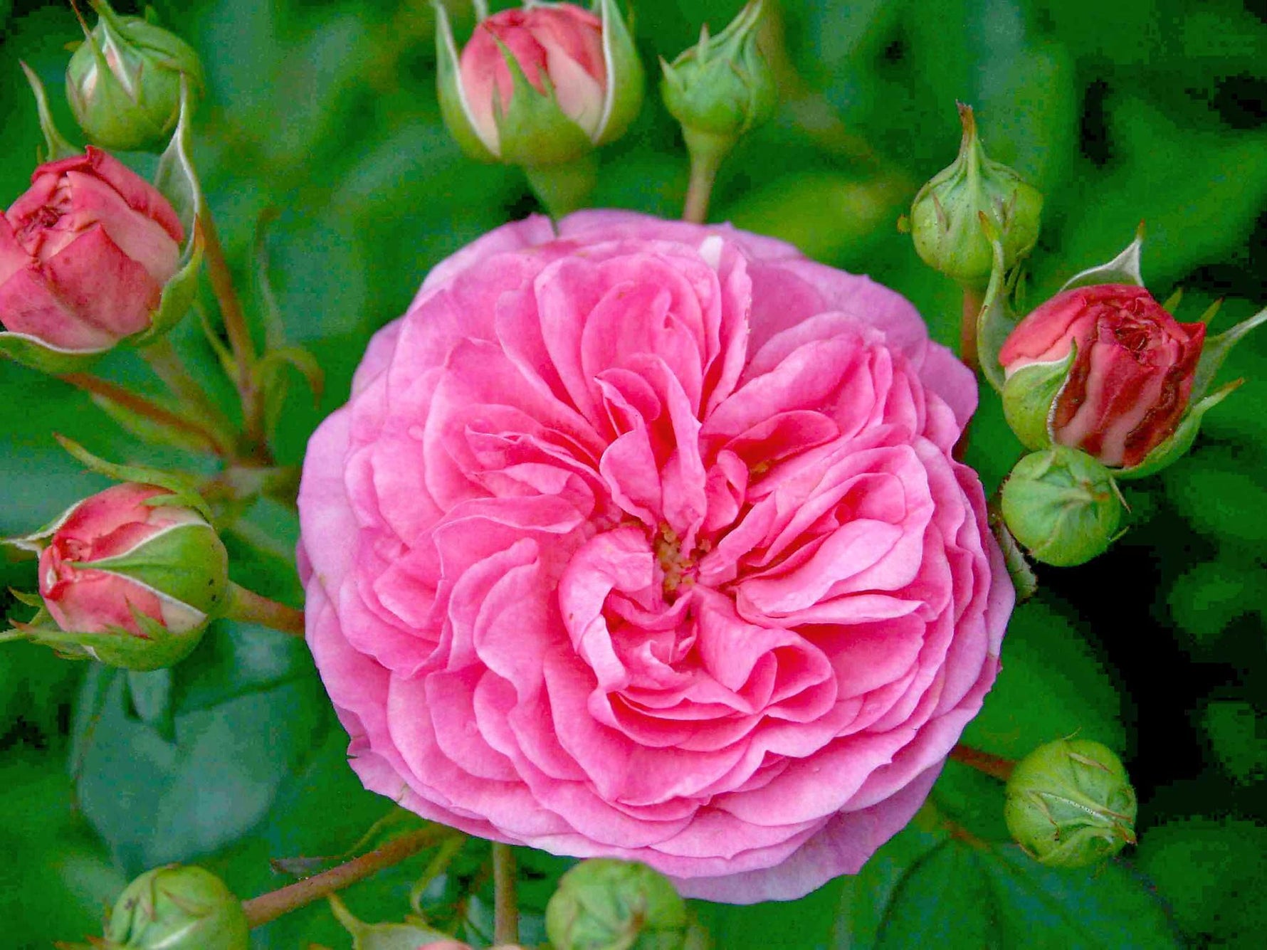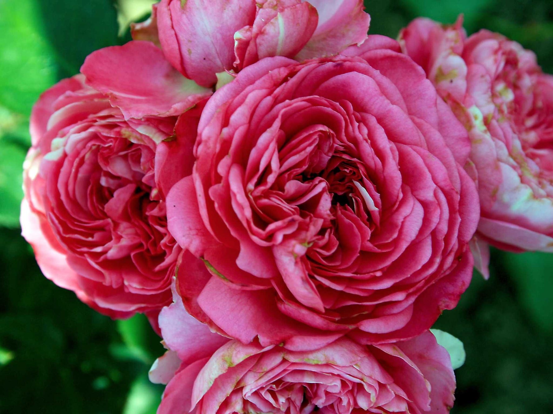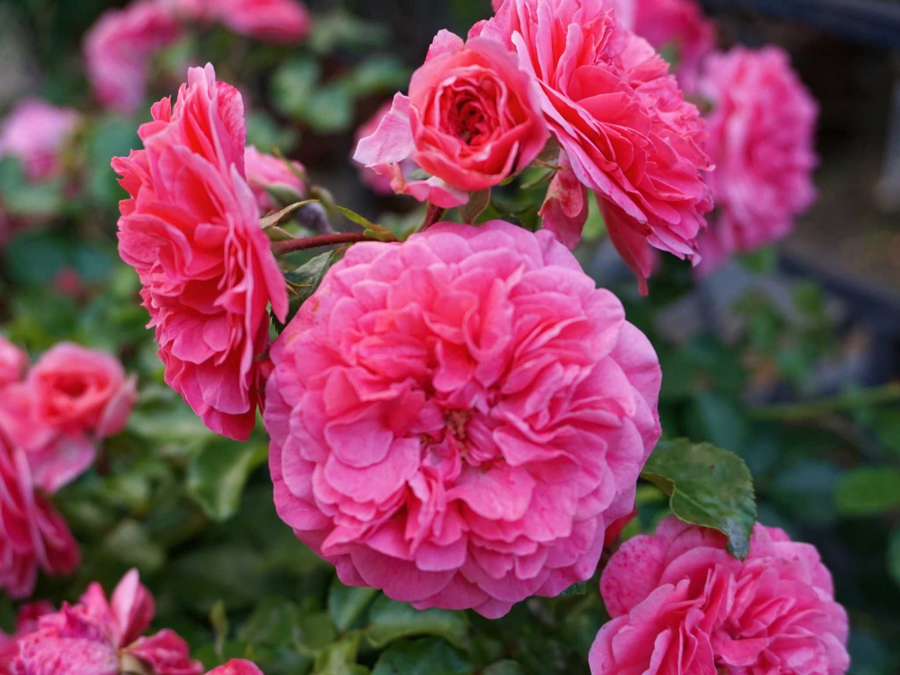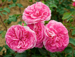 Die dicht gefüllten Blüten in kräftigem rosa, blühen in Dolden und duften zart. Buschiger Wuchs bis 80 cm Höhe. Robuste Beetrose. Zum Schnitt und für Kübel geeignet