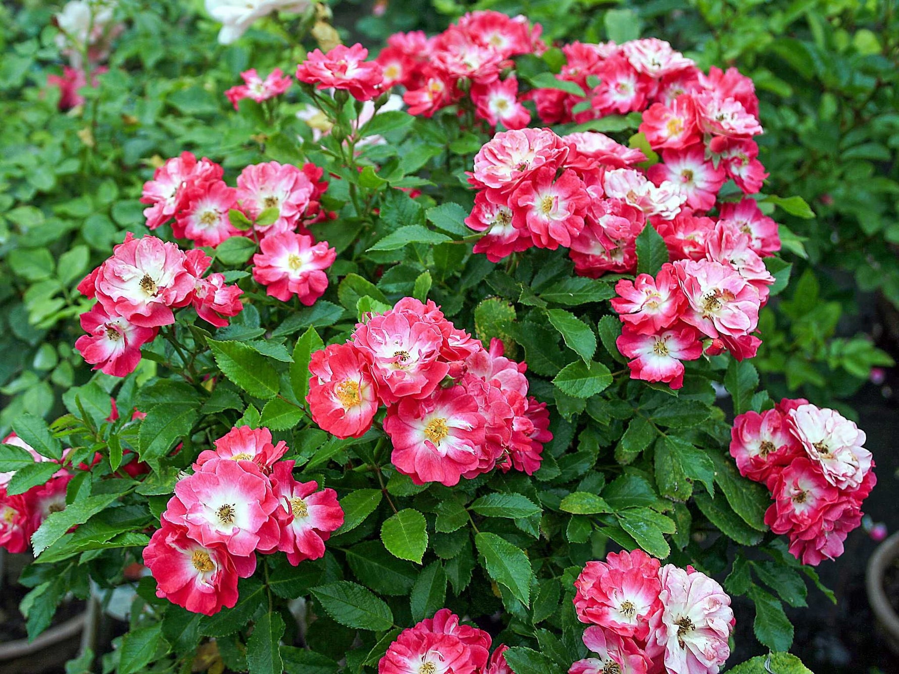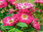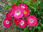 Die kleinen, rosa farbenen, leicht gefüllten Blüten stehen in Dolden. Buschiger Wuchs bis 40 cm Höhe. Robuste Sorte. Bildet Minihagebutten, gut kübelgeeignet.