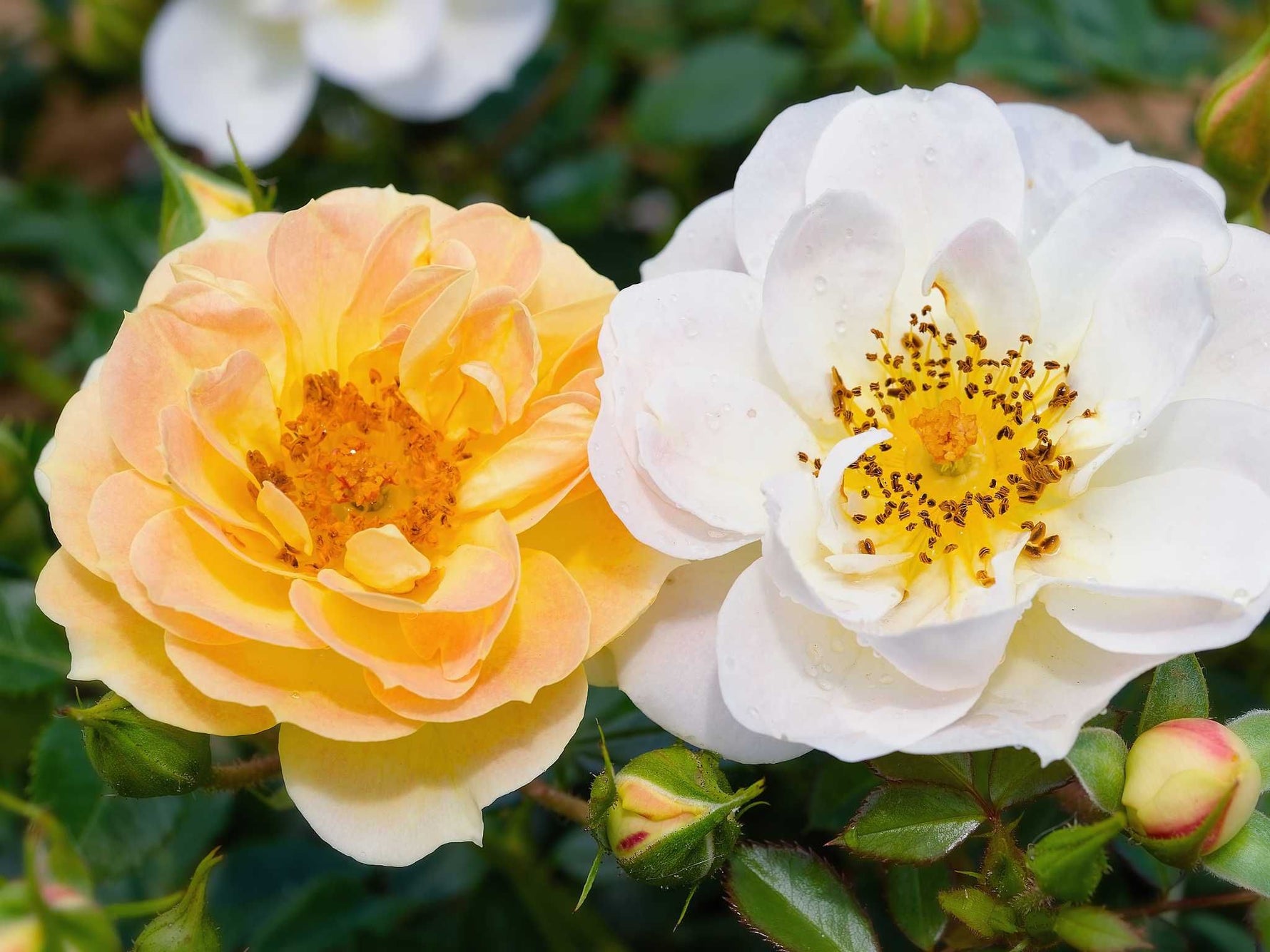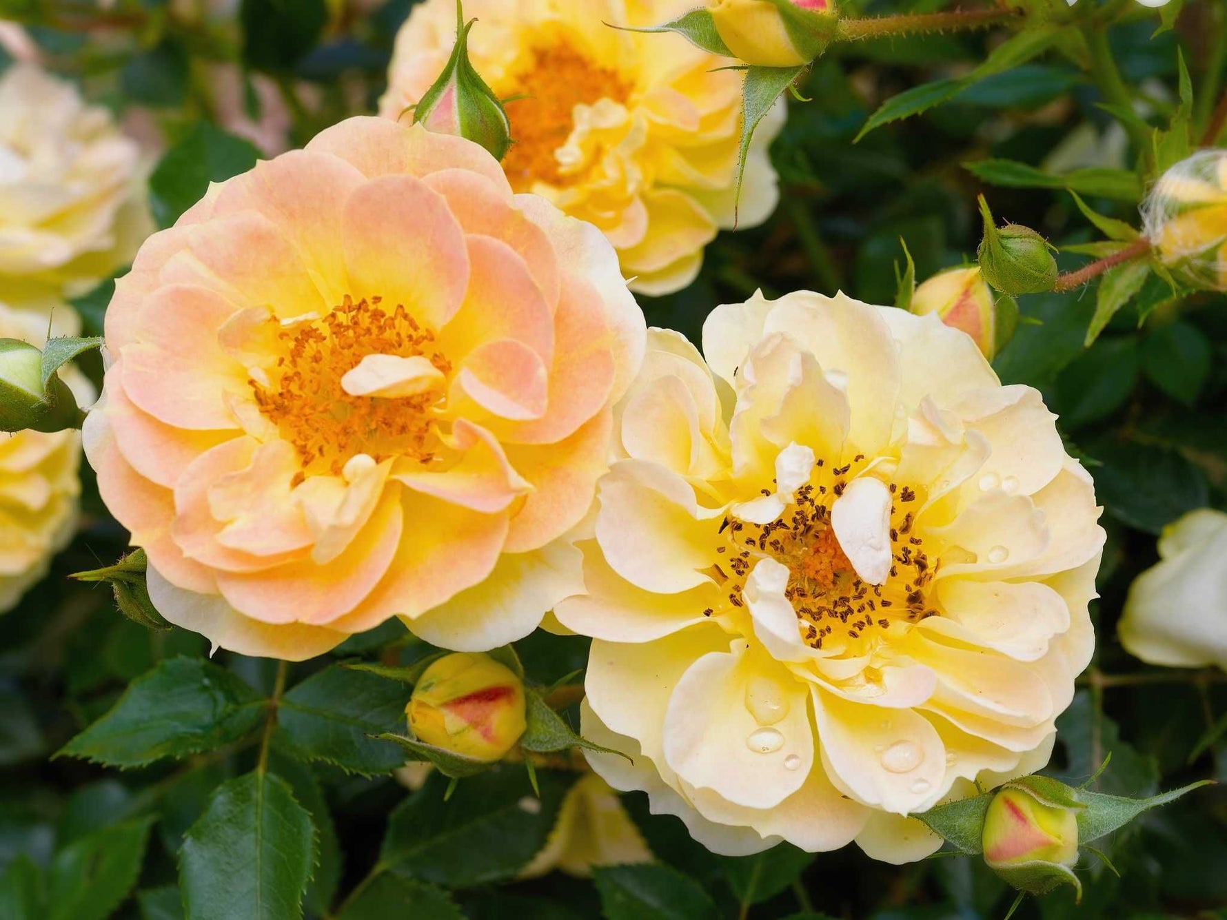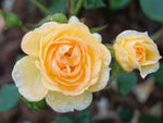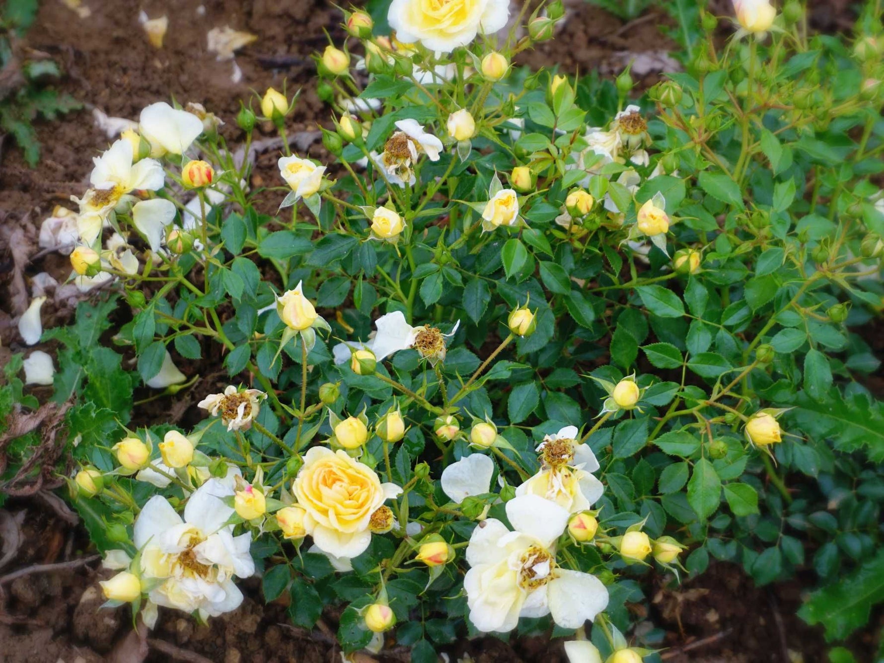 Die halb gefüllten Blüten in gelb blühen in Dolden und duften zart. Buschiger Wuchs bis 40 cm Höhe. Robuste Bodendeckerrose. Zur flächigen Pflanzung und für Kübel geeignet, insektenfreundlich, bildet Hagebutten