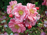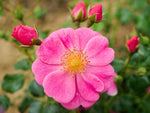 Die halb gefüllten Blüten in rosa blühen in Dolden und duften zart. Überhängender Wuchs bis 60 cm Höhe. Robuste Bodendeckerrose. Zur flächigen Pflanzung und für Kübel geeignet, insektenfreundlich, bildet Hagebutten