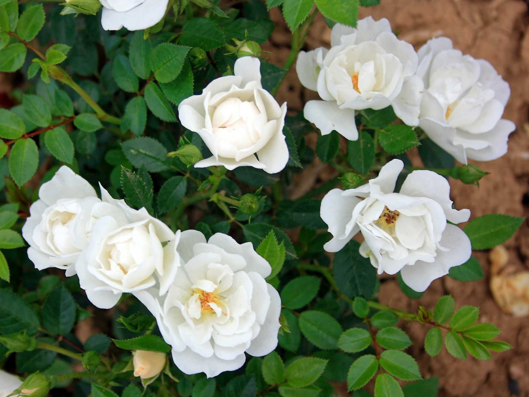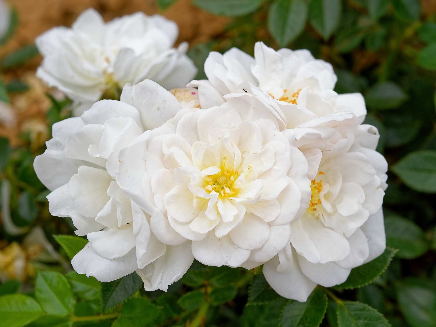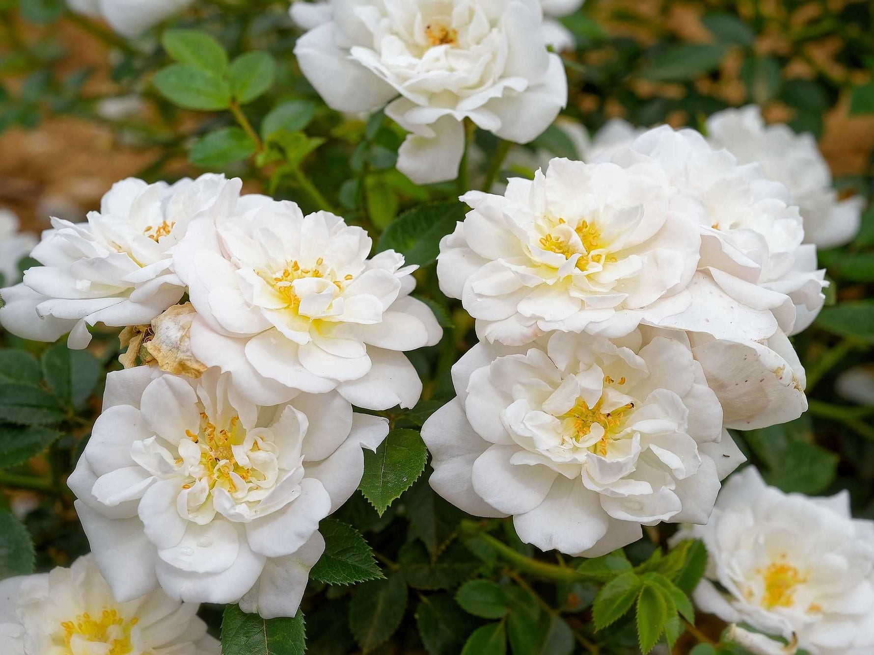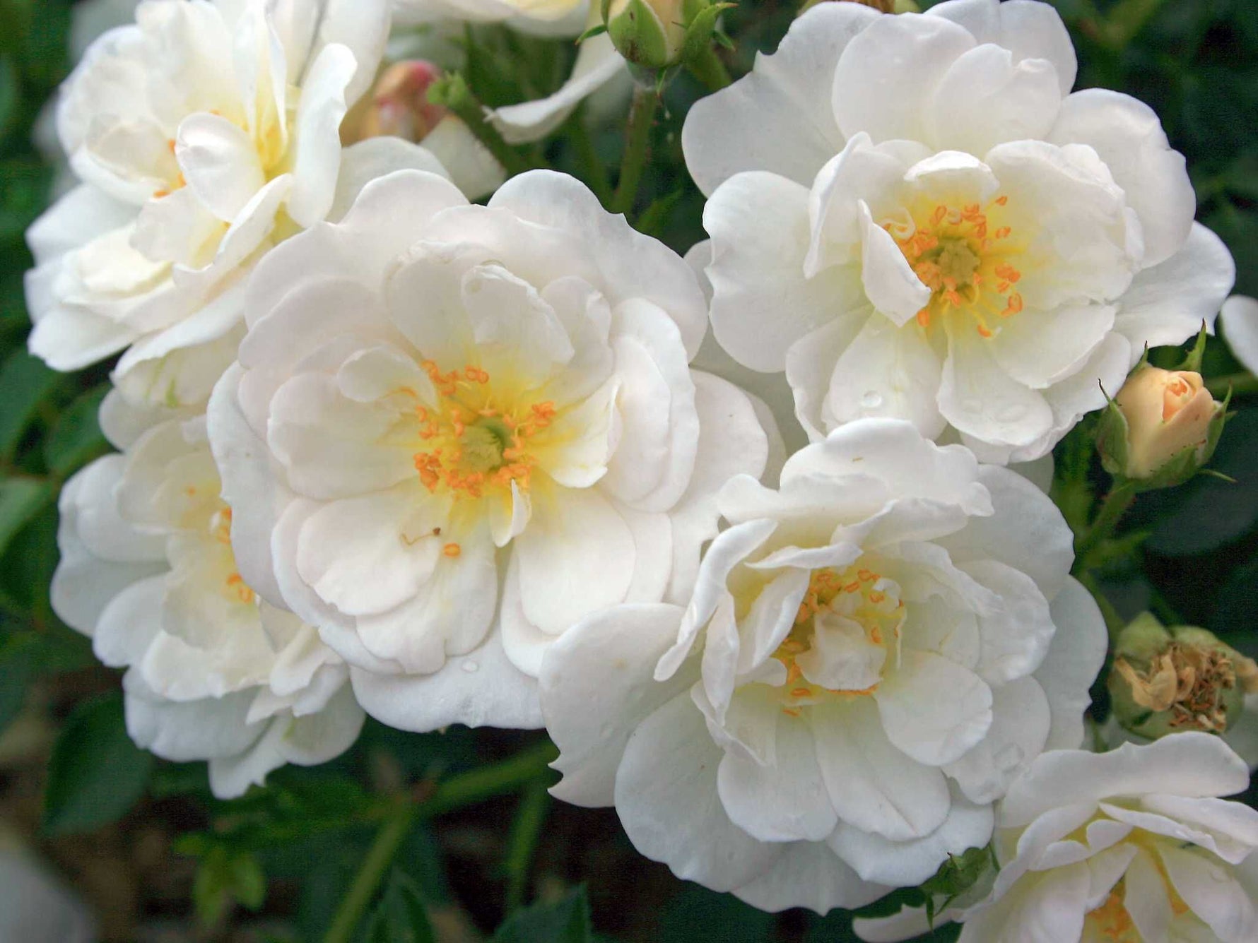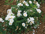 Die leicht gefüllten Blüten in weiß blühen in Dolden und duften zart. Buschiger Wuchs bis 40 cm Höhe. Robuste Bodendeckerrose. Zur flächigen Pflanzung und für Kübel geeignet, insektenfreundlich, bildet Hagebutten