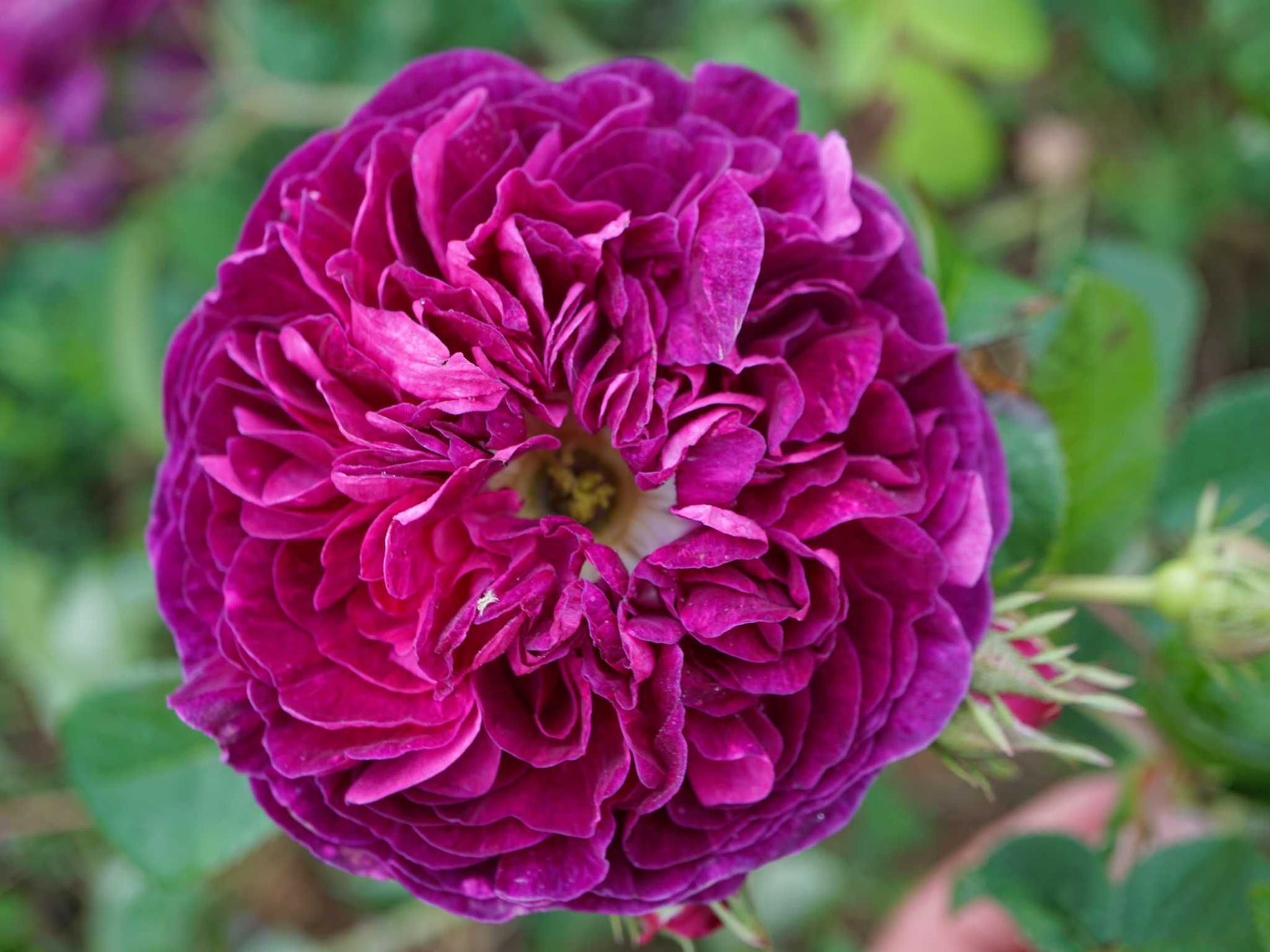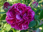 Die dicht gefüllten Blüten in purpurviolett duften stark. Einmalblühend. Buschig aufrechter Wuchs bis 160 cm Höhe. Robuste historische Strauchrose. Zur Rosenblütenernte geeignet
