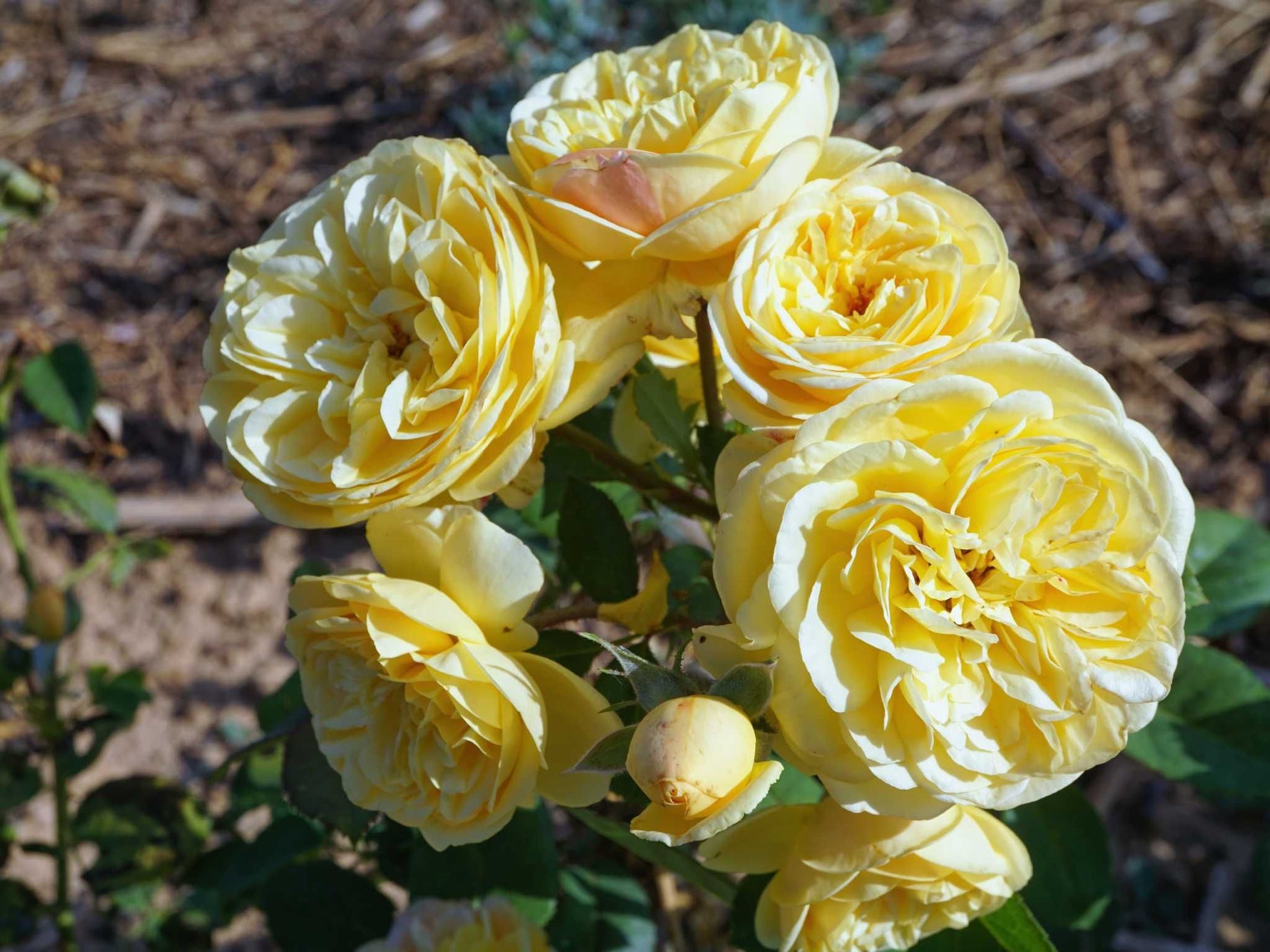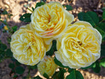 Die dicht gefüllten Blüten in gelb, duften stark und blühen in Dolden. Buschiger Wuchs bis 80 cm Höhe. Robuste Beetrose. Zur Blütenernte und für Kübel geeignet
