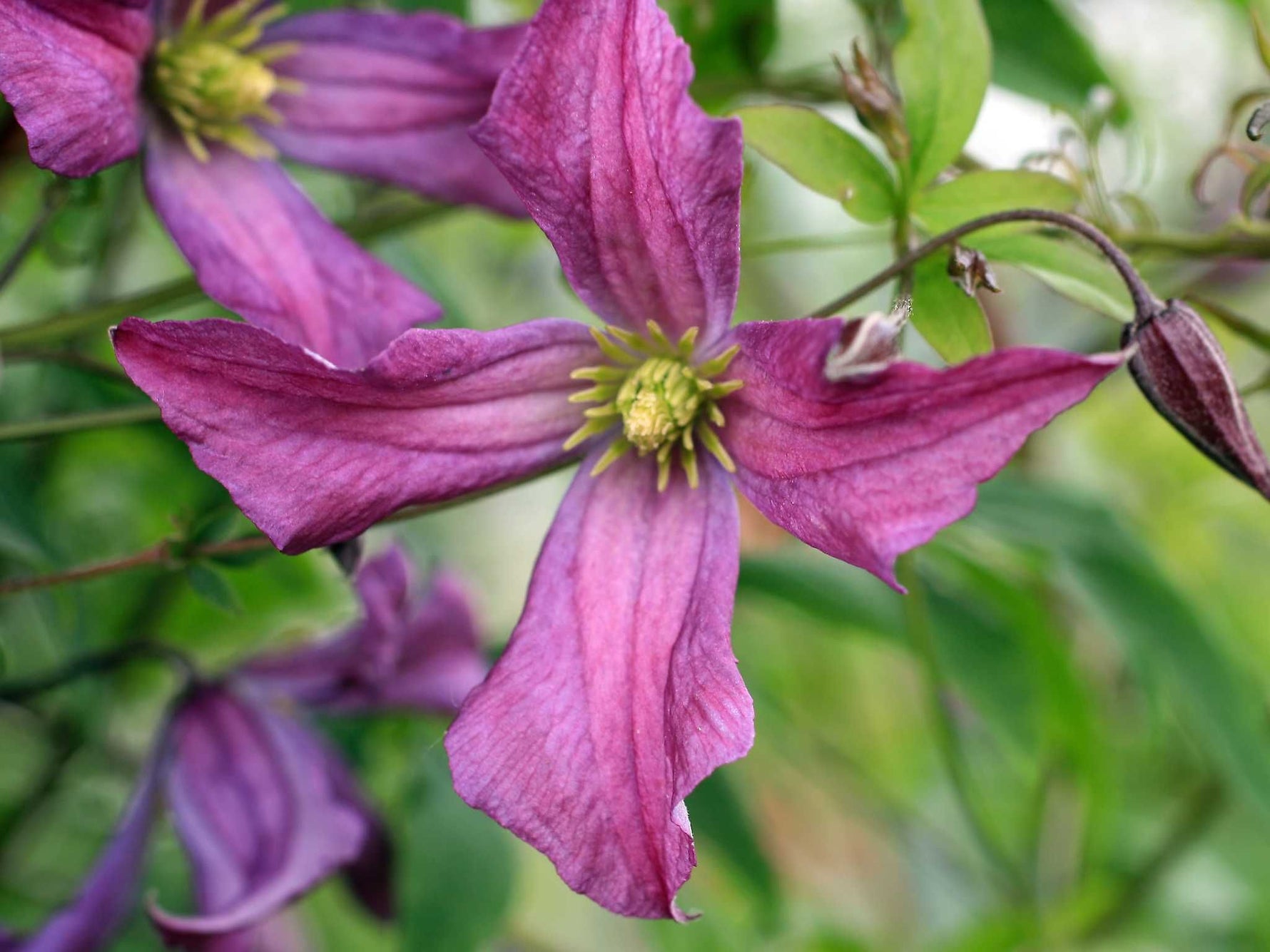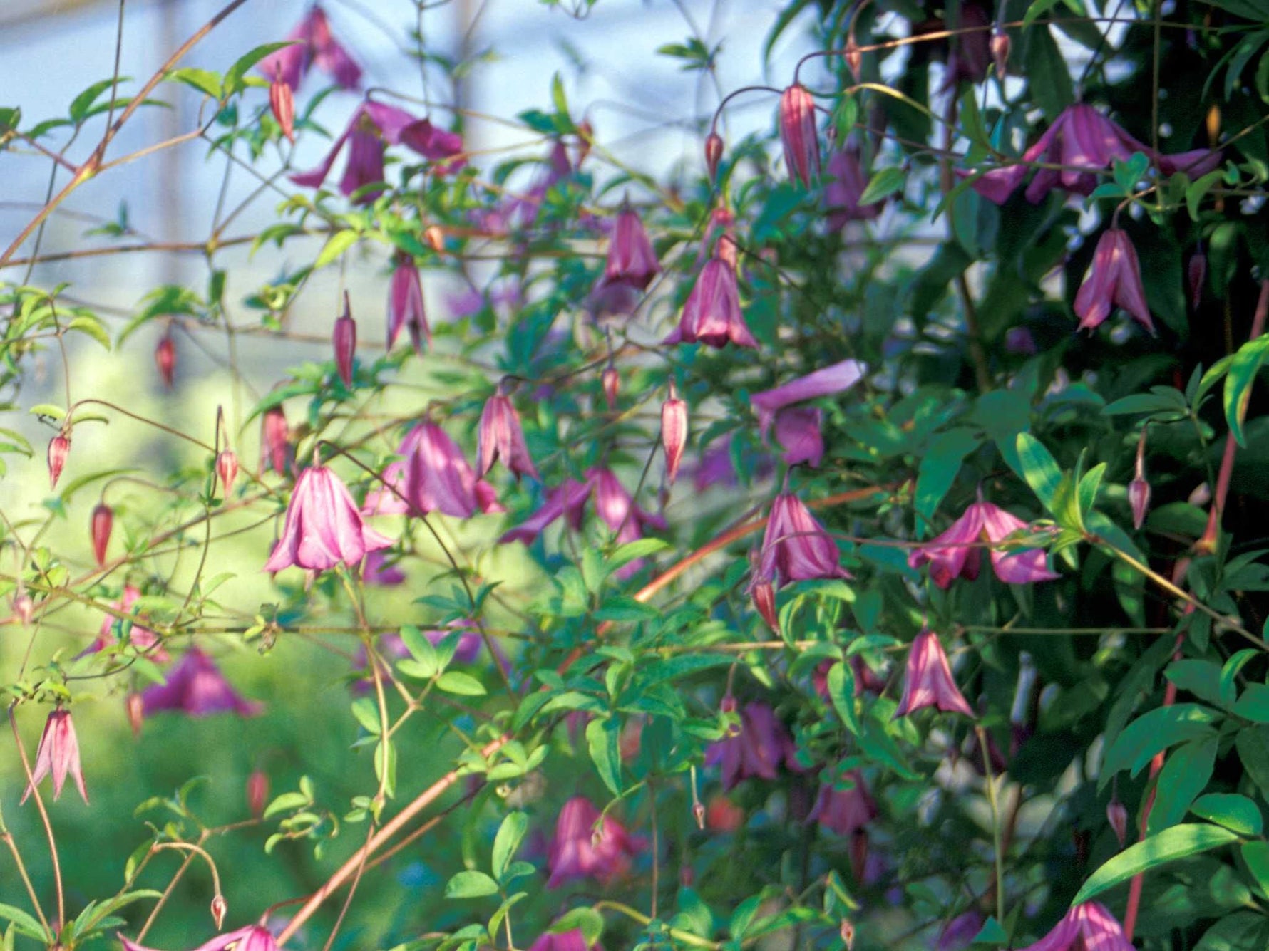 Viele kleine göckchen förmige, blauviolette Blüten erscheinen ab Juni in Massen. Dies ist die Wildform, welche in Norditalien vorkommt und dort verbreitet an Waldrändern wächst. Die Wuchskraft und Unempfindlichkeit hat diese Art zu der Mutter der besten Gartenclematis gemacht. Sie bekommt keine Clematiswelke und ist sehr frosthart. Ein idealer Kletterrosenpartner, aber genauso schön, wenn sie im Naturnahen Garten Zäune und Sträucher berankt. Auch im Topf gedeiht sie gut.