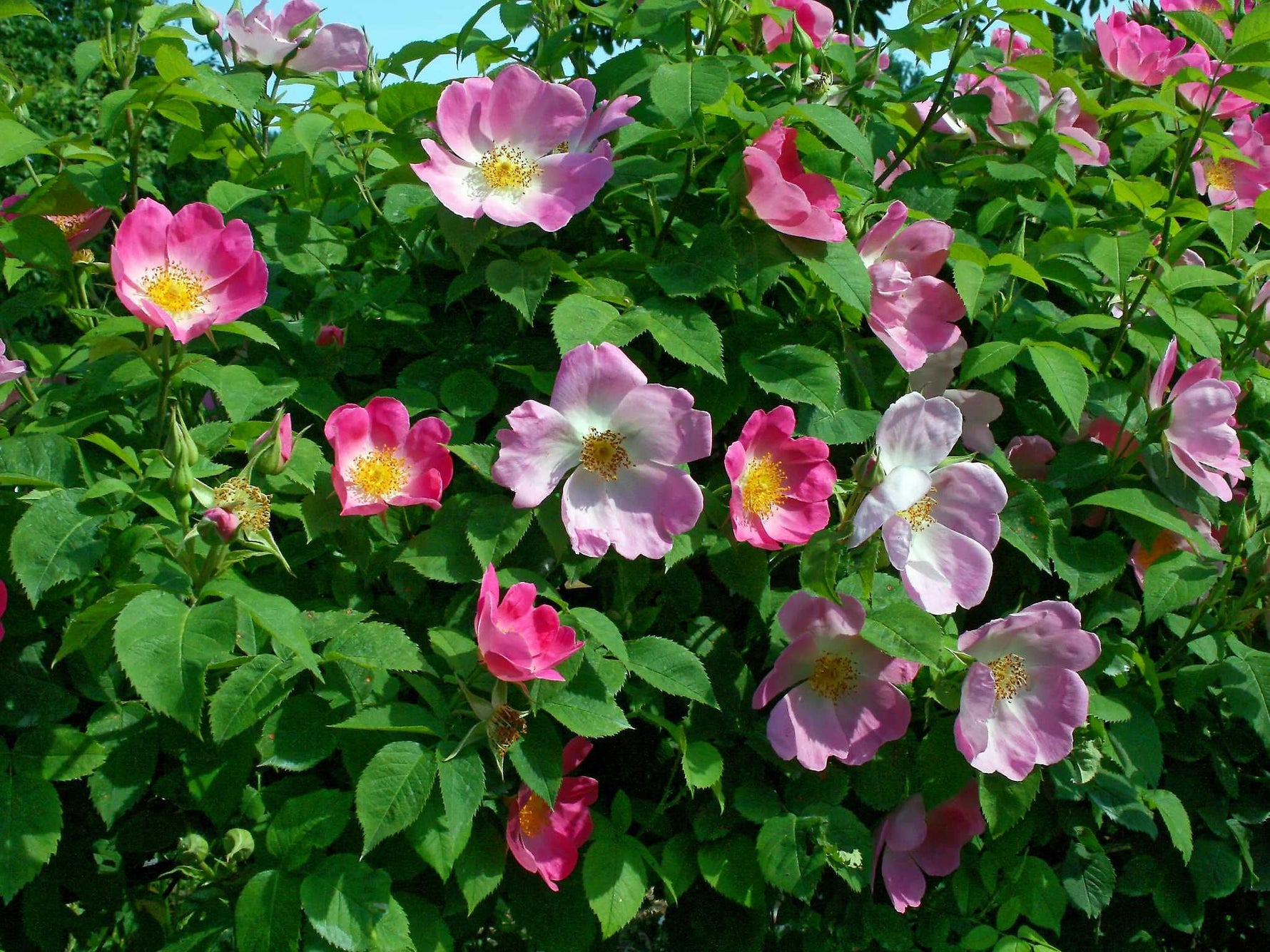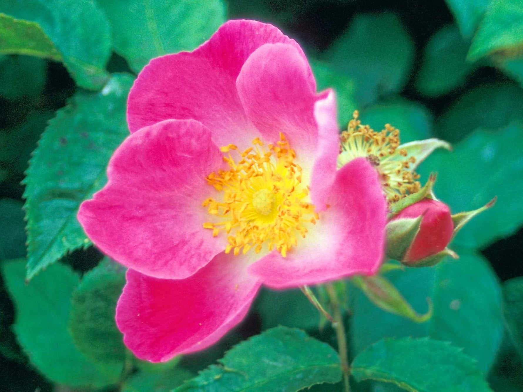 Die großen, einfachen Blüten in rosa mit hellem Auge duften gut. Einmalblühend. Buschig aufrechter Wuchs bis 200 cm Höhe. Sehr robuste historische Strauchrose. Insektenfreundlich, bildet große Hagebutten