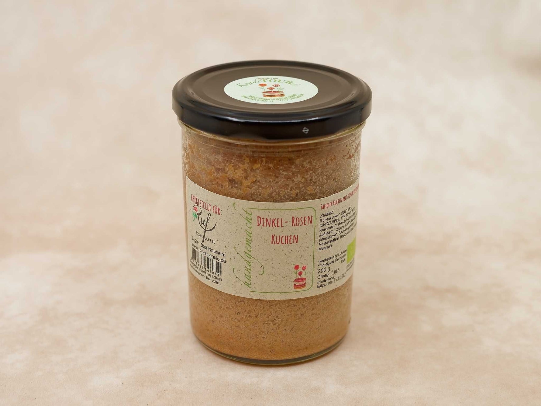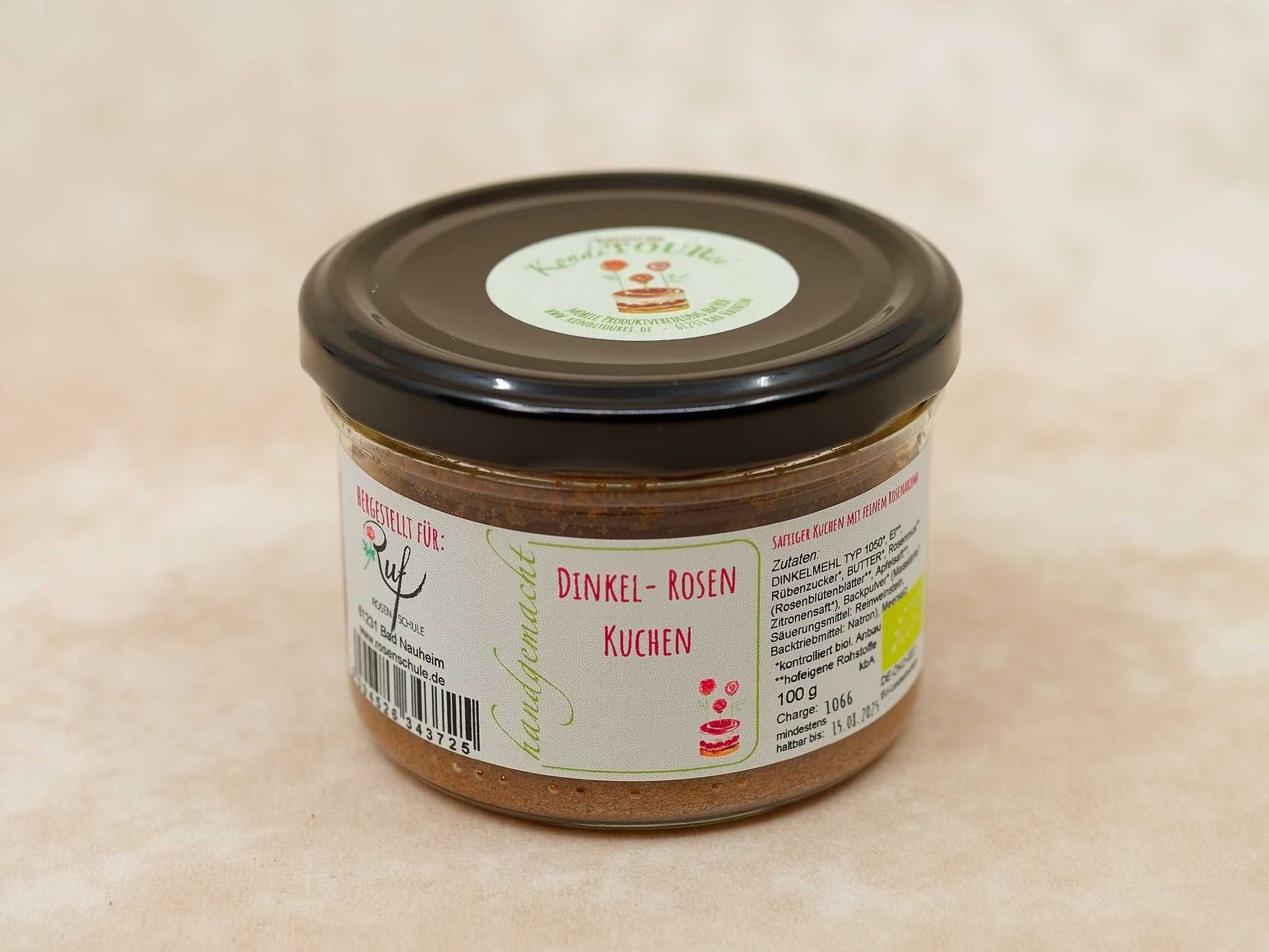 Saftiger Rührkuchen mit hofeigenen Eiern und feinem Rosenaroma. Fertig gebackener Kuchen im Glas, mehrere Monate haltbar. Einfach Deckel öffnen und genießen.