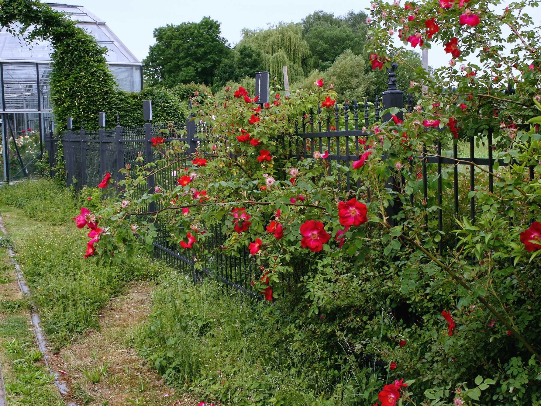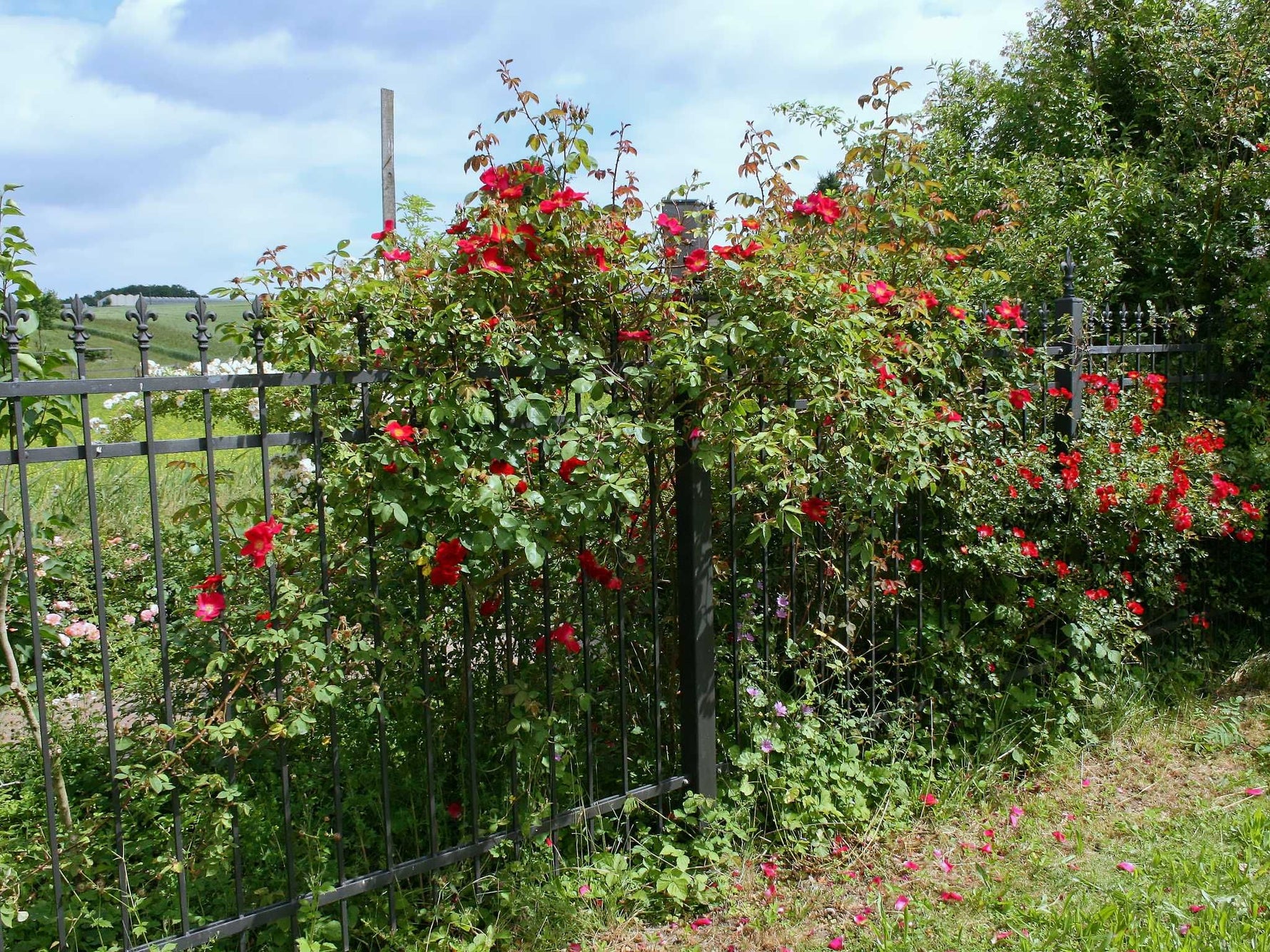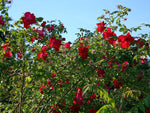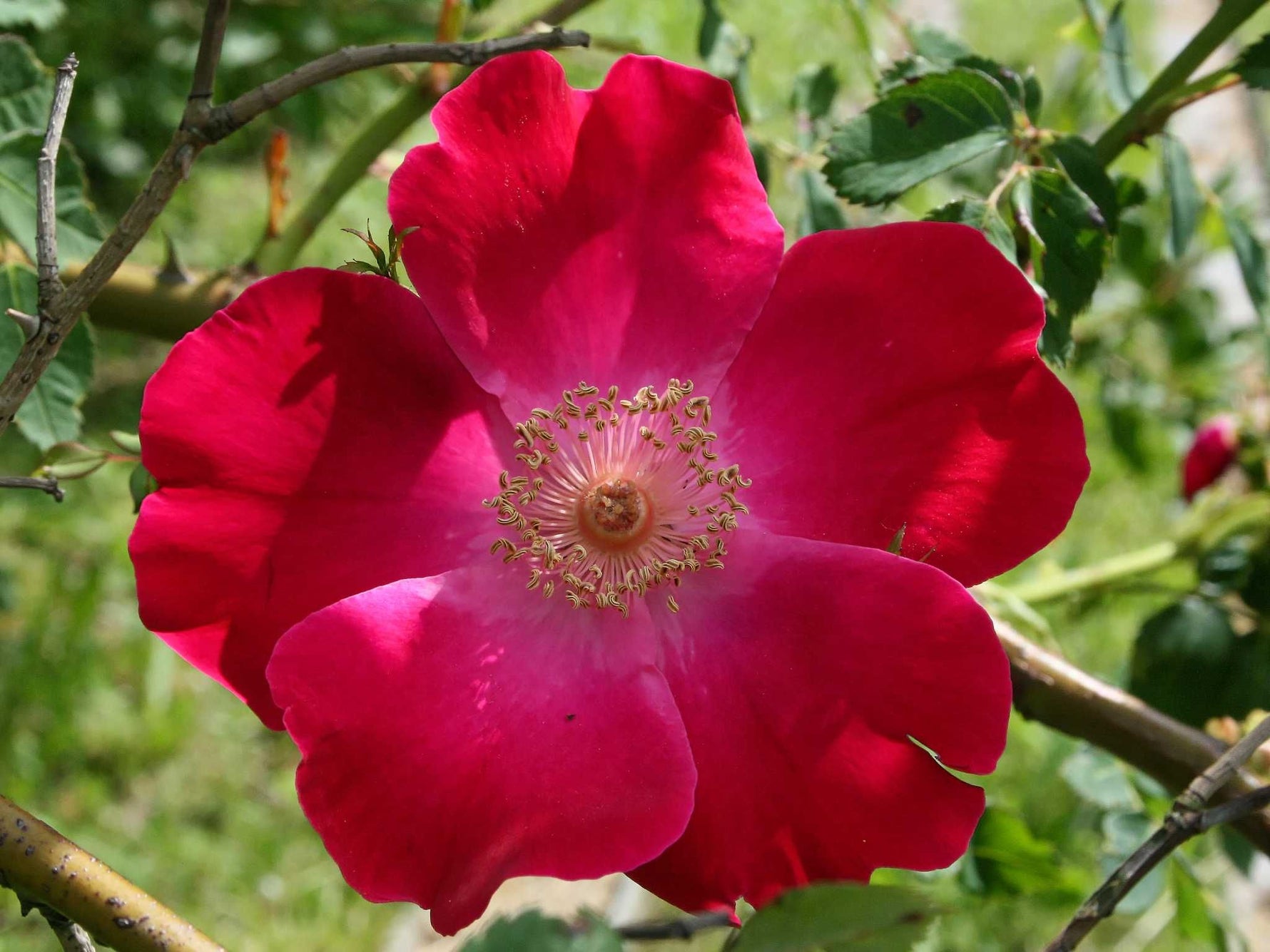Mittelgroße, einfache Blüten in rot. Einmalblühend. Buschiger Wuchs bis 250 cm Höhe. Robuste Wildrose. Bildet Hagebutten, insektenfreundlich