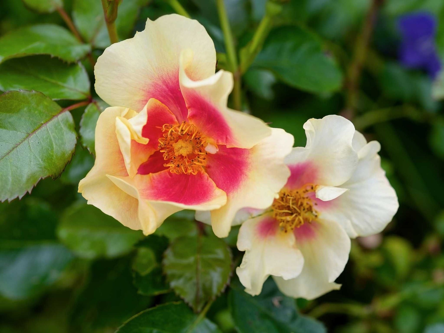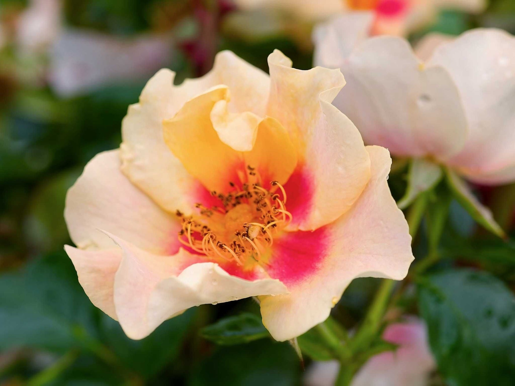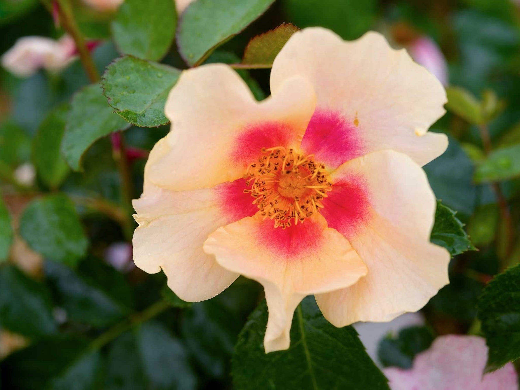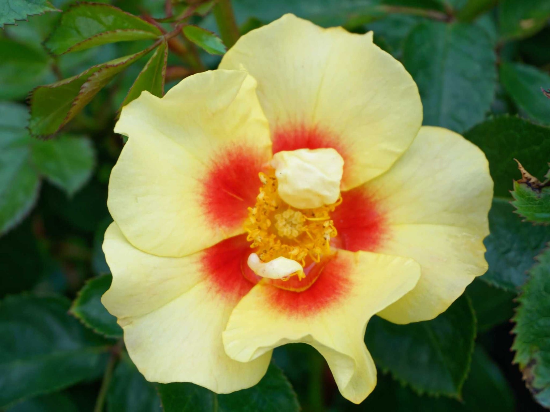 Die einfachen Blüten in gelb mit rotem Auge blühen in Dolden. Buschiger, kompakter Wuchs bis 80 cm Höhe. Robuste Beetrose. Insektenfreundlich, für heiße Lagen und für Kübel geeignet, bildet Hagebutten