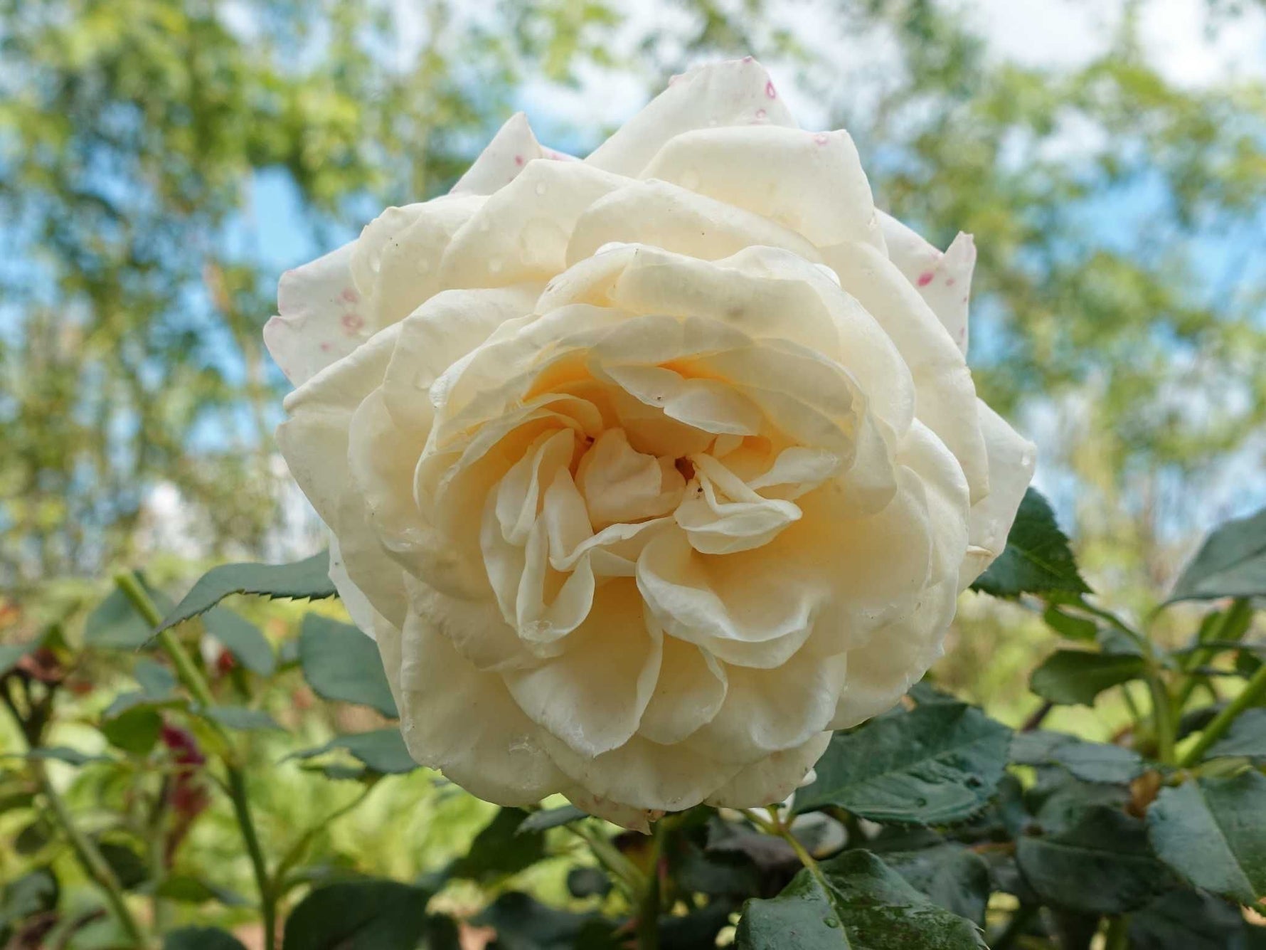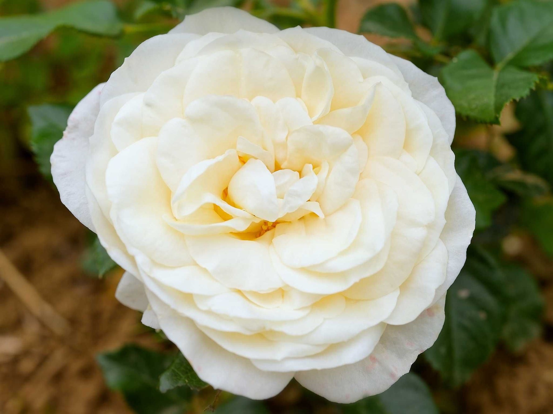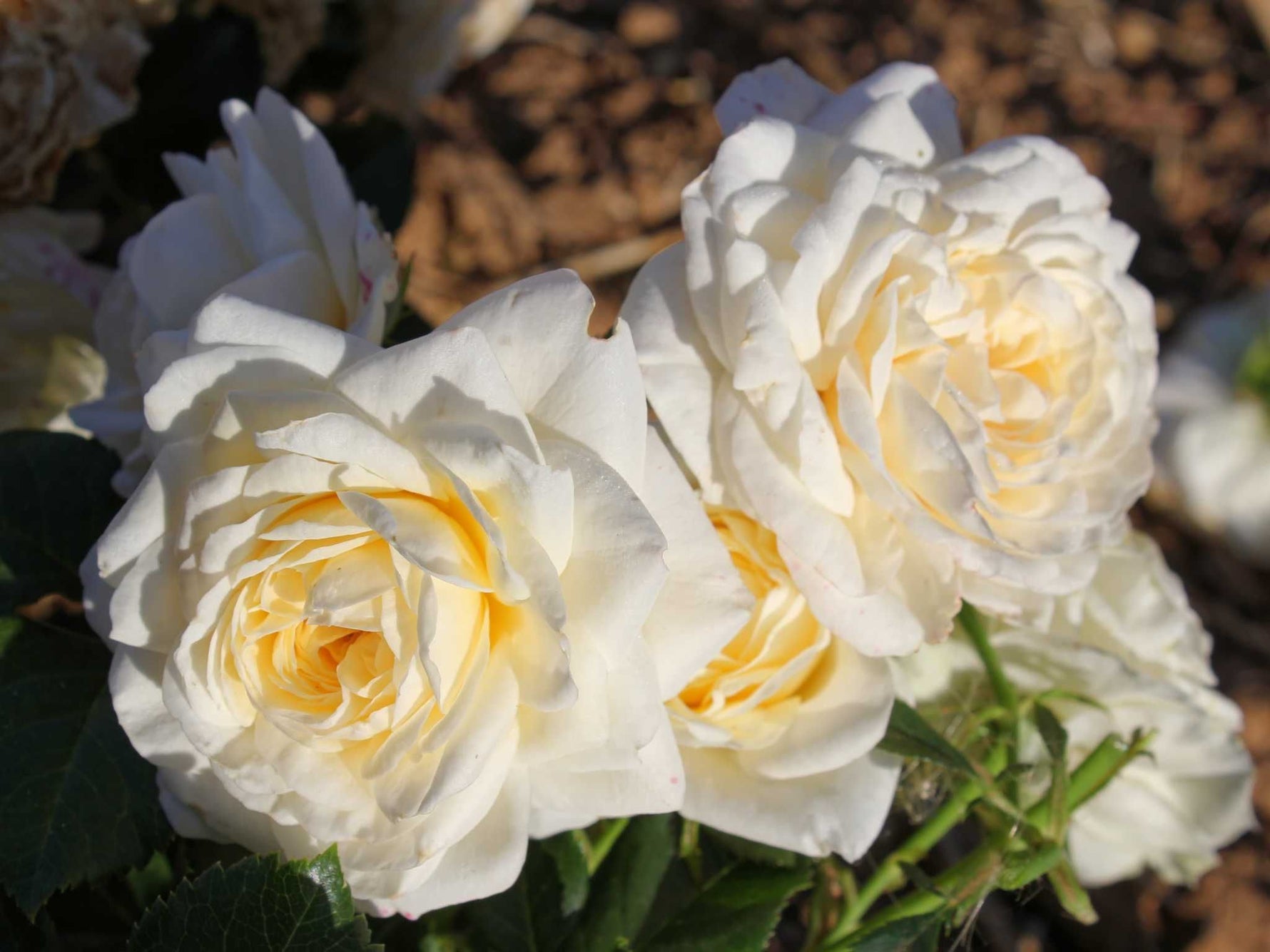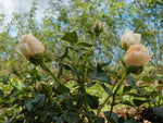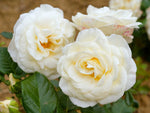 Die mittelgroßen, stark gefüllten Blüten in weiß stehen in Dolden. Das Laub ist grün und glänzend. Eine kompakte Rose mit elegant gefüllten Blüten, die lange haltbar sind. Diese großblütige Zwergrose ist sehr gut für den Kübel geeignet.
