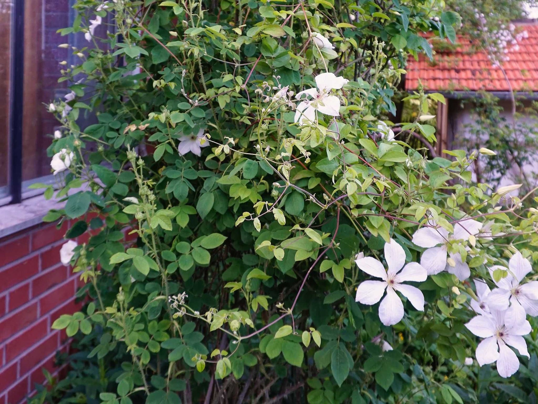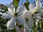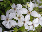 Mittelgroße weiße Blüten mit violetten Staubgefäßen. Reichblühend, Blütezeit VI-IX. Robuste, gut winterharte Clematis, kompakter Wuchs, für sonnigen Standort, gut kübelgeeignet, insektenfreundlich