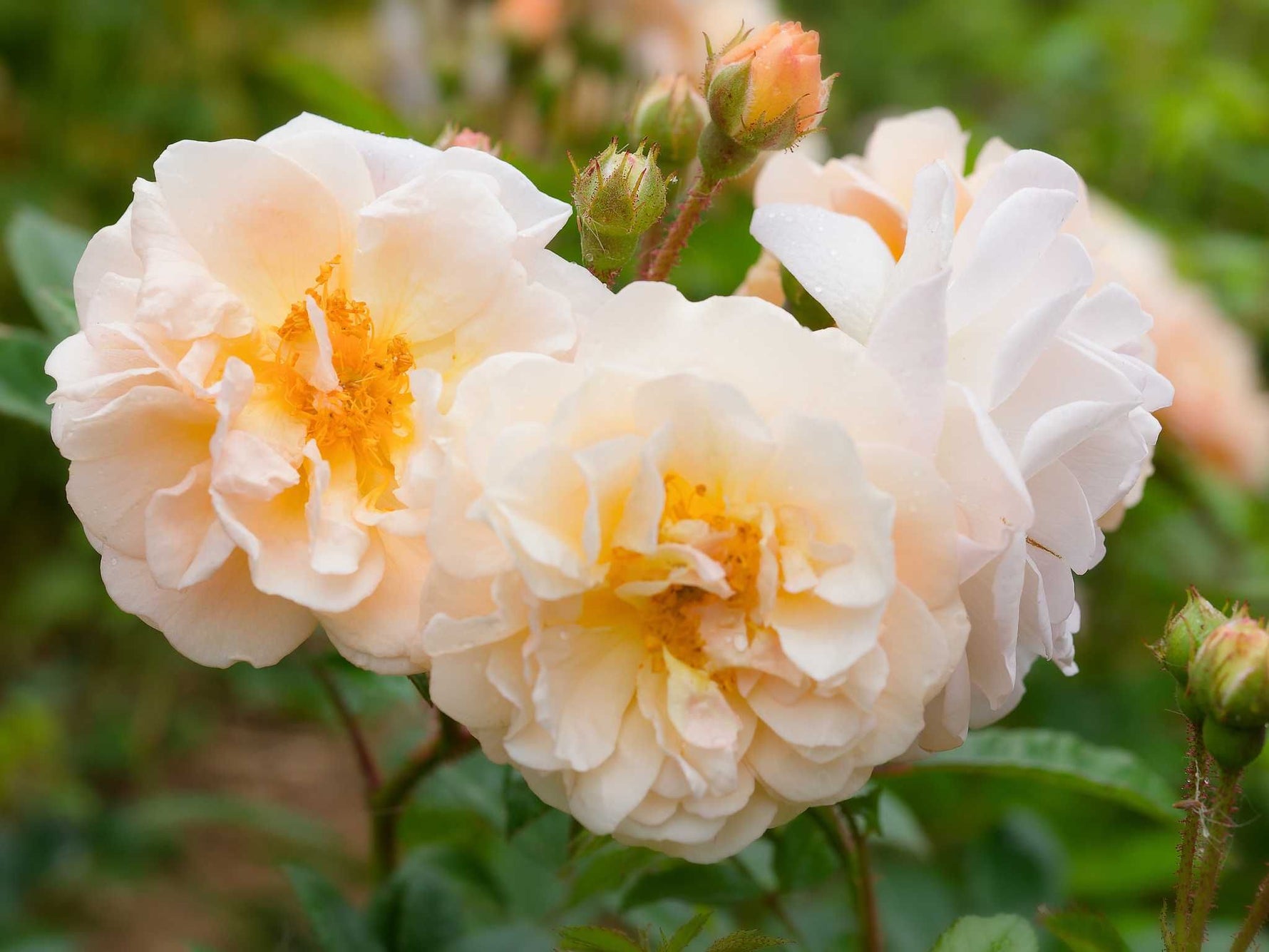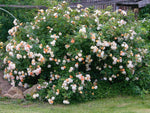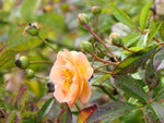 Die kleinen halb gefüllten Blüten in hellgelb bis apricot-orange duften zart und bilden Dolden. Kräftiger, buschiger Wuchs mit feinen Trieben bis 350 cm. Sehr robuste Ramblerrose. Bildet kleine Hagebutten, zum Beranken von Bäumen und Rosenbögen, Kübelgeeignet, auch für schattige Lagen, Insektenmagnet