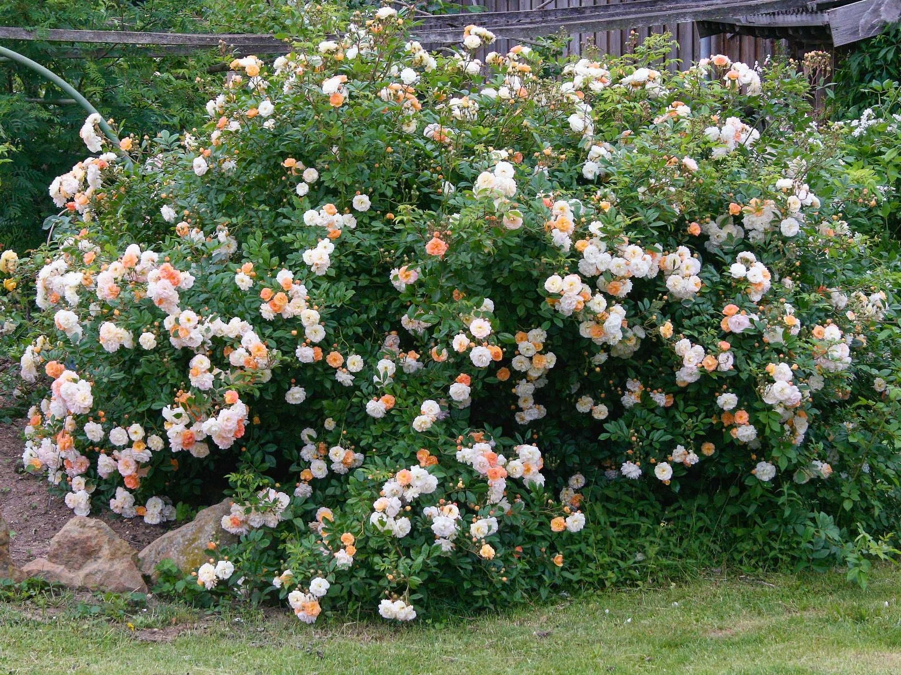 Die kleinen, leicht gefüllten Blüten erscheinen in den typischen multifora-Büscheln. Sie haben einen zarten Teerosenduft. Ihre Faszination liegt aber in ihrer wandelbaren Farbe. Als Knospe noch kupfriggelb, hellt sie bald auf zu lichtgelb und verblasst gegen Ende zu weiss. Nur bei kühlem Wetter tritt dazwischen noch ein rosa Hauch auf. Die Folge ist, daß immer verschiedene Blüten am Strauch sind, dieser aber auch je nach Wetterlage ganz unterschiedlich aussieht. Der Wuchs ist üppig und weit überhängend, dadurch ist diese robuste Sorte auch als Strauch sehr schön. Das mittelgrüne, sehr gesunde Laub sitzt an nahezu stachellosen Trieben. Eine der besten Rosenbogenrosen. Bekannt für Unkompliziertheit und Schattentoleranz ist dies eine Rose, die man kennen sollte.