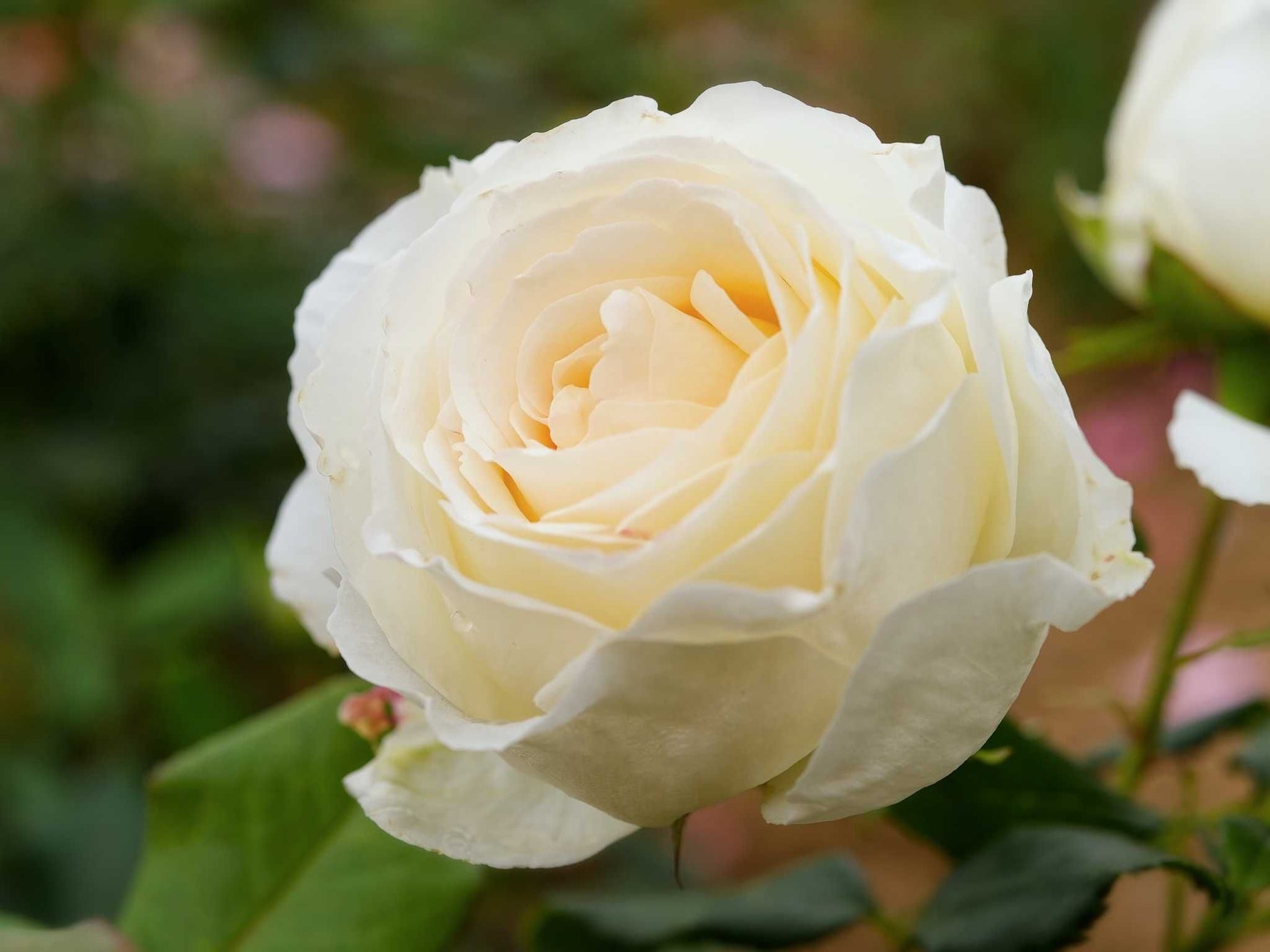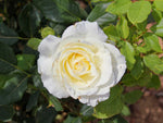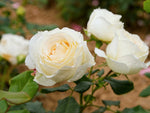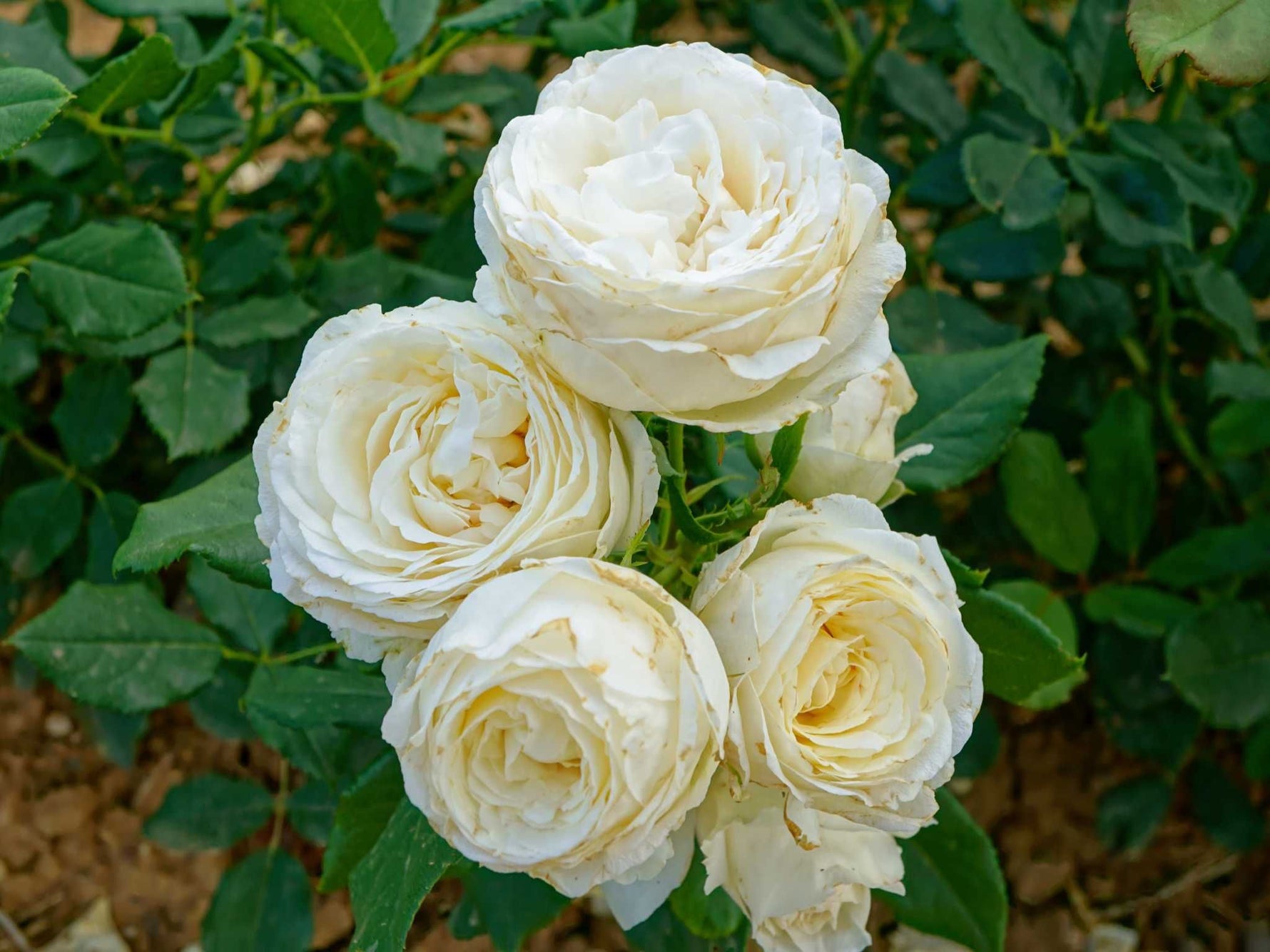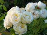 Die gefüllten Blüten in weiß blühen in Dolden und duften zart. Buschiger Wuchs bis 80 cm Höhe. Robuste Beetrose. Für Kübel geeignet