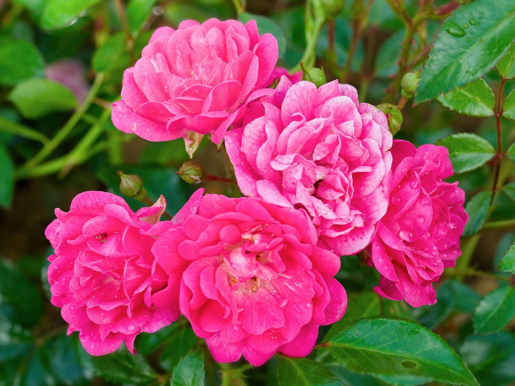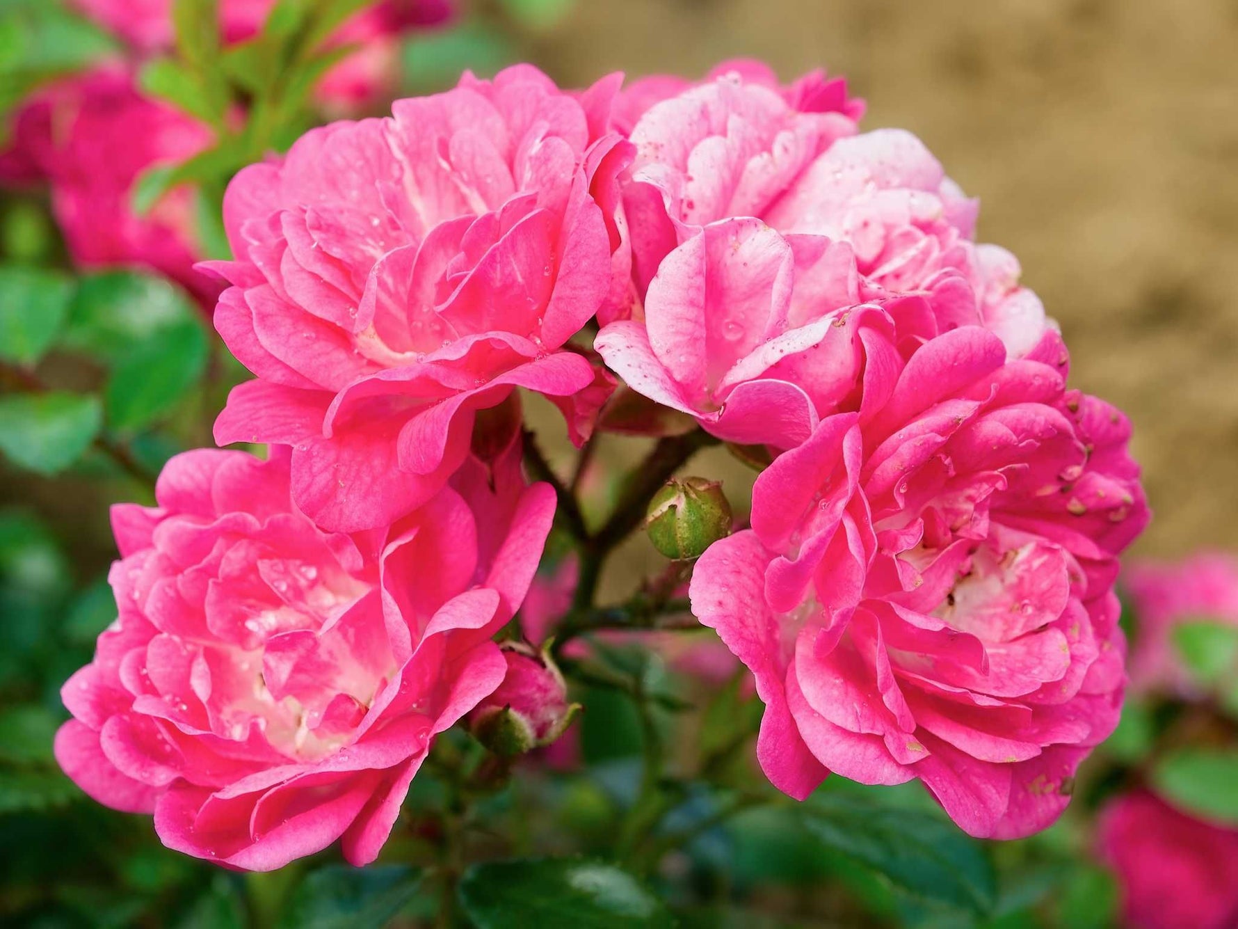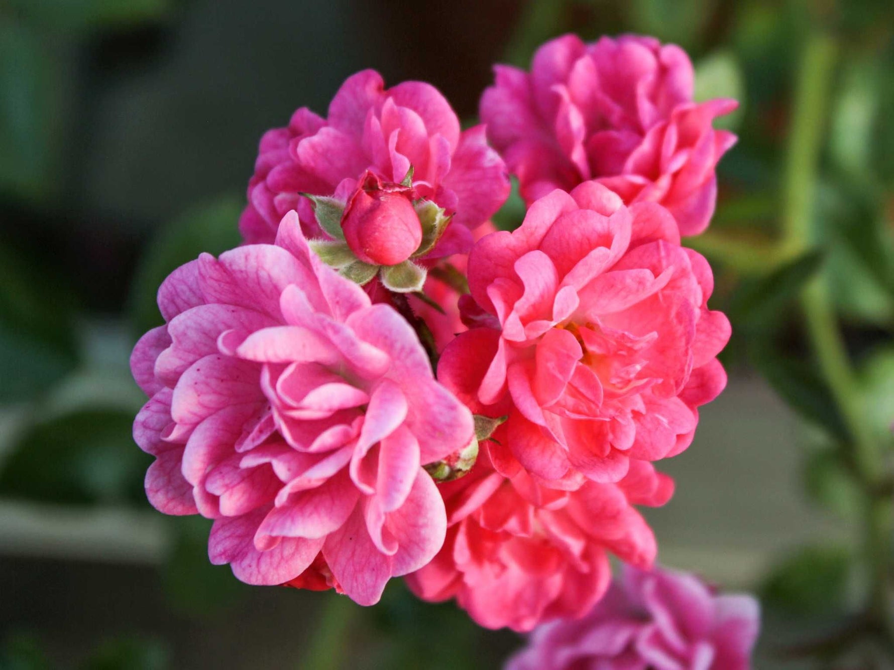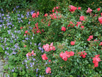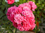 Die kleinen, gefüllten Blüten in kräftig rosa blühen in pyramidalen Dolden. Buschig überhängender Wuchs bis 80 cm Höhe. Robuste Bodendeckerrose. Zur flächigen Pflanzung und für Kübel geeignet