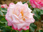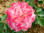 Die großen dicht gefüllten Blüten in weiß mit rosa Rand duften stark. Buschig aufrechter Wuchs bis 80 cm Höhe. Robuste Edelrose. Schnittrose