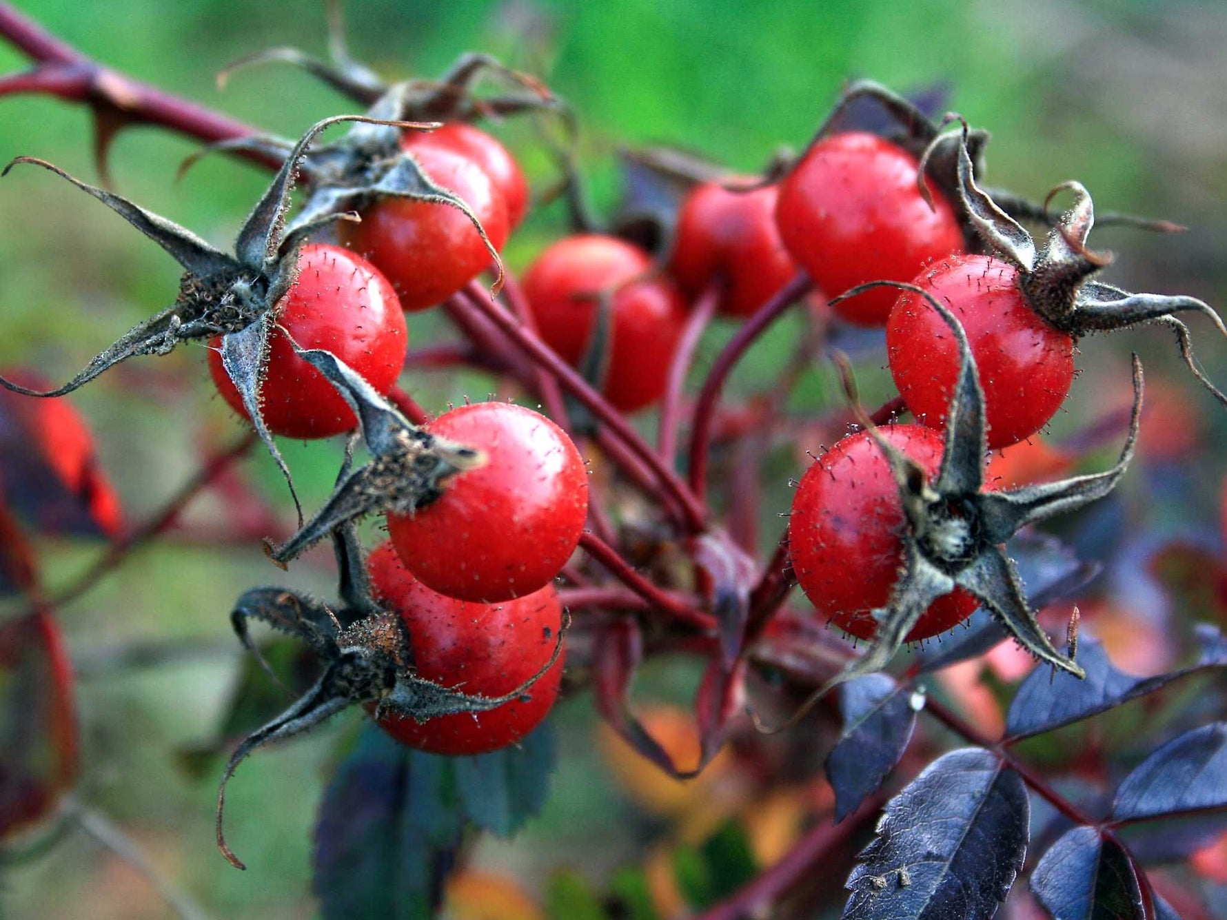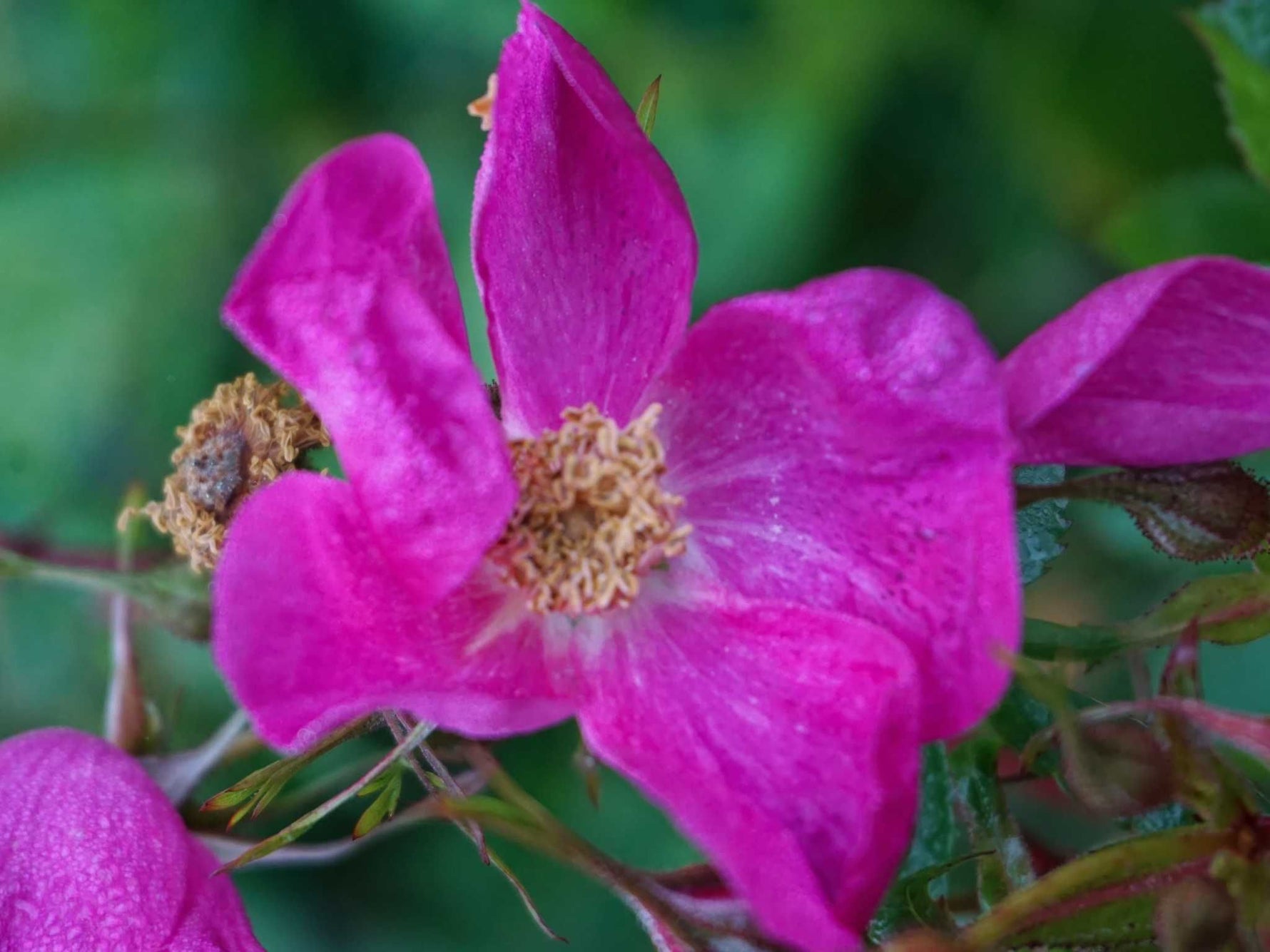 Die einfachen Blüten sind tiefrosa. Das Laub ist dunkelgrün, glänzend und feingliedrig. Die Triebe sind filigran, rötlich gefärbt und normal bestachelt. Eine Miniausgabe der Rosa virginiana, die durch ihren kompakten Wuchs vielseitig zu verwenden ist. Als ob sie ihre fehlende Wuchshöhe damit ausgleichen wollte, ist sie in allem schöner: mehr Blüten, mehr Hagebutten, schönere Herbstfärbung und ein perfekt buschiger Wuchs. Zu alledem blüht sie manchmal noch im Sommer nach, während sie schon Hagebutten trägt.