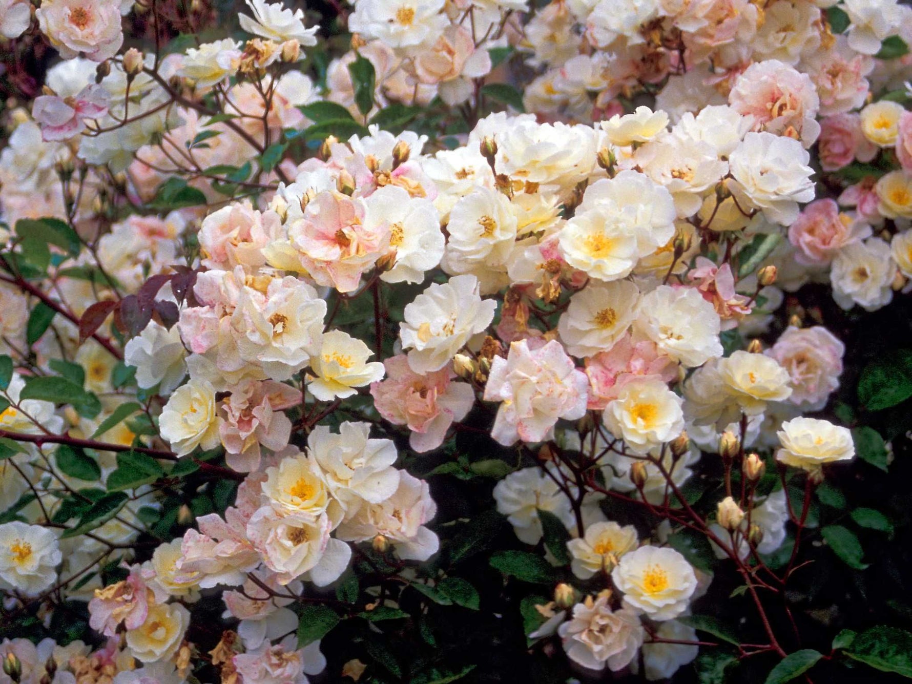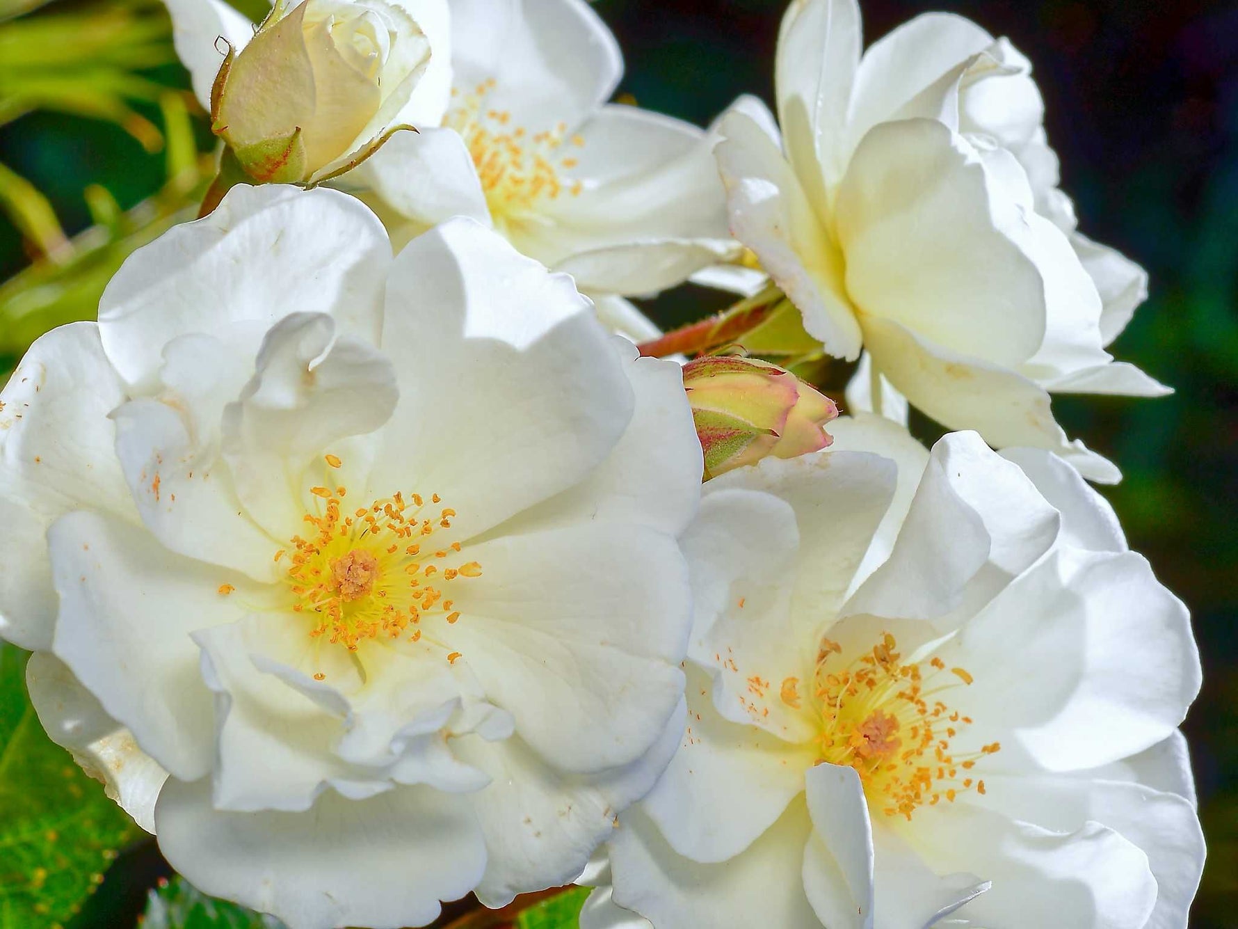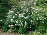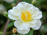 Die kleinen, leicht gefüllten Blüten in cremeweiß mit gelben Staubgefäßen blühen in Dolden und duften gut. Buschig überhängender Wuchs bis 200 cm Höhe. Robuste historische Strauchrose. Bildet Hagebutten, insektenfreundlich und für Kübel geeignet