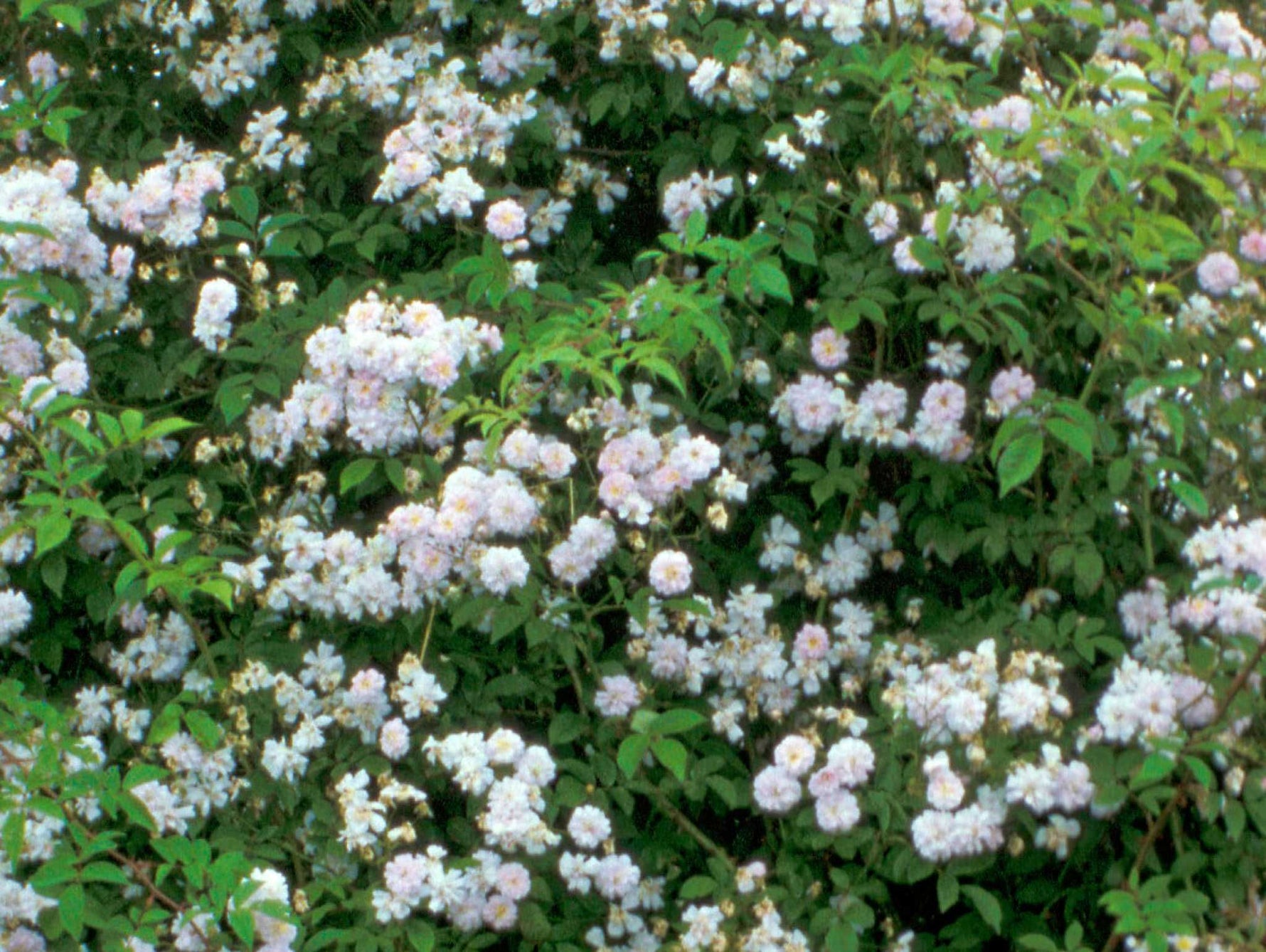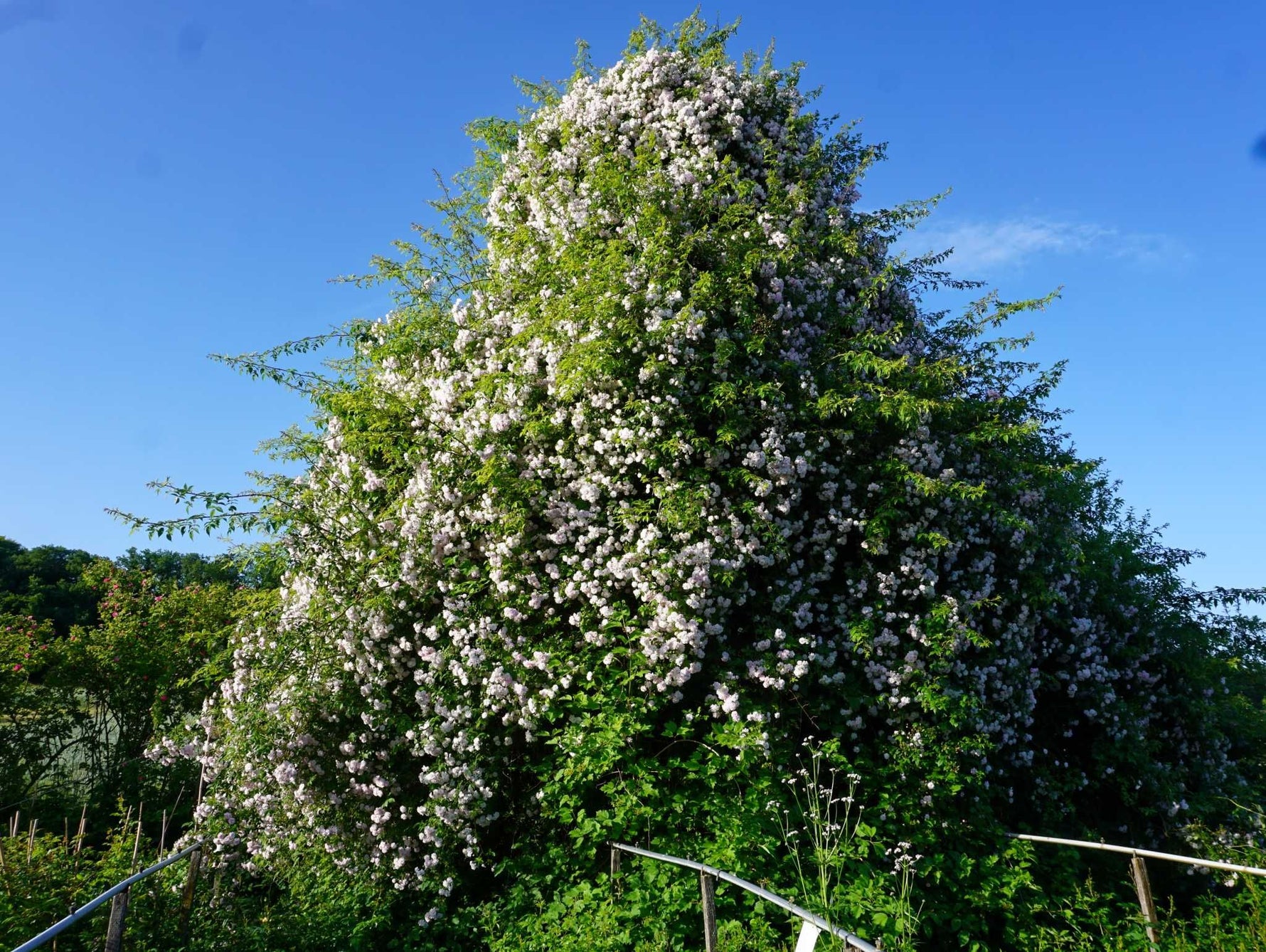 Die sehr kleinen, duftenden, rosettenförmig gefüllten Blüten erscheinen in unglaublichen Mengen. Das Laub ist klein und mattgrün, die Triebe sind filigran, immens starkwüchsig und normal bestachelt. Eine der wuchsstärksten Rosen, die wir kennen: 6 Meter lange einjährige Triebe sind hier nicht die Ausnahme, sondern die Regel. Kann durch ihren unbändigen Wuchs in kürzester Zeit Dornröschenstimmung erzeugen. Die leider nur kurz anhaltende Blüte überwältigt immer wieder in ihrer Üppigkeit.