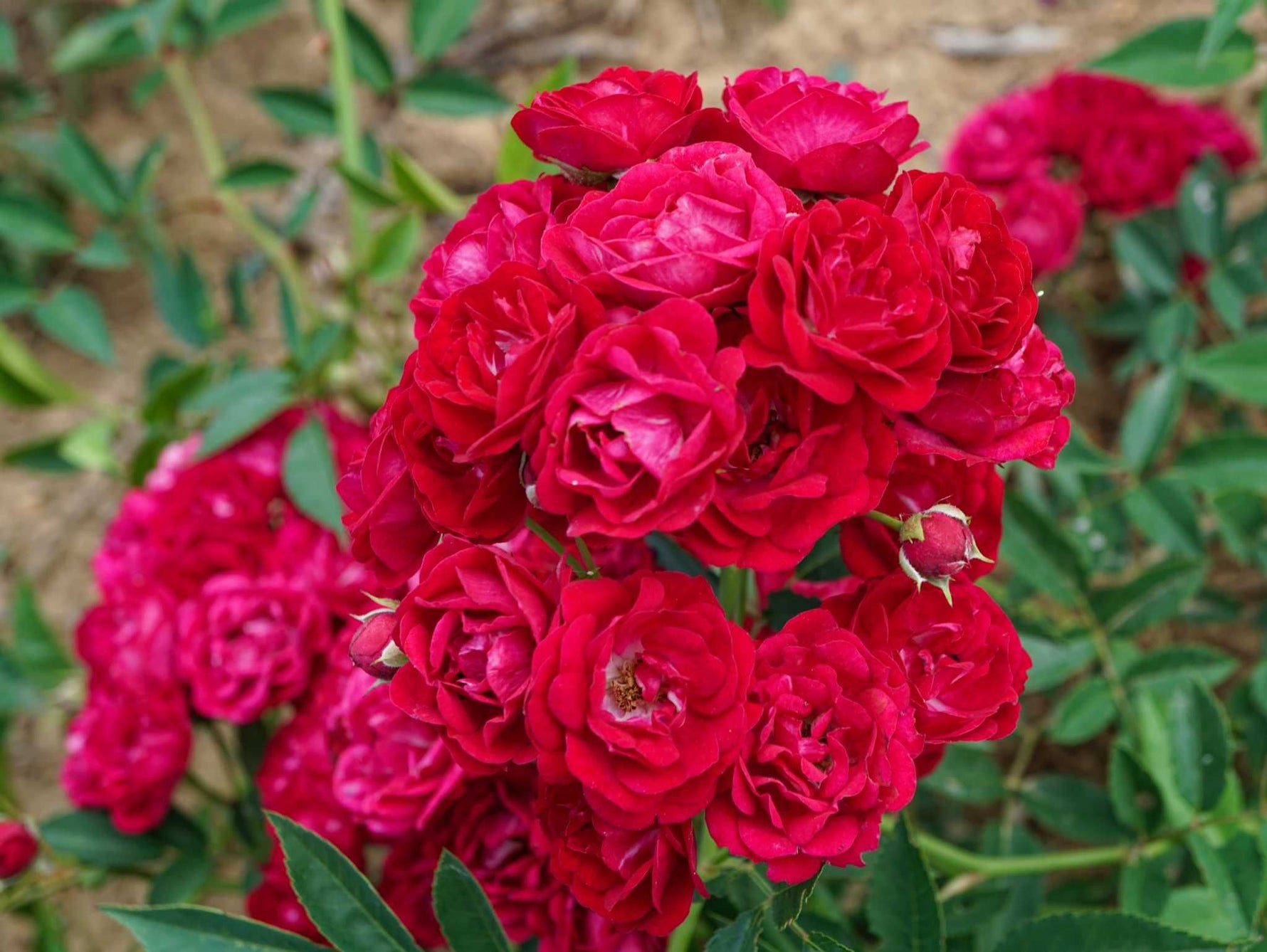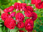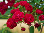 Die kleinen halb gefüllten Blüten in weinrot duften gut und bilden traubenartige Dolden. Kräftiger, überhängender Wuchs bis 350 cm Höhe. Robuste Ramblerrose. Bildet kleine Hagebutten, zum Beranken von Bäumen und Rosenbögen, kübelgeeignet, Insektenmagnet