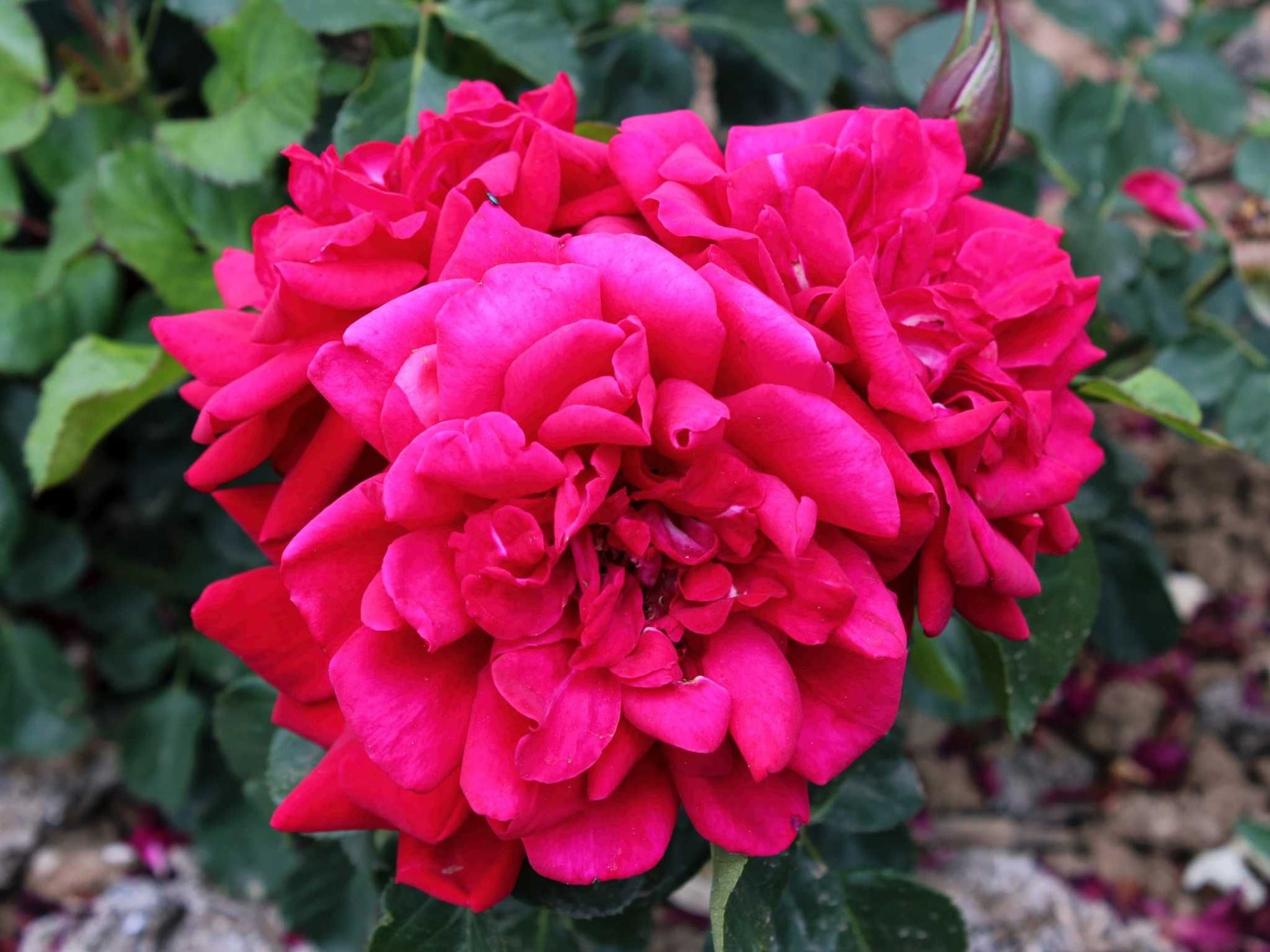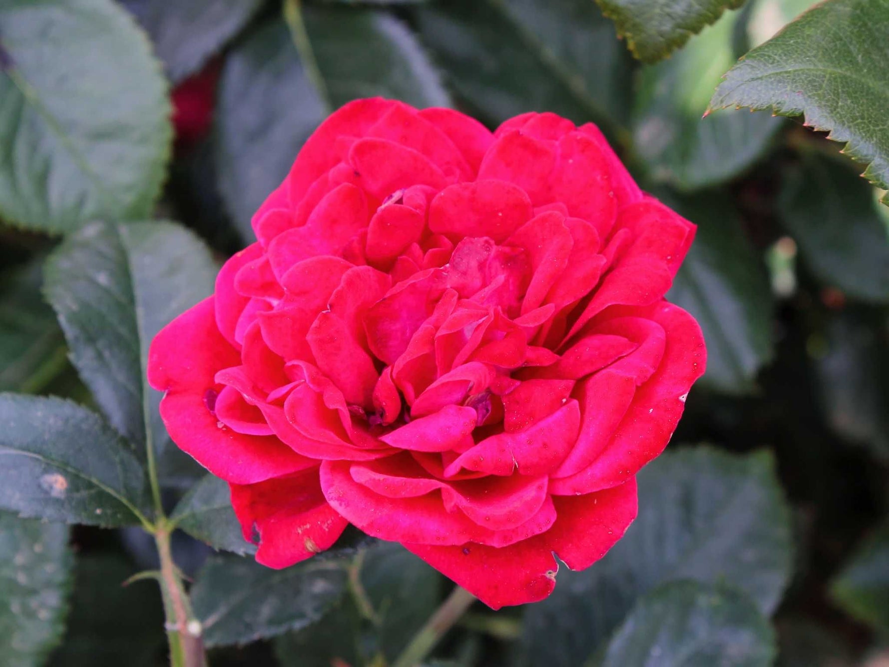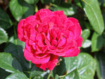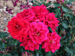 Die großen gefüllten Blüten in rot duften zart. Buschiger Wuchs bis 80 cm Höhe. Robuste Beetrose.