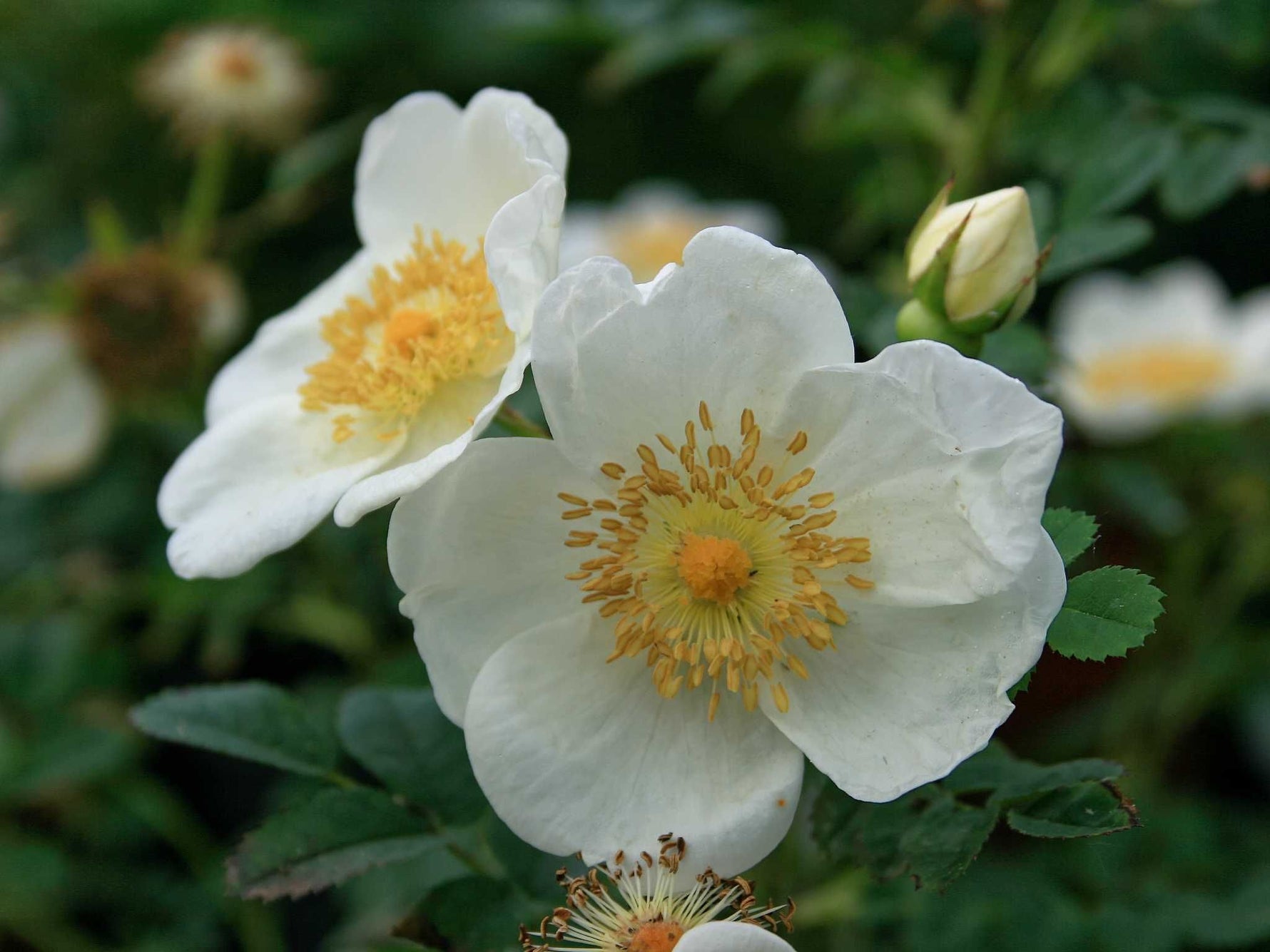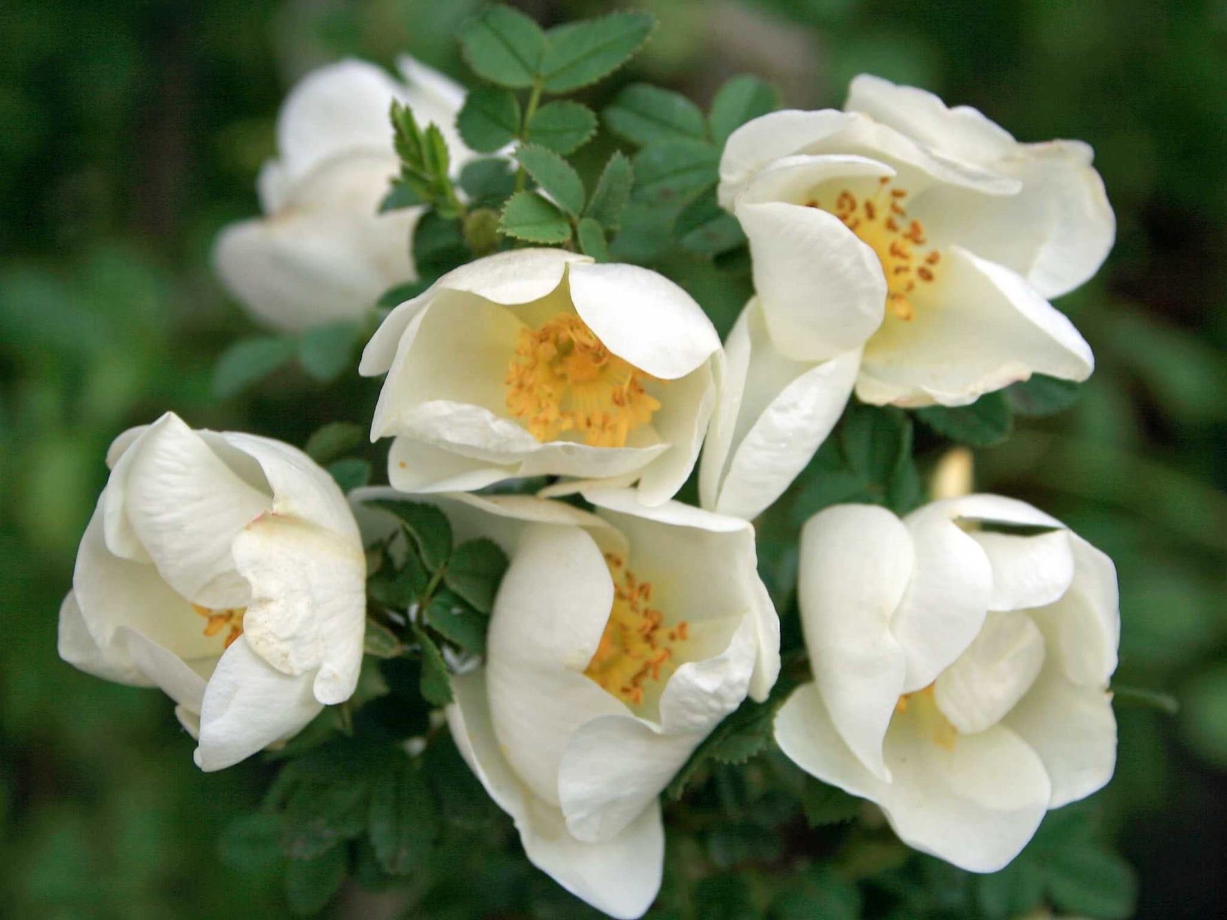 Die Dünenrose, Bibernellrose. Die einfachen, cremeweißen Blüten erscheinen sehr früh schon im Mai. Das Laub ist fein gesägt, filigran und graugrün. Die Triebe sind braun, aufrecht und dicht und fein bestachelt. Diese vornehmlich in Küstengegenden und im rauhen Schottlland und an der Nordsee beheimatete Wildrose bildet Ausläufer, gedeiht hervorragend auf Sandböden, ist salzverträglich, sehr frosthart und trockenheitsresistent. Sie bildet im Spätsommer eine rote Herbstfärbung aus und macht viele schwarze Hagebutten. Diese Wildform ist die Urmutter vieler frühblühender Gartenformen.