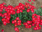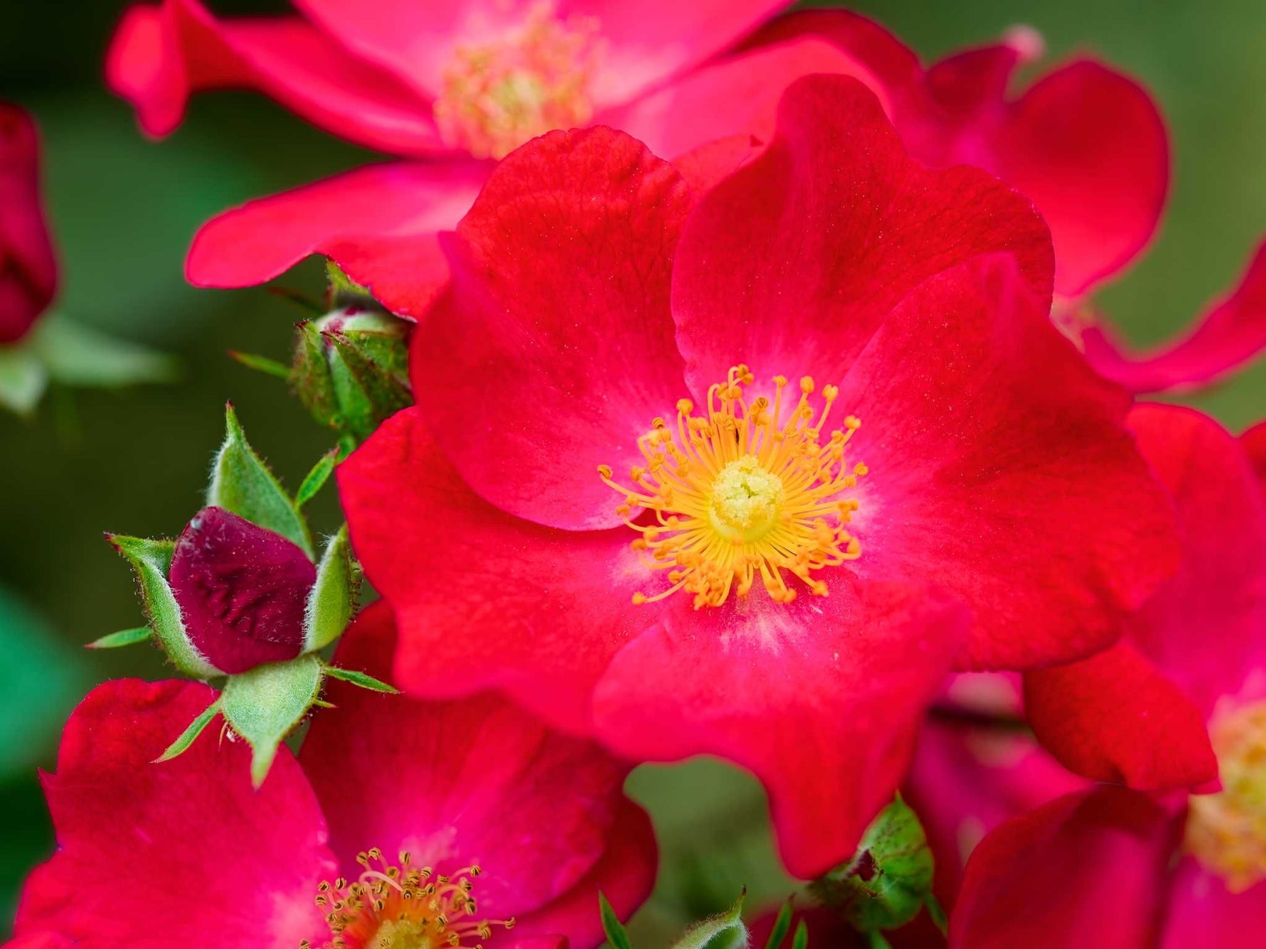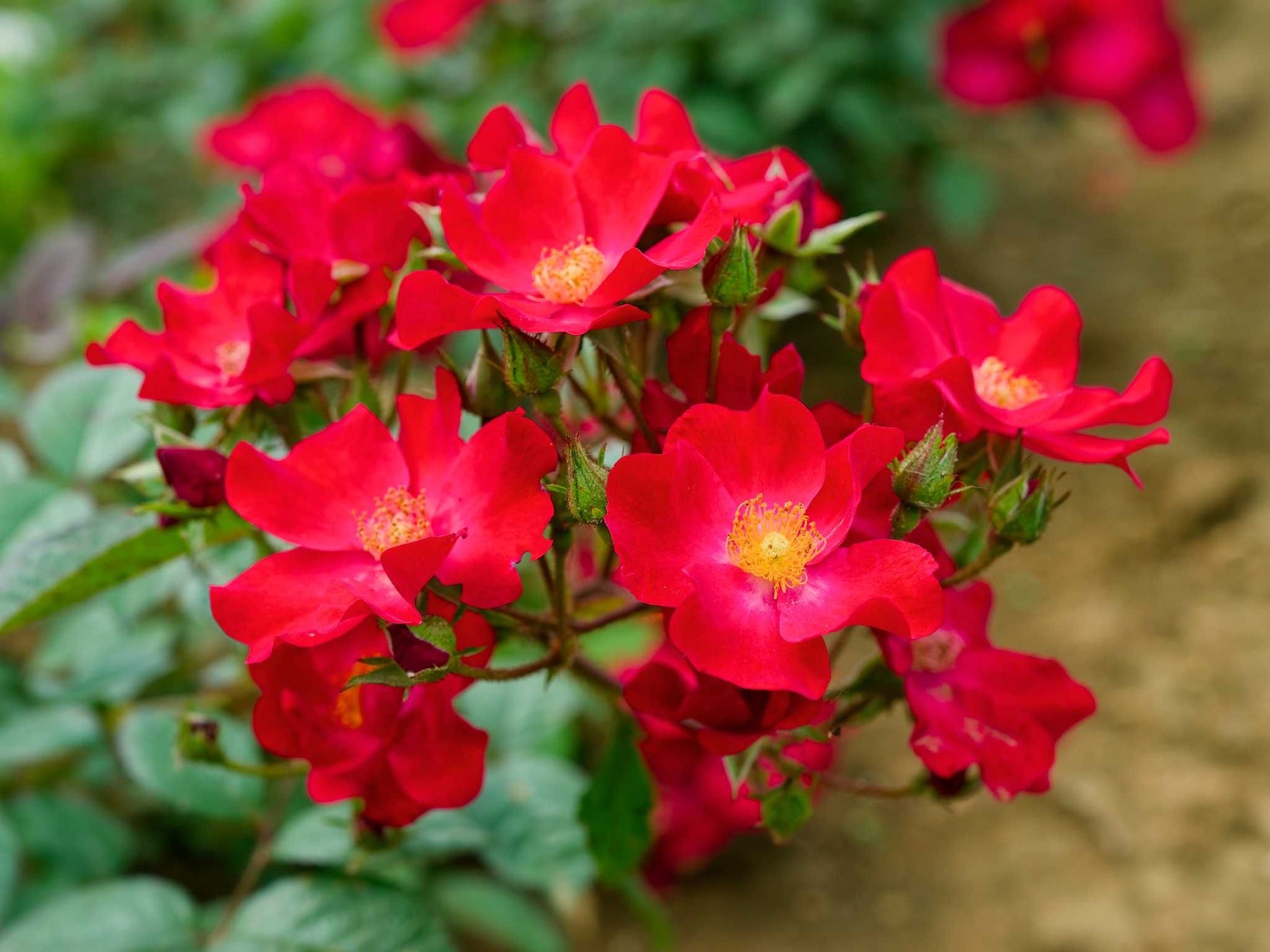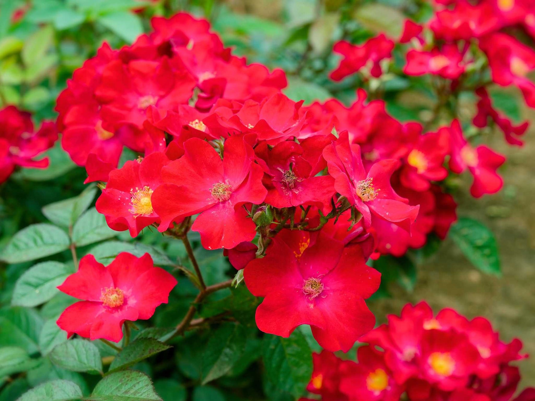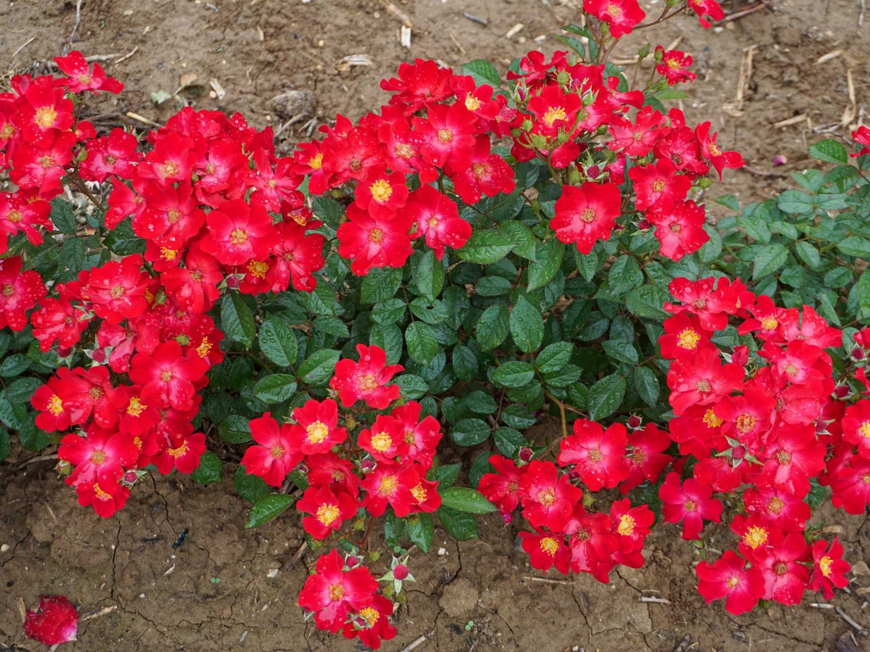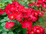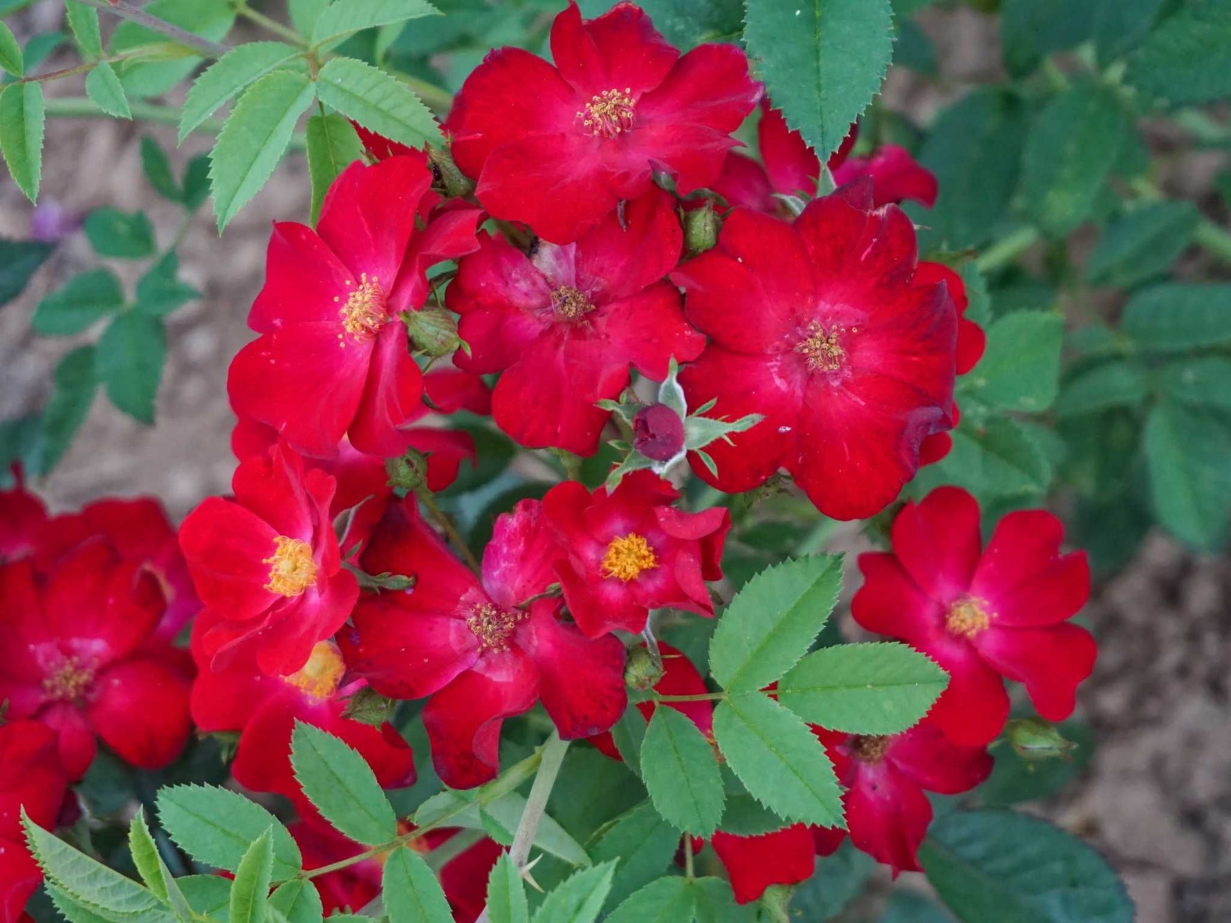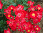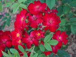 Die kleinen, einfachen Blüten in mohnrot blühen in Dolden. Buschig kompakter Wuchs bis 120 cm Höhe. Robuste historische Strauchrose. Bildet Hagebutten, insektenfreundlich und für Kübel geeignet