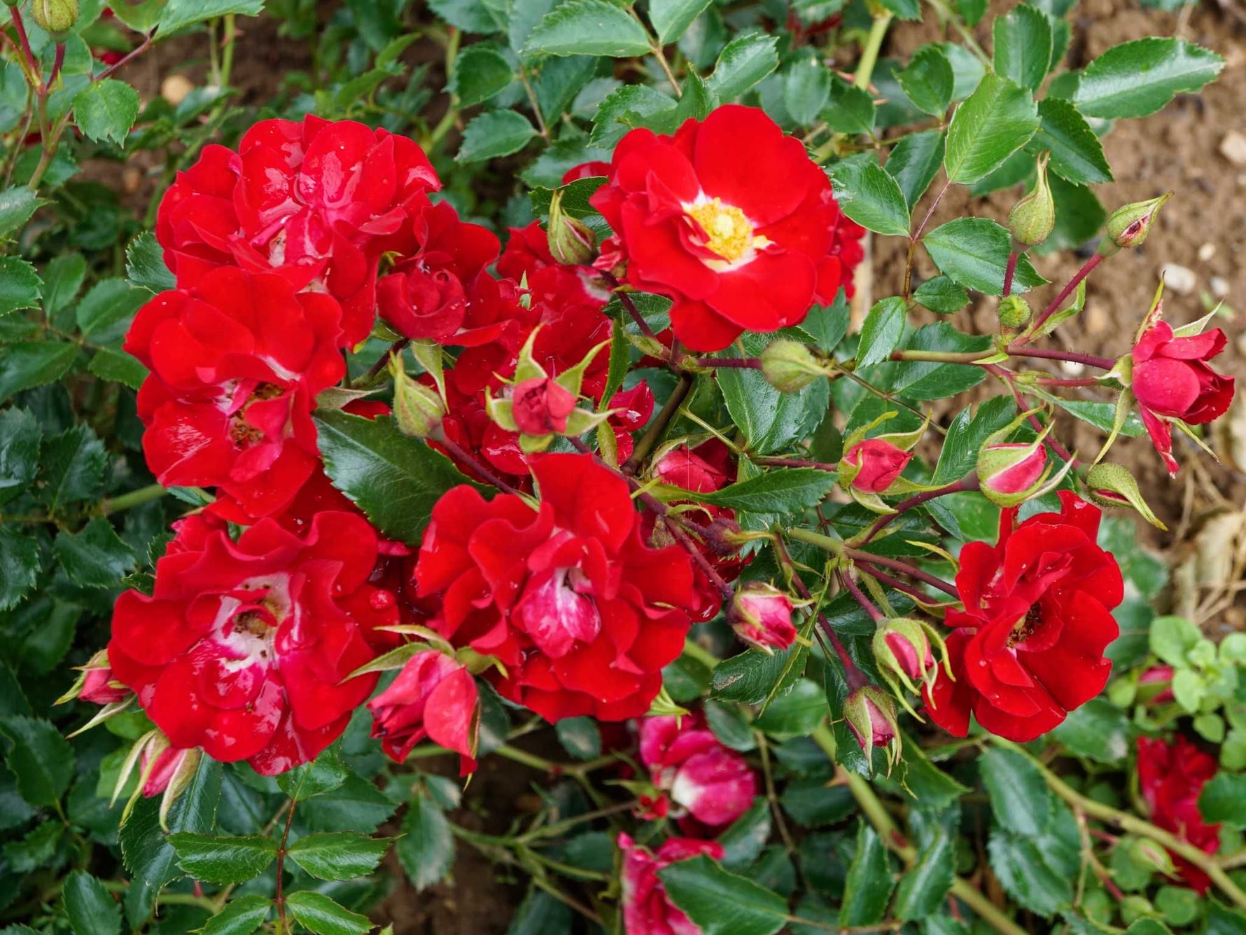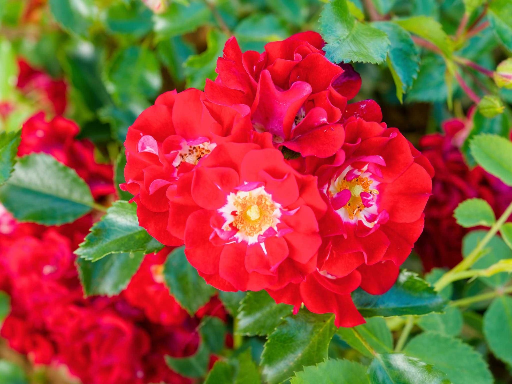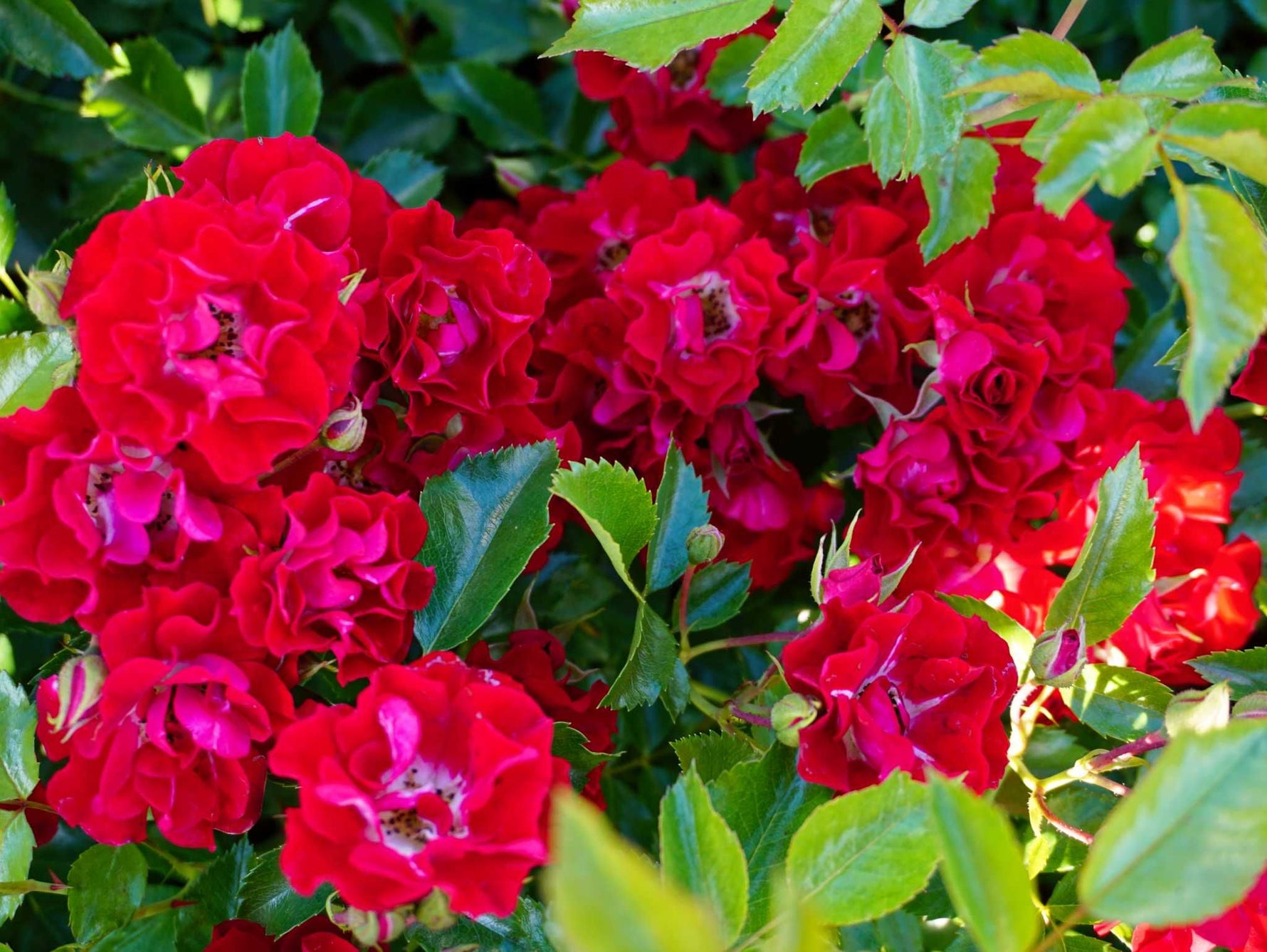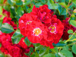 Die kleinen halb gefüllten Blüten rot mit hellem Auge duften zart und bilden Dolden. Kräftiger, überhängender Wuchs bis 350 cm Höhe. Sehr robuste Ramblerrose. Bildet kleine Hagebutten, zum Beranken von Bäumen und Rosenbögen, kübelgeeignet, insektenfreundlich