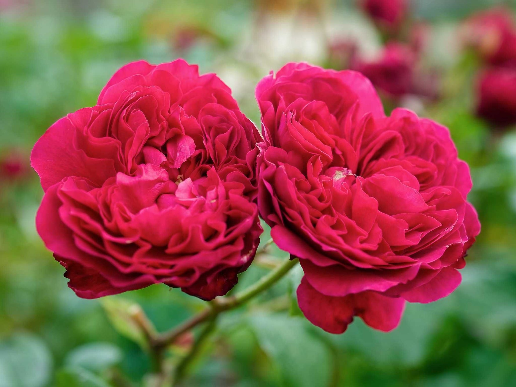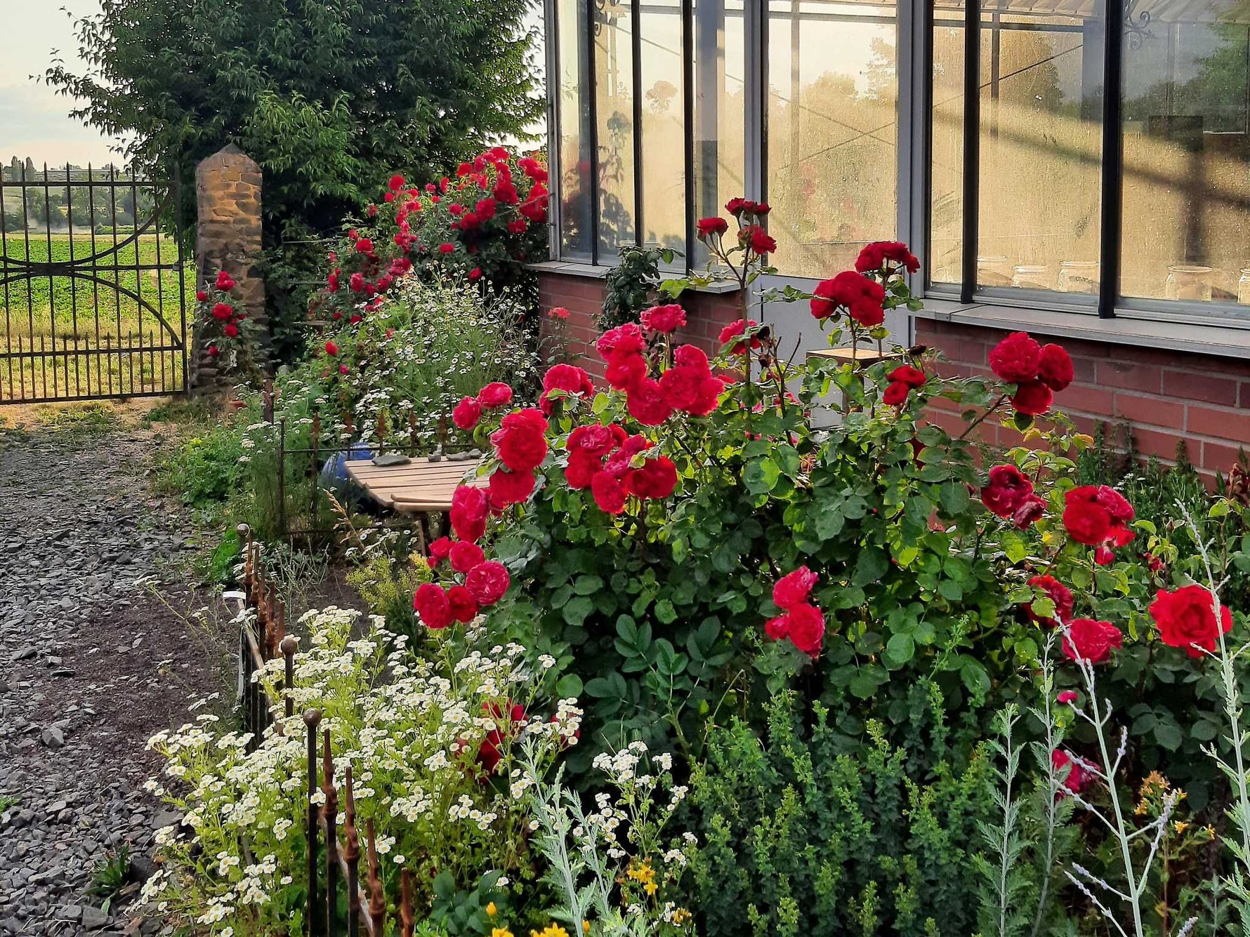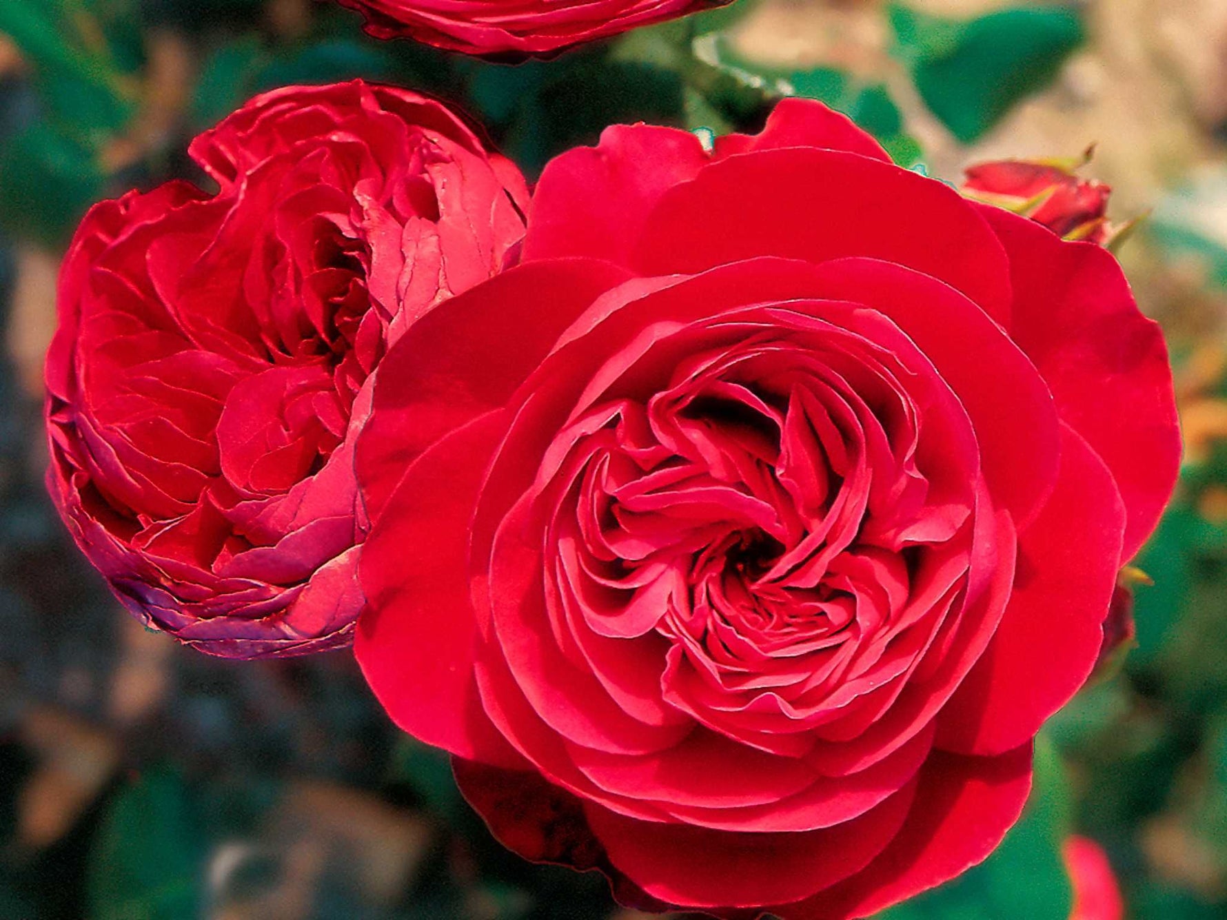 Die dichtgefüllten, geviertelten Blüten in rot blühen in Dolden. Breitbuschiger Wuchs bis 80 cm Höhe. Robuste Beetrose. Für Kübel geeignet