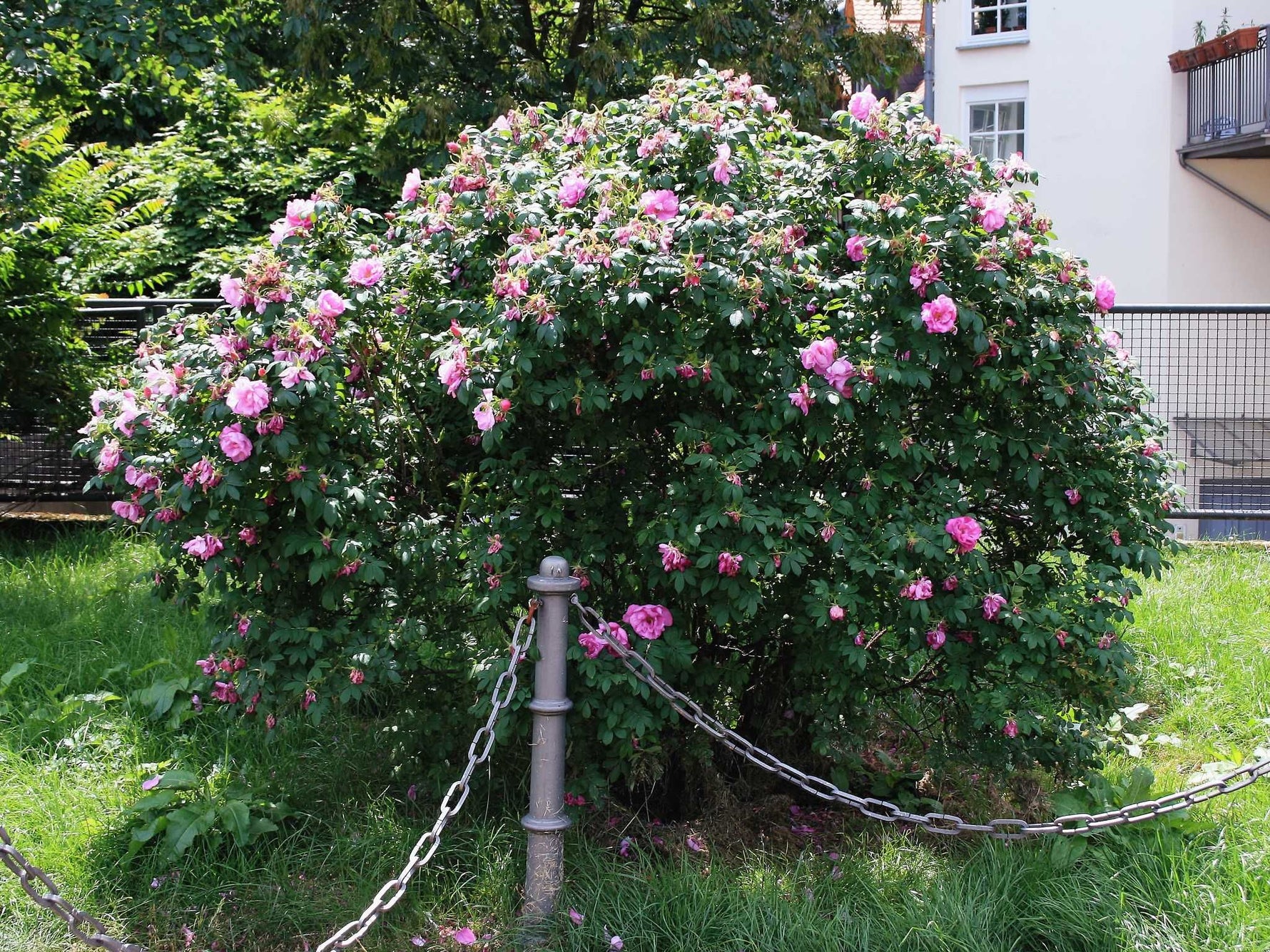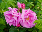 Die halb gefüllten, großen Blüten in rosa duften sehr stark. Kräftiger, buschiger Wuchs bis 120 cm. Sehr robuste Sorte. Sehr frostbeständig, zur Blütenernte geeignet, bildet große runde Hagebutten.