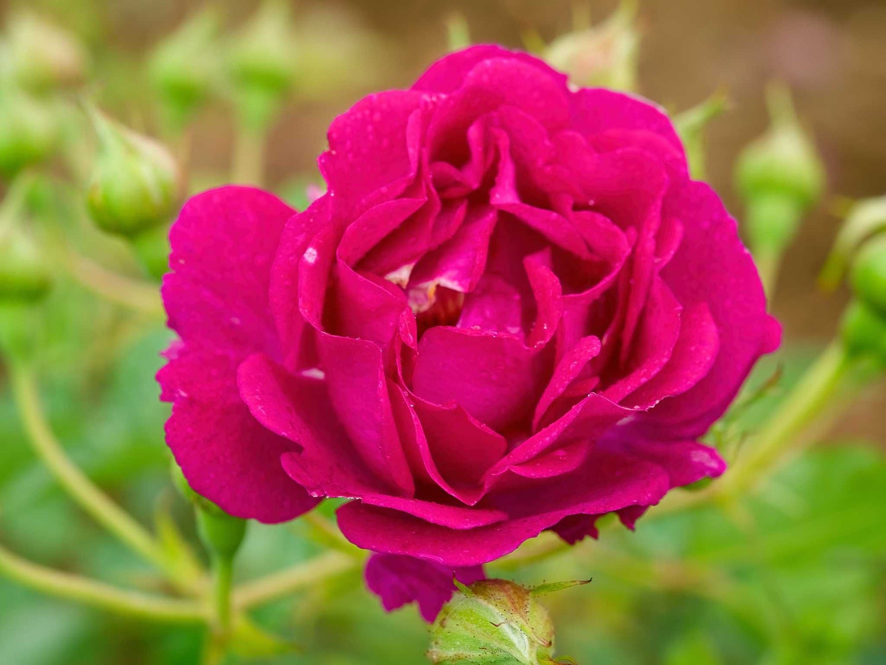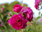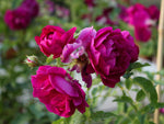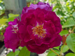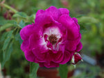 Die mittelgroßen halbgefüllten Blüten in violett duften gut und blühen in Dolden. Buschig kompakter Wuchs bis 250 cm Höhe. Robuste Kletterrose. Insektenfreundlich, gut für Rosenbögen und Kübel geeignet