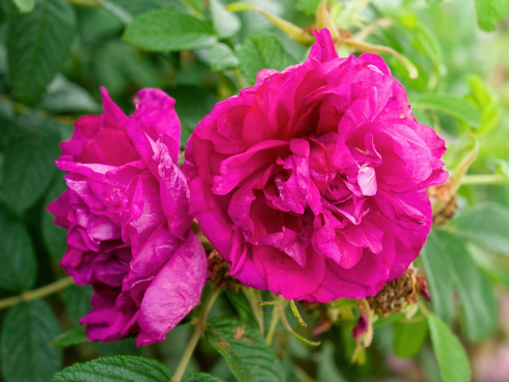Typische rugosa-Hybride. Die violettroten Blüten sind gut gefüllt, mittelgroß, etwas hängend und extrem stark duftend. Sie ist sehr gut als Rose für die Küche geeignet. Das Laub ist tiefgefurcht und immun gegen Sternrußtau. Absolut frosthart. Die Triebe sind braun und dicht besetzt mit feinen Stacheln. Bildet keine Hagebutten, daher blüht sie noch bis in den Herbst hinein. Eine herausragende Sorte, die man nur empfehlen kann. Wird manchmal verwechselt mit Hansa. Der Hauptunterschied: Roseraie bildet definitiv keine Hagebutten und bleibt etwas kleiner.