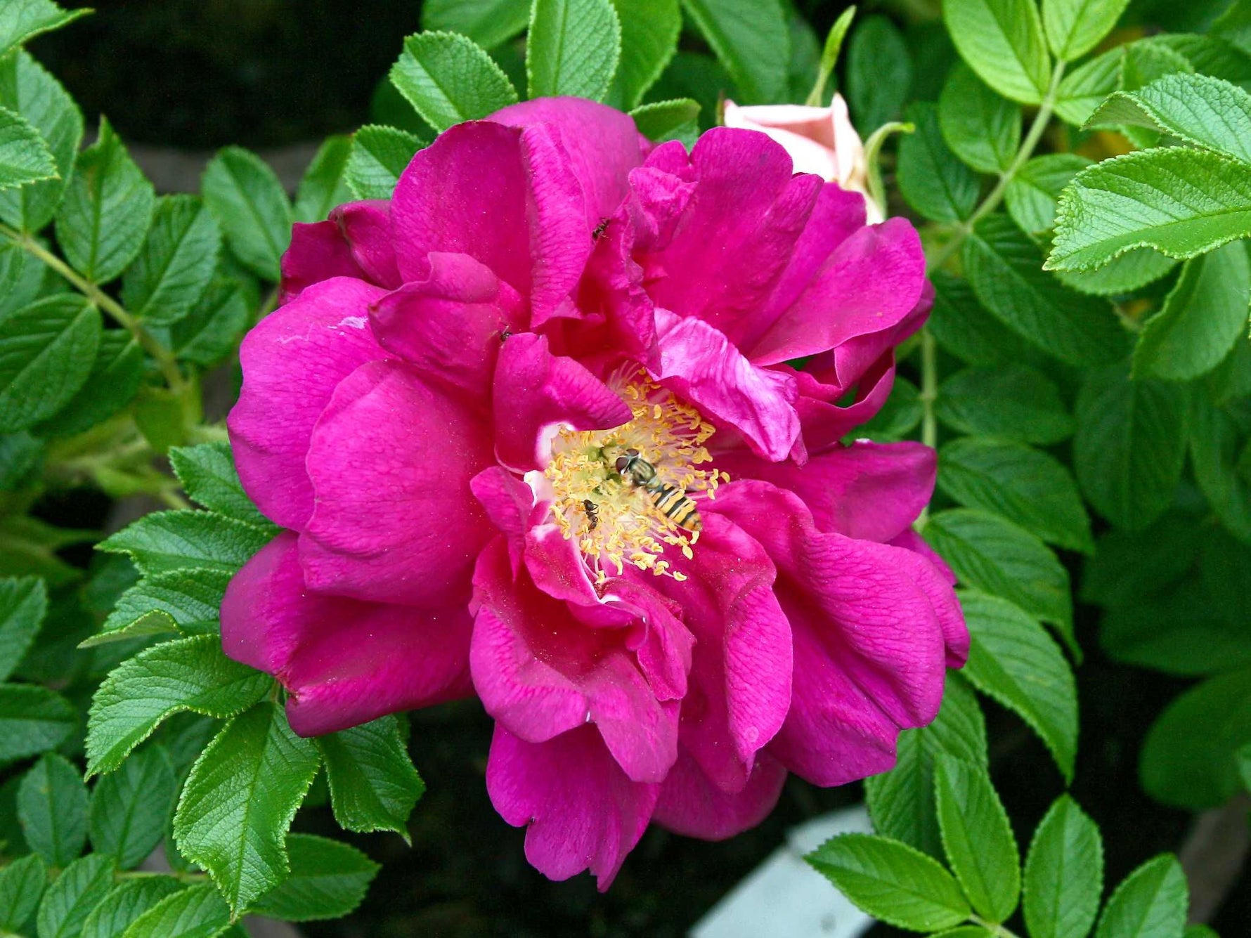 Die halb gefüllten, großen Blüten in rosarot duften sehr stark. Kräftiger, buschiger Wuchs bis 120 cm. Sehr robuste Sorte. Sehr frostbeständig, zur Blütenernte geeignet, bildet große runde Hagebutten, Insektenmagnet.