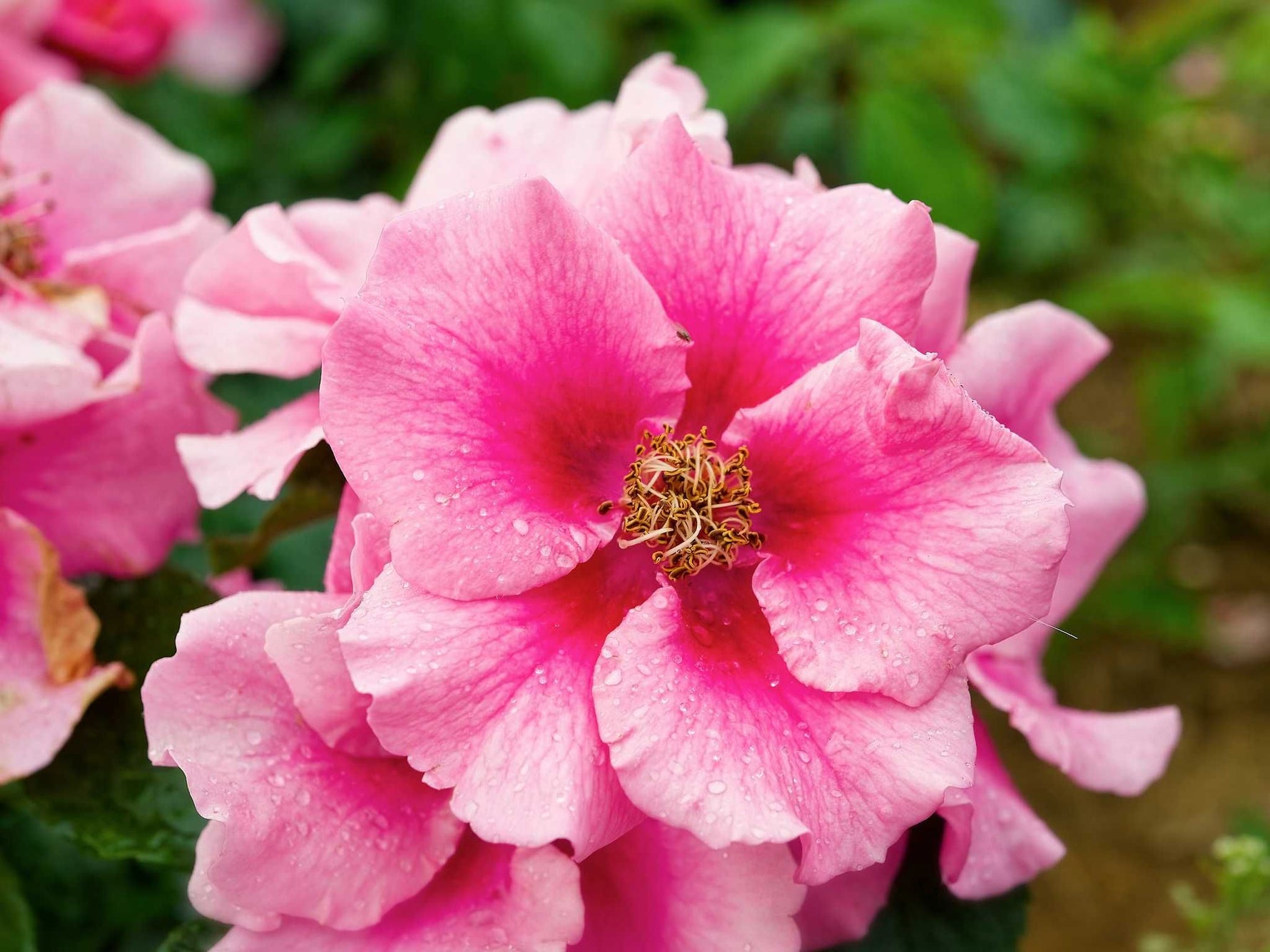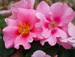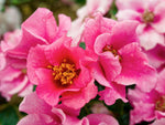 Die einfachen Blüten in rosa mit pinkfarbenenm Auge blühen in Dolden. Buschiger Wuchs bis 80 cm Höhe. Robuste Beetrose. Insektenfreundlich, für heiße Lagen und Kübel geeignet