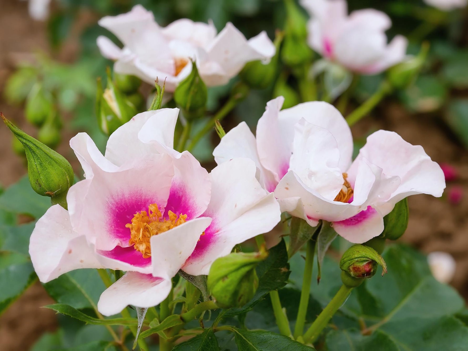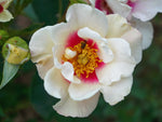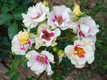 Die einfachen Blüten in cremeweiß mit purpurfarbenem Auge blühen in Dolden und duften zart. Buschiger Wuchs bis 70 cm Höhe. Robuste Beetrose, insektenfreundlich.