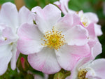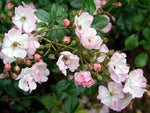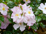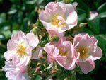 Die kleinen, einfachen Blüten in zartrosa blühen in Dolden und duften gut. Buschiger Wuchs bis 60 cm Höhe. Robuste Bodendeckerrose. Zur flächigen Pflanzung und für Kübel geeignet, insektenfreundlich, bildet kleine Hagebutten