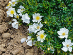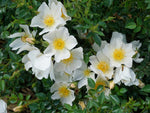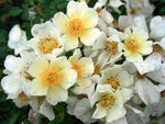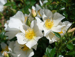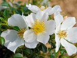 Die einfachen Blüten in weiß mit gelber Mitte blühen in Dolden. Niedriger, buschiger Wuchs bis 30 cm Höhe. Robuste Bodendeckerrose. Zur flächigen Pflanzung, für Steingarten und für Kübel geeignet, insektenfreundlich, bildet Hagebutten