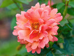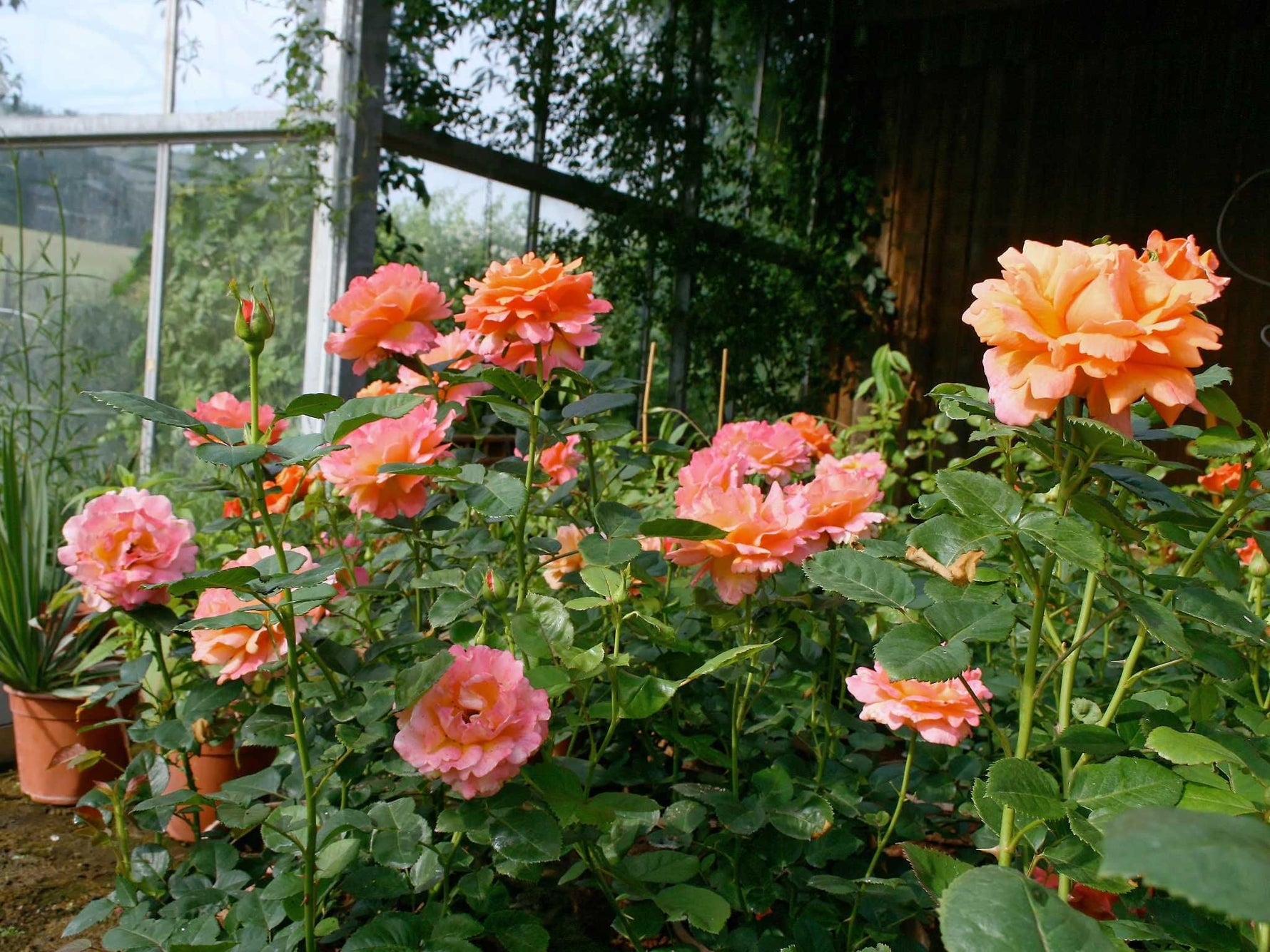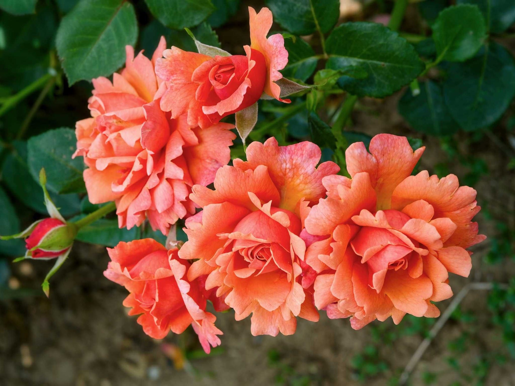 Die gefüllten Blüten in orange blühen in Dolden und duften gut. Buschiger Wuchs bis 80 cm Höhe. Robuste Beetrose. Insektenfreundlich, für Kübel geeignet