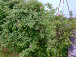Die Filzrose. Die einfachen, zart duftenden Blüten stehen in Dolden. Das Laub ist graugrün und filzartig behaart. Die Triebe sind kräftig, wachsen breitbuschig und sind gut bestachelt. Ein sehr schöner Strauch mit malerischem, breitem Wuchs und einem sehr guten Hagebuttenansatz im Herbst. Das flaumig behaarte Laub macht den Strauch auch im Sommer attraktiv.