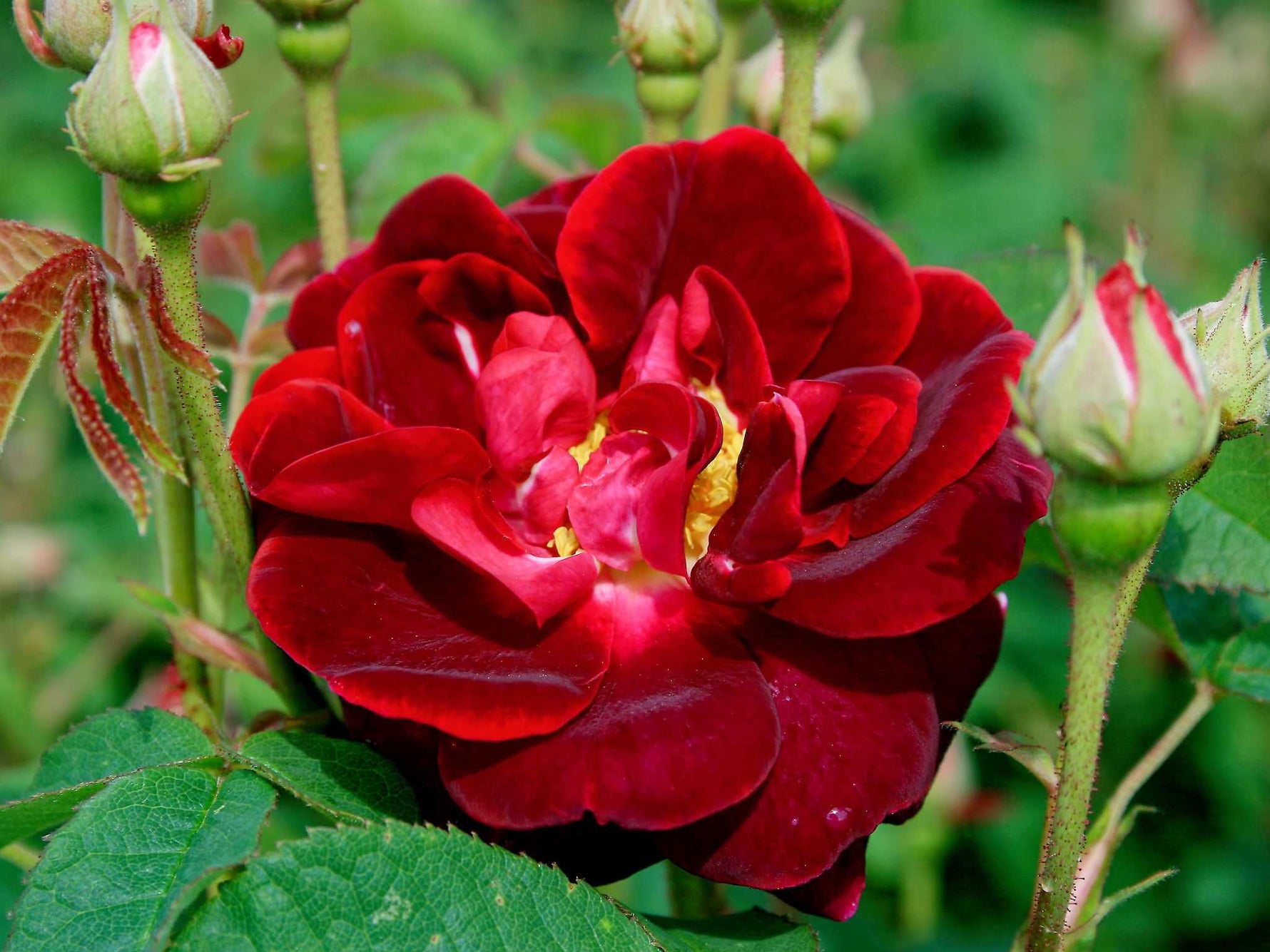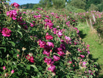 Die halbgefüllten Blüten in samtigem dunkelrot duften gut. Einmalblühend. Buschig aufrechter Wuchs bis 160 cm Höhe. Sehr robuste historische Strauchrose. Zur Rosenblütenernte, insektenfreundlich und für Hecken geeignet