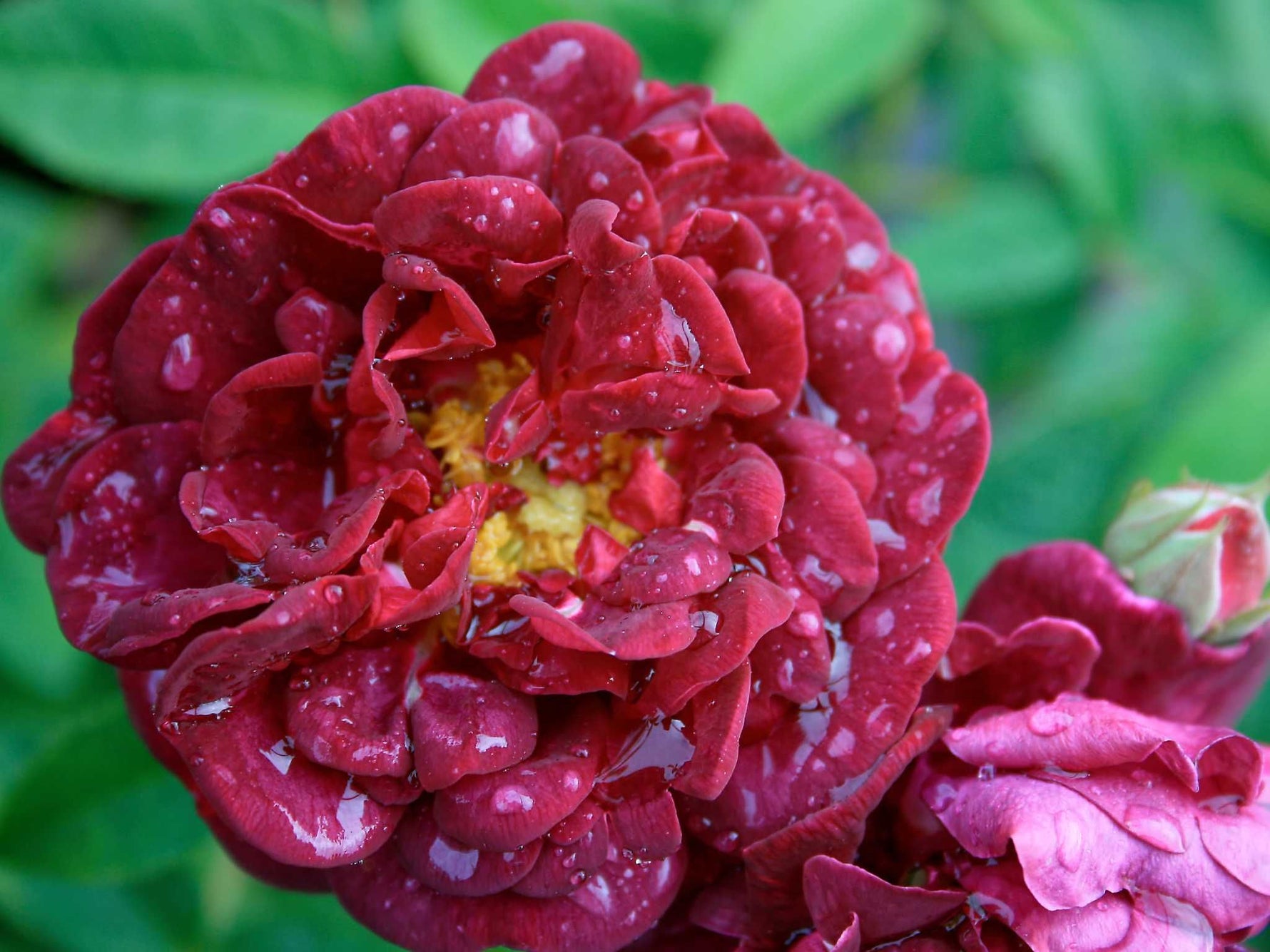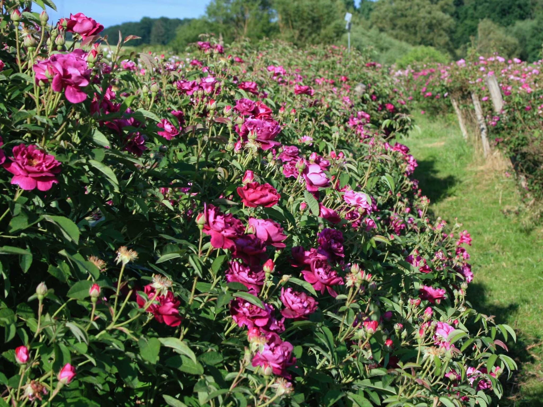 Die halbgefüllten, mittelgroßen Blüten duften gut und sind tatsächlich wie Samt und haben goldgelbe Staubgefäße. 'Tuscany' ist sehr gut in der Küche verwendbar. die halbgeöffneten Blüten sind wunderbar als Tortendekoration. Perfekter kann auch eine gefülltere Blüte nicht aussehen. Die Blüten erscheinen in schier unglaublichen Mengen an dem üppigen Strauch, der das typische matt graugrüne gallica-Laub hat. Seine Triebe sind fein, sehr zahlreich und perfekt verzweigt. Sie sind nur mit wenigen harmlosen Stacheln besetzt.