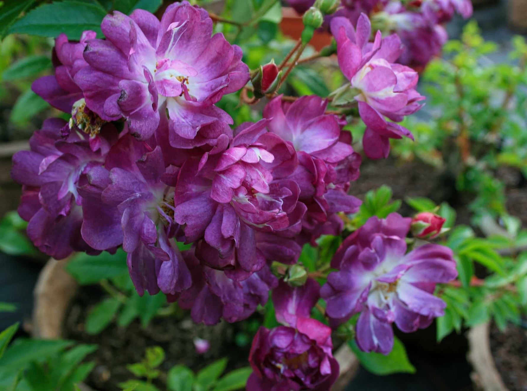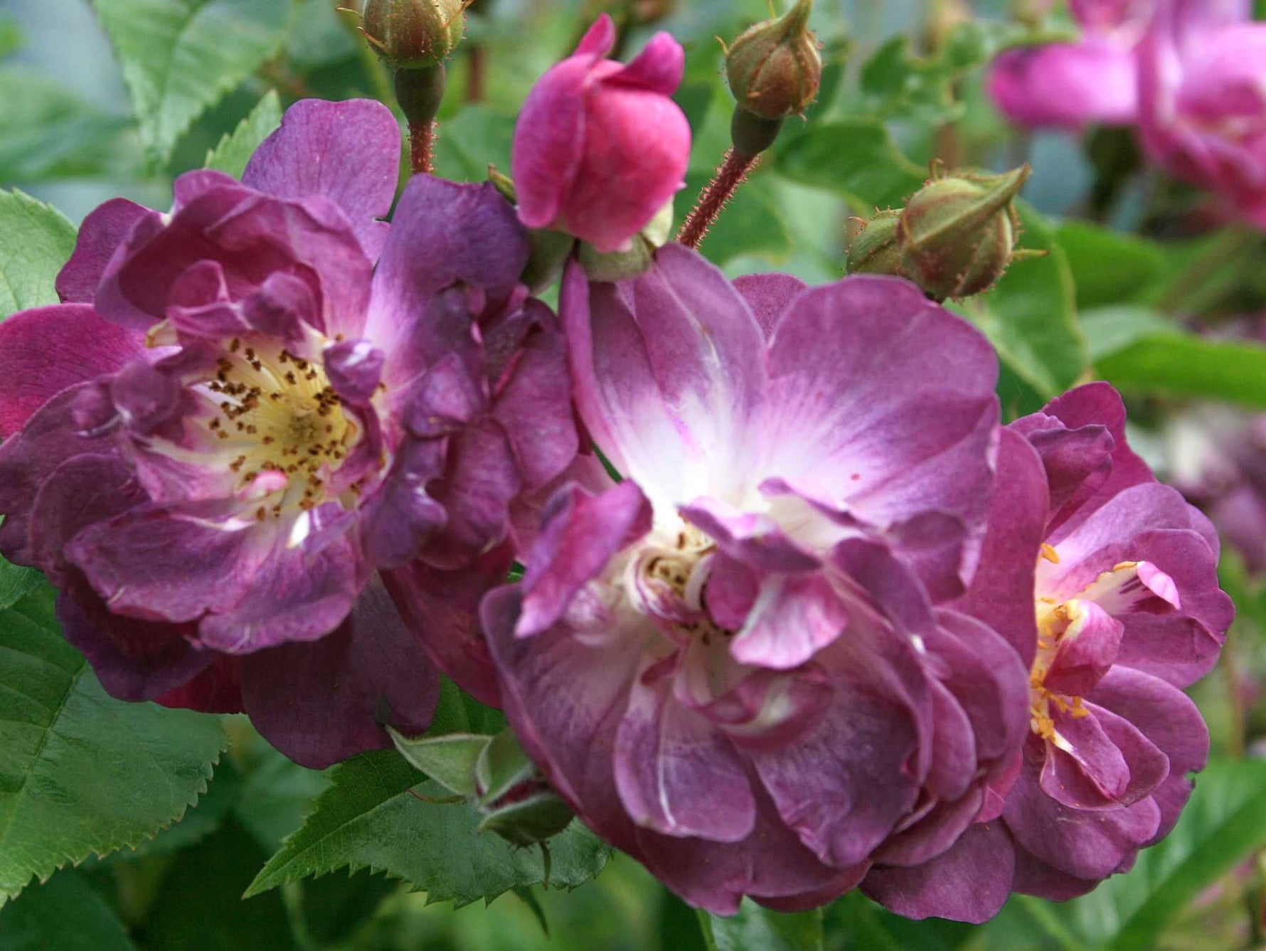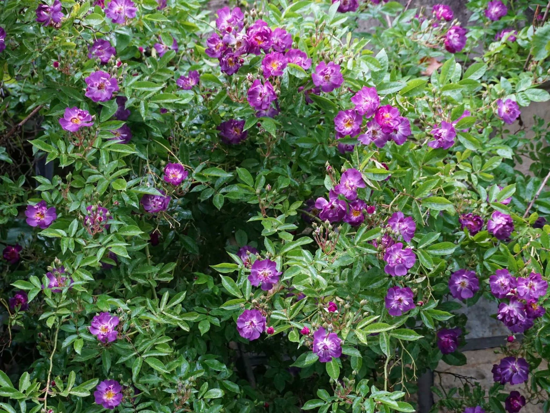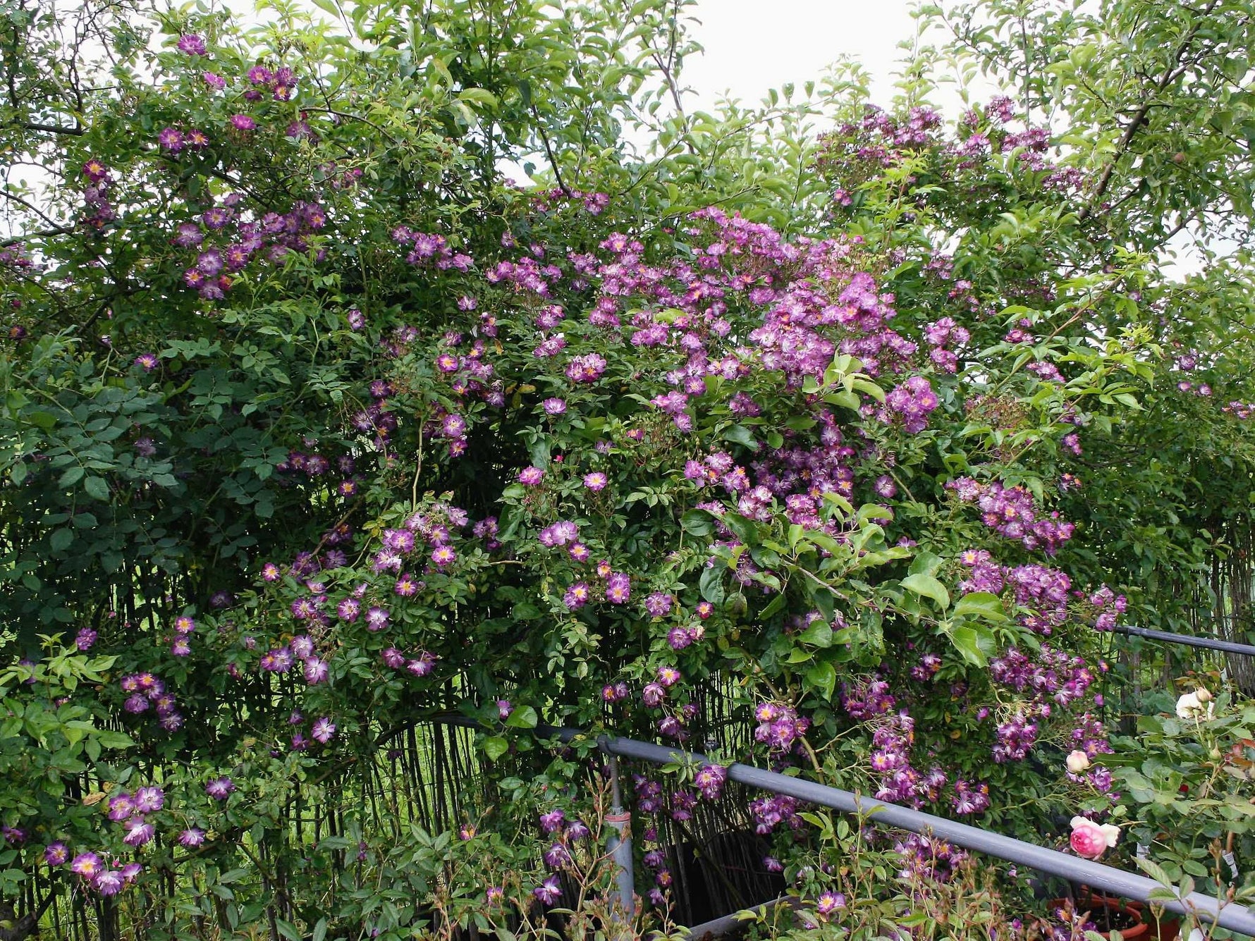 Die kleinen halb gefüllten Blüten in purpurviolett duften gut und bilden Dolden. Einmalblühend. Kräftiger, buschiger Wuchs bis 350 cm Höhe. Pflegeleichte Ramblerrose. Bildet kleine Hagebutten, zum Beranken von Bäumen, Insektenmagnet