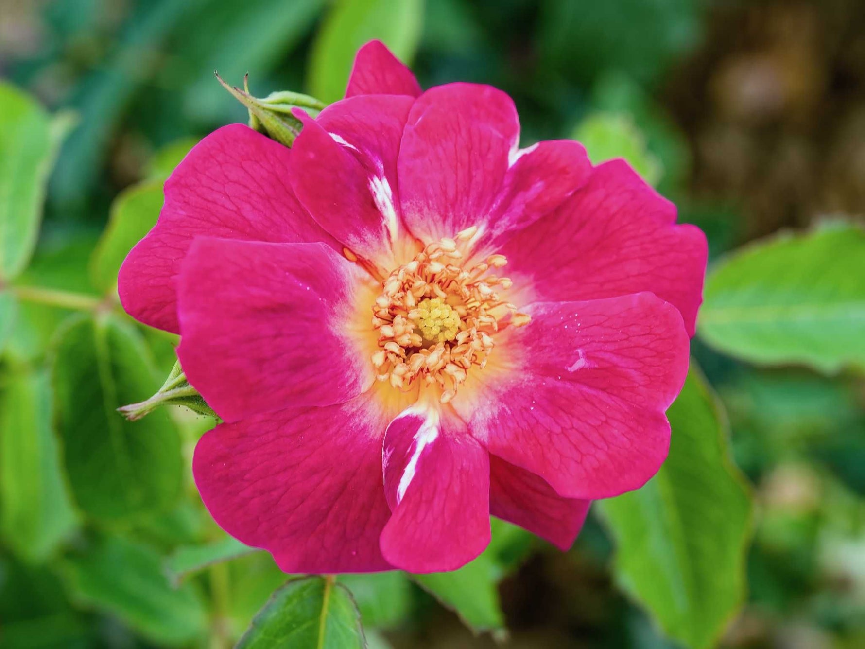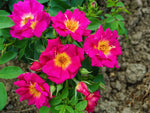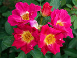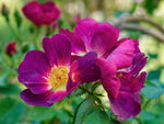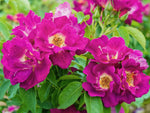 Die leicht gefüllten Blüten in purpurrrosa mit gelber Mitte blühen in Dolden. Buschiger Wuchs bis 120 cm Höhe. Robuste Strauchrose. Kübelgeeignet, gut hitzeverträglich, insektenfreundlich, heckentauglich