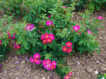 Die großen, fast einfachen Blütenschalen leuchten in einem unglaublich intensiven purpur-violett, das im Kontrast mit den goldgelben Staubgefäßen besonders gut zur Geltung kommt. Ein Farbspiel in den halboffenen Blüten mit der gelben Mitte, welches man sonst nur an kleinblumigen Rosen kennt erscheint hier an fast handgroßen Blüten. Das mattgrüne üppige Laub steht auf einem wunderschön runden und dichten Strauch. Gute Frosthärte und eine überaus gesunde Belaubung weist sie zusätzlich auf. Eine Rose, die man auch für kleine Hecken einsetzen kann. Die Rose putzt sich selbst, auch wenn man keine verblühten entfernt blüht sie gut nach.